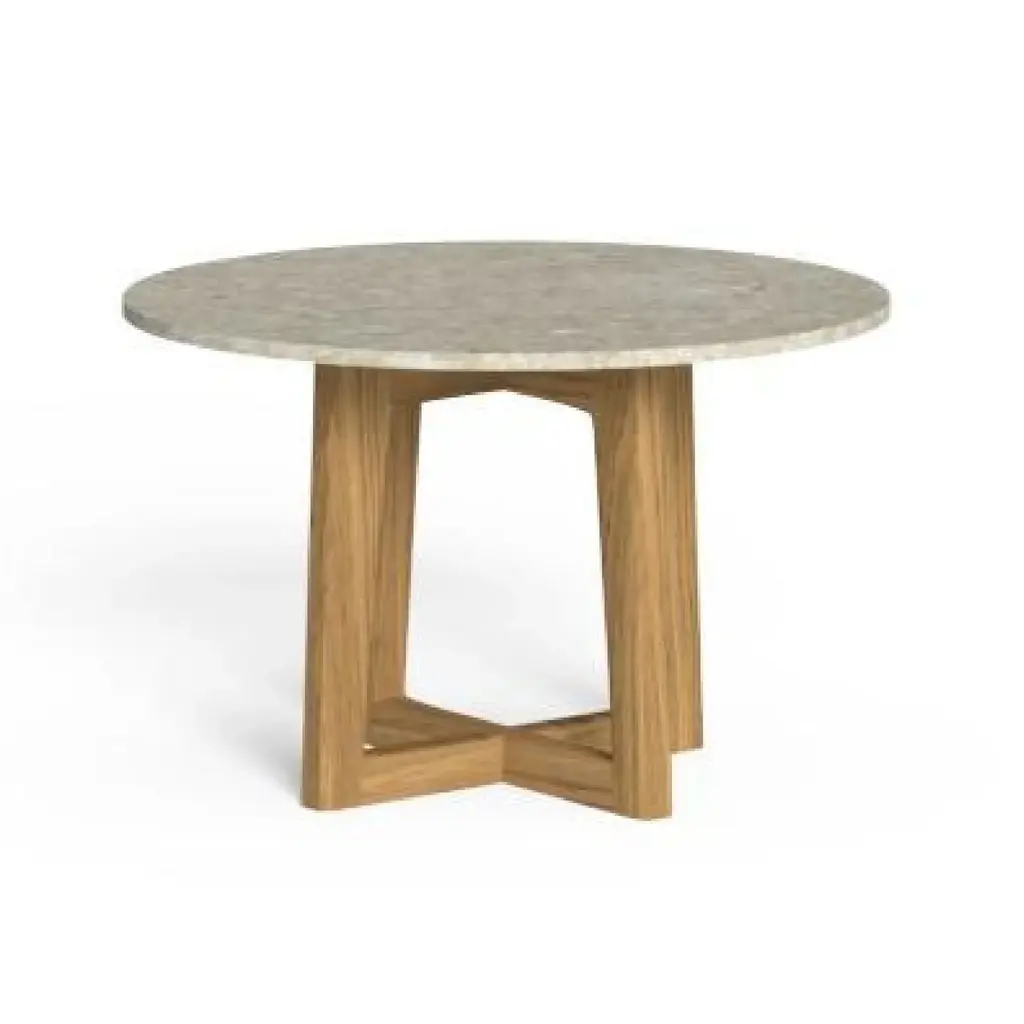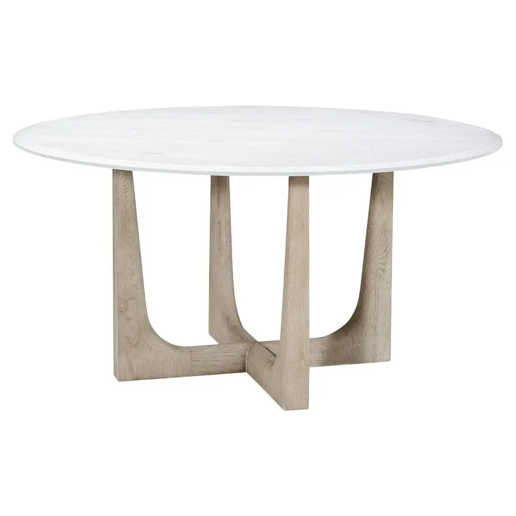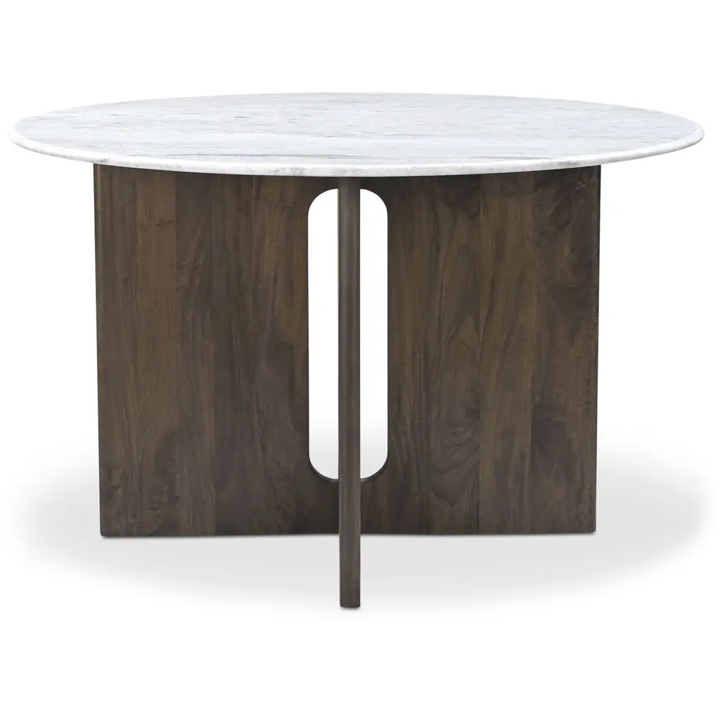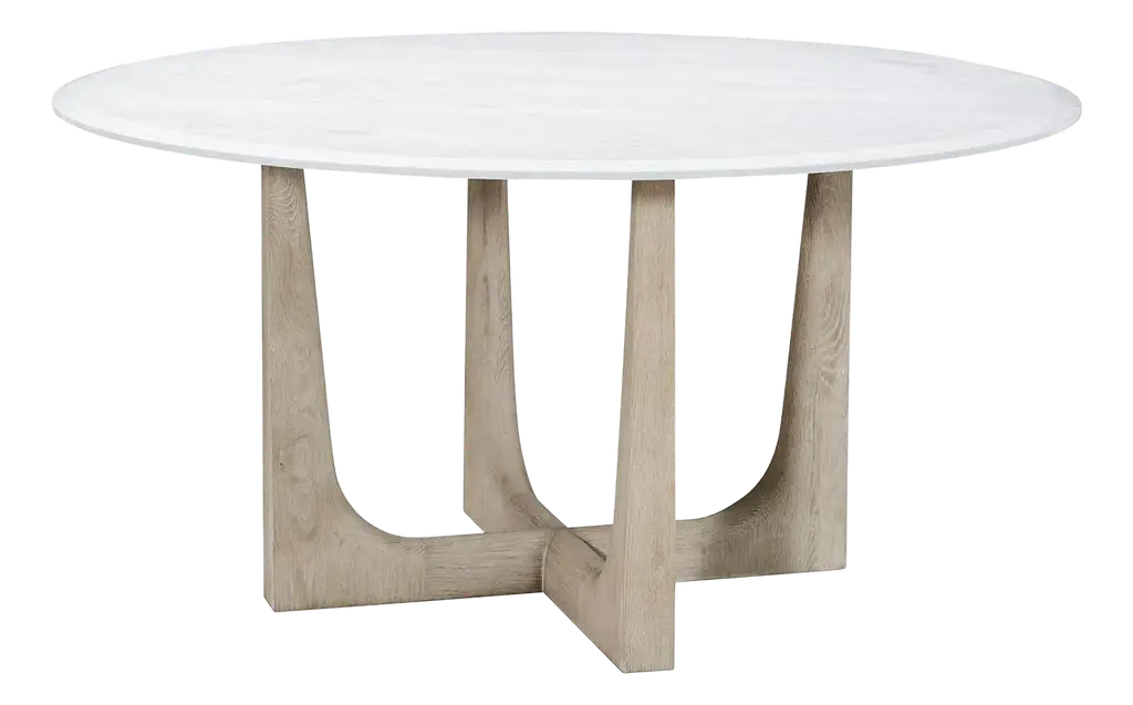 The Sama Round Bistro Dining Table from Jamie Young Co. unites sustainable mango wood with water buffalo bone inlay, creating an interesting visual display. Its rounded surface and surrounding structure are hand-finished with a patina that highlights the wood's natural traits, while the bone inlay border adds delicate detail without overwhelming the design. A perfect rustic addition to dining and kitchen spaces.