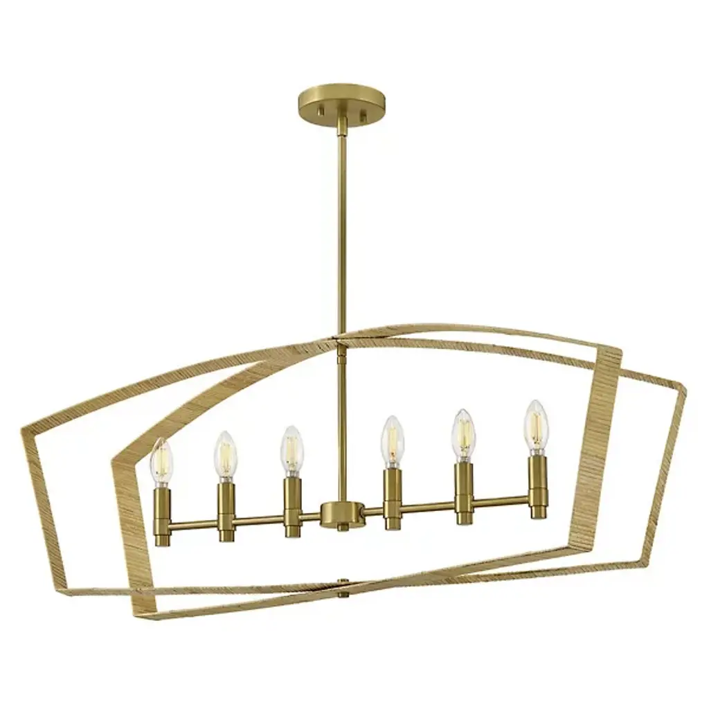 The Sammi Linear Suspension from Lark defies gravity with its open, airy framework that appears to float above dining areas. Natural materials frame six exposed bulbs arranged in perfect linear symmetry. Adjustable in height thanks to included stem options, this pendant adapts to various ceiling heights and room proportions. Its minimalist design allows light to flow freely in all directions, eliminating harsh shadows and creating consistent illumination. Compatible with sloped ceilings, this versatile fixture brings casual sophistication to dining rooms, kitchen islands, or long tables.