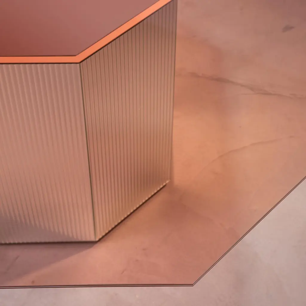 A larger version of the Sandra e Raimondo 140 table, this astonishing piece will create e luminous effect in a modern or contemporary dining interior. Featuring a handcrafted octagonal base in wood with a brilliant fluted glass overlay and an irregular octagon pink mirrored-glass top for a charming contrast. Measures 180x180x75cm.