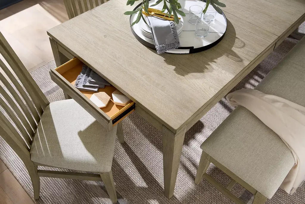 Our Santa Barbara dining table not only offers you a welcoming place for family dinners, but also storage opportunities. Featuring a drawer on each end of the table, this piece also has a removeable 15" leaf to allow for more guests. A multi-step, grey rub-through finish and visible wood knots give this table added character.