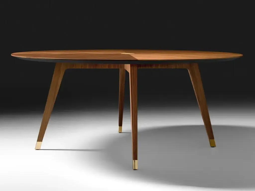 Santiago is a dining table with supporting structure in Canaletto walnut solid wood and top in MDF with Canaletto walnut veneer. Polished gold or matt dark bronze finishing metal parts. Round, oval and rectangular versions available. Lightness is given by the balance of small details, which give the whole structure of the table unexpected lightness considering its size. The precious Canaletto Walnut solid wood thus becomes a lightweight top of pure form and substance, adapting to both pleasant social moments and formal professional occasions. The gold-finished central inserts are a further subtle and unique symbol of the elegance of the Black Tie tables.