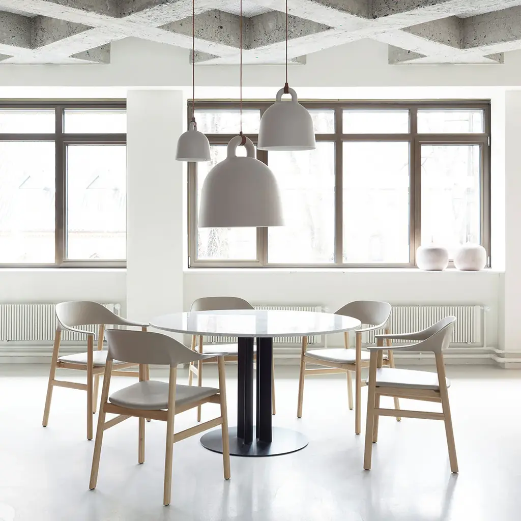 Scala table consist of a powder coated steel base with four poles. The tabletop comes in various sizes and shapes available in marble, veneer or stainless steel. The table is delivered flat-packed and must be assembled using the included tools. The tabletop is mounted with four screws.The marble tabletops are treated with a surface treatment that penetrates into the material and thereby provides a long-term protection. The surface should not be exposed to acidic foods or beverages, which can leave stains on the surface.