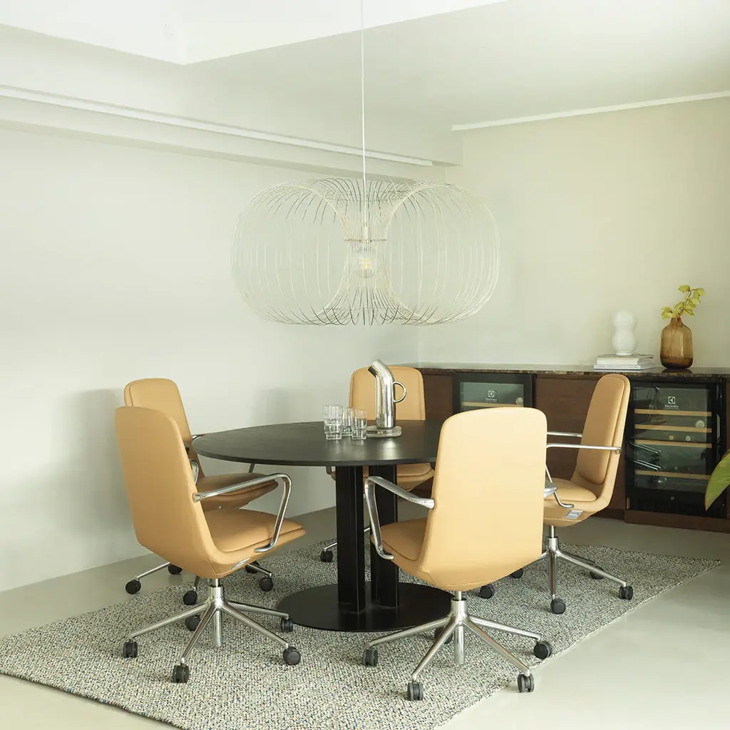 Scala table consist of a powder coated steel base with four poles. The tabletop comes in various sizes and shapes available in marble, veneer or stainless steel. The table is delivered flat-packed and must be assembled using the included tools. The tabletop is mounted with four screws.The marble tabletops are treated with a surface treatment that penetrates into the material and thereby provides a long-term protection. The surface should not be exposed to acidic foods or beverages, which can leave stains on the surface.