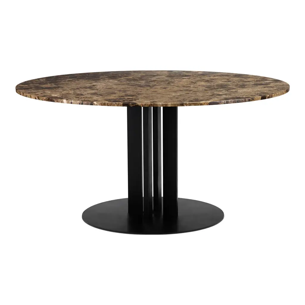 Scala table consist of a powder coated steel base with four poles. The tabletop comes in various sizes and shapes available in marble, veneer or stainless steel. The table is delivered flat-packed and must be assembled using the included tools. The tabletop is mounted with four screws.The marble tabletops are treated with a surface treatment that penetrates into the material and thereby provides a long-term protection. The surface should not be exposed to acidic foods or beverages, which can leave stains on the surface.