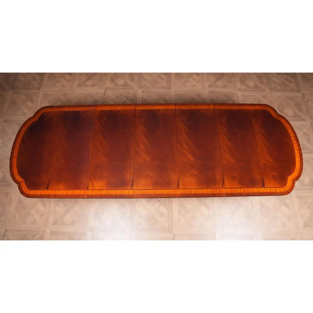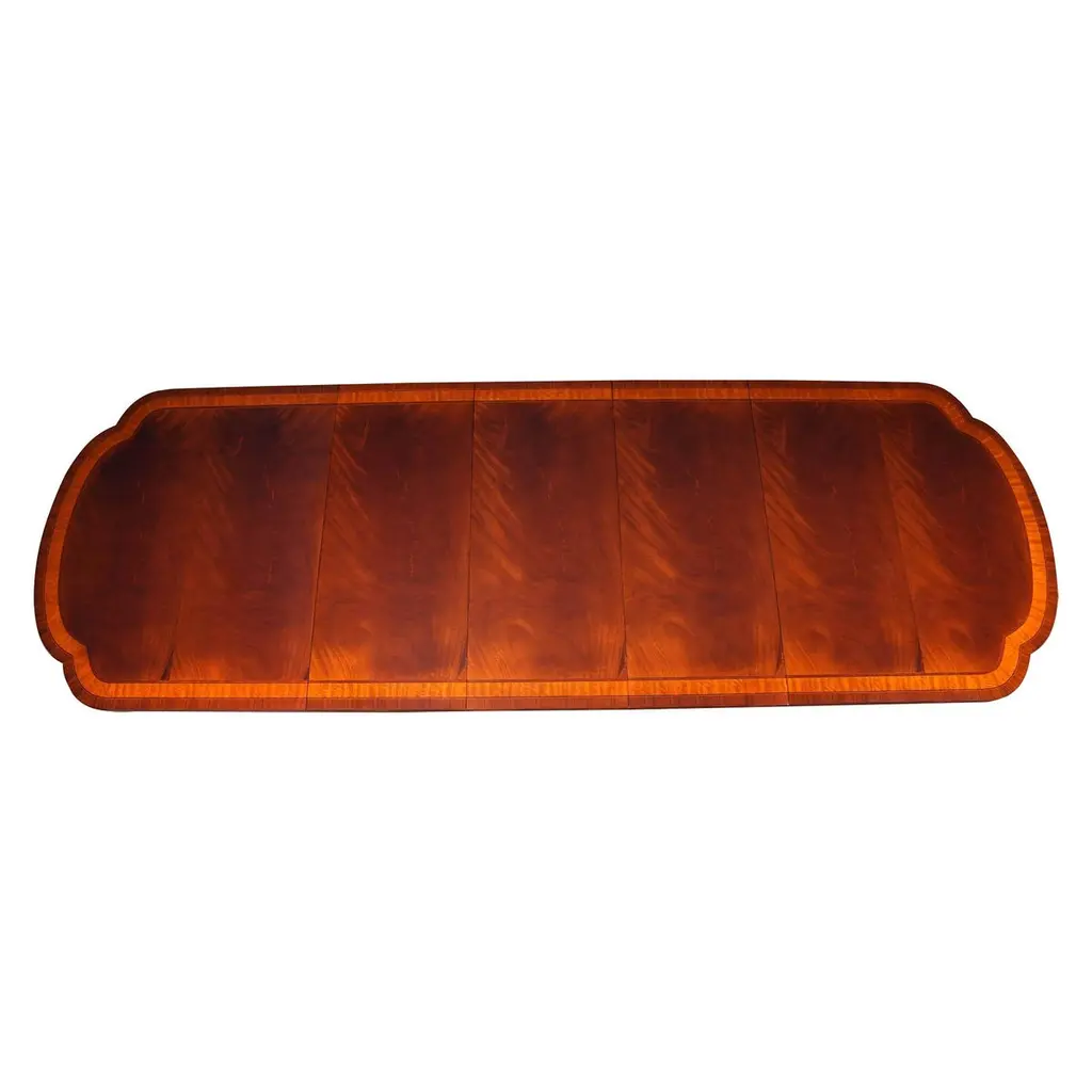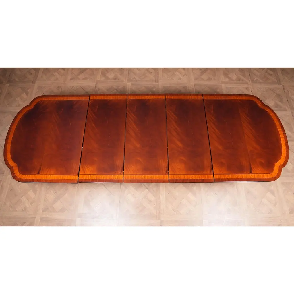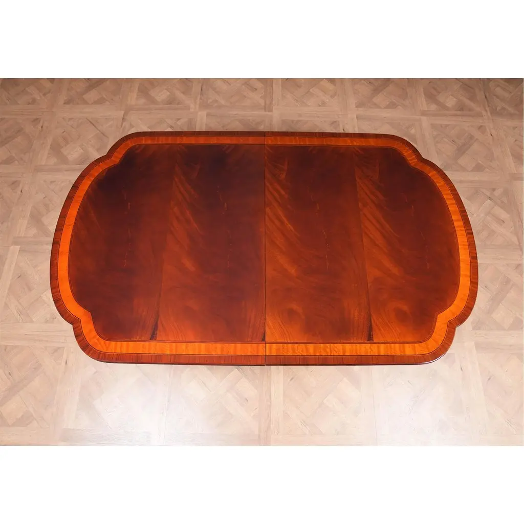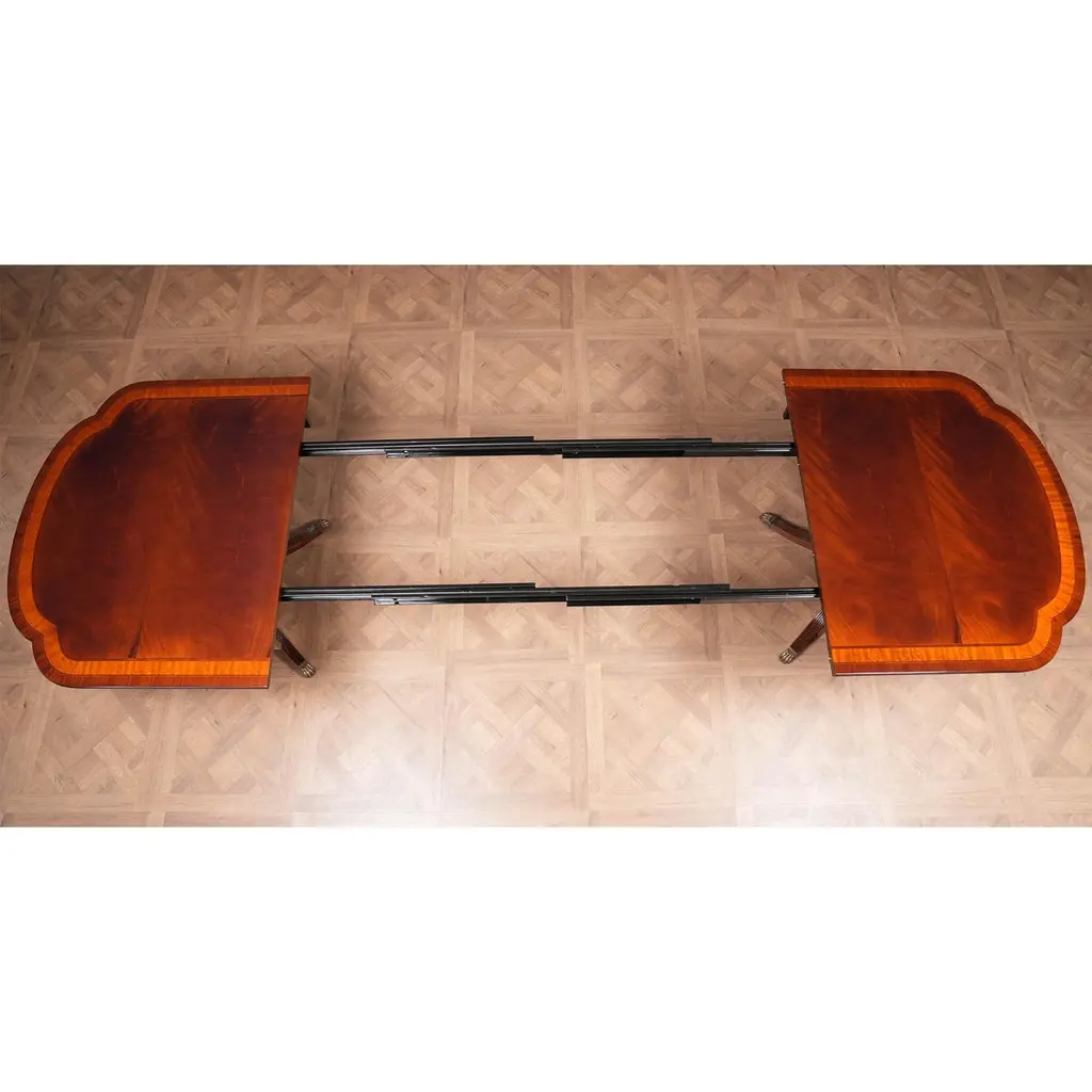 This Scalloped Corner Mahogany Dining Table has a lot of great features that combine to make it a favorite. Shown here with a veneered rosewood edge this table now ships with a reeded solid mahogany edge. A photo of the current edge type can be seen in the last frame of the picture gallery. The Scalloped Corner Mahogany Dining Table features numerous outside bandings consisting of rosewood, satinwood, ebony and sapele before reaching the center field of the table top which is comprised of high quality mahogany figural veneers. Below the table top the generous apron gives the table top depth as well as serving to help conceal the American made metal table rails. Closing to 79 inches this table extends with the three leaves in place to a length of 138 inches making it versatile and suitable for even large gatherings of up to twelve people. The reeded pedestals are hand made from solid mahogany and end in brass capped feet.Stock Photo for reference only. We take every measure to ensure that all of our dining tables are created to the highest standard using materials of similar quality but each table will appear slightly different due to the use of naturally occurring materials such as wood in the creation of our products.Measures 48″W x 79″-139″L x 31″H