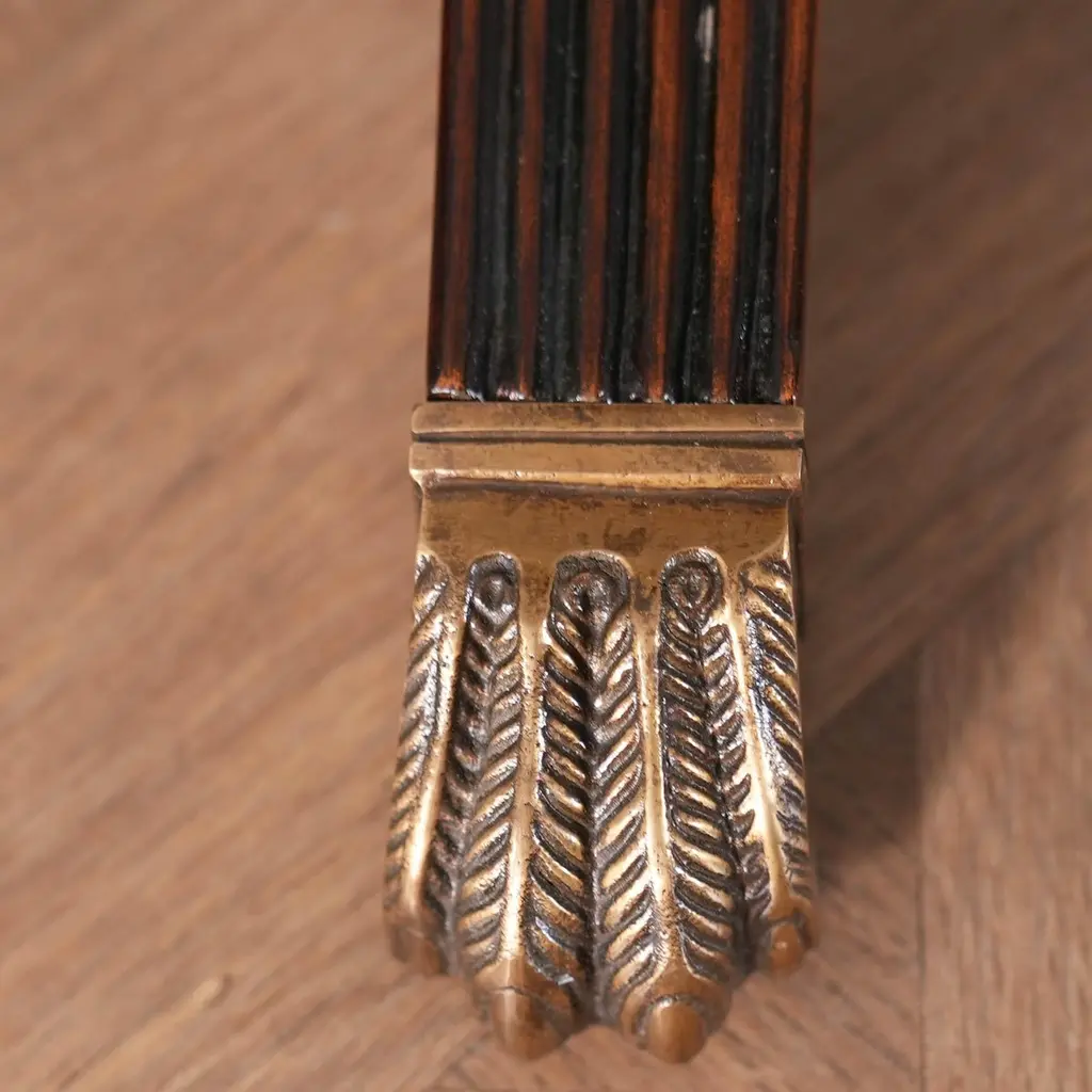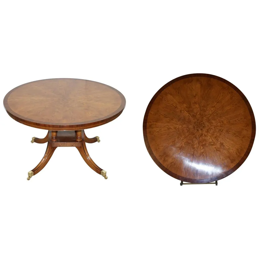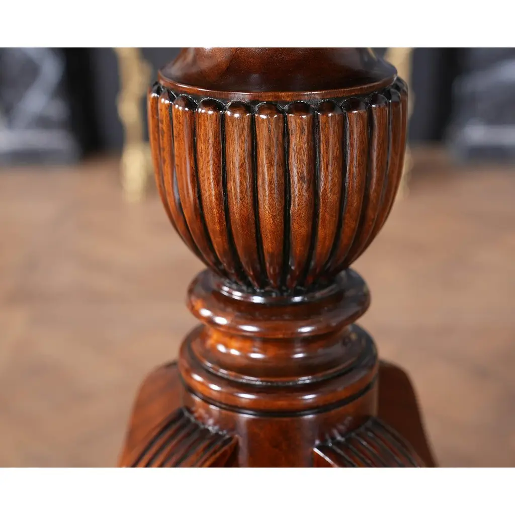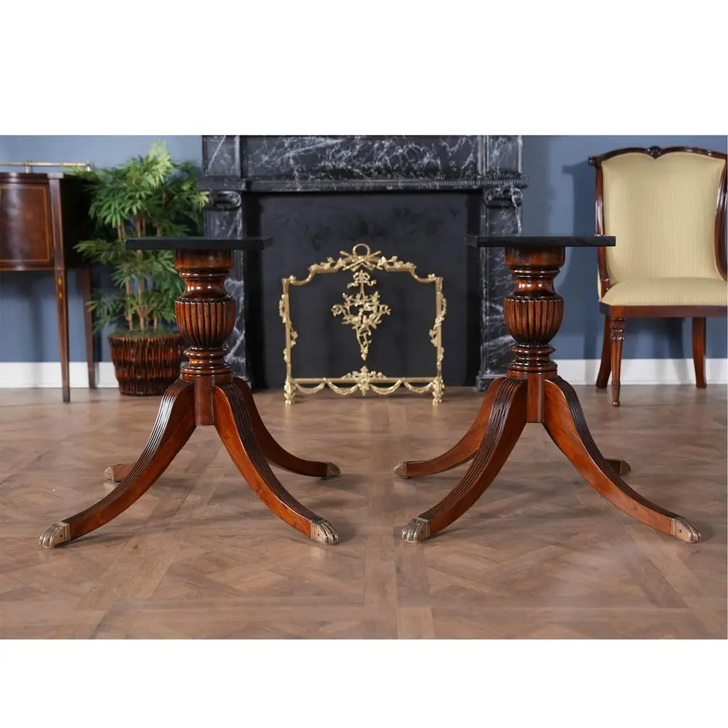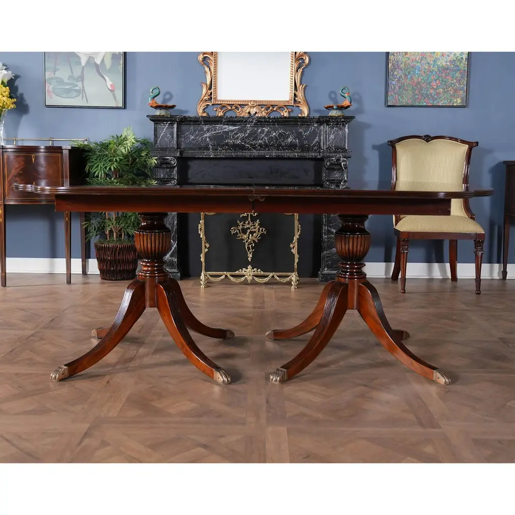 This Scalloped Corner Mahogany Dining Table has a lot of great features that combine to make it a favorite. Shown here with a veneered rosewood edge this table now ships with a reeded solid mahogany edge. A photo of the current edge type can be seen in the last frame of the picture gallery. The Scalloped Corner Mahogany Dining Table features numerous outside bandings consisting of rosewood, satinwood, ebony and sapele before reaching the center field of the table top which is comprised of high quality mahogany figural veneers. Below the table top the generous apron gives the table top depth as well as serving to help conceal the American made metal table rails. Closing to 79 inches this table extends with the three leaves in place to a length of 138 inches making it versatile and suitable for even large gatherings of up to twelve people. The reeded pedestals are hand made from solid mahogany and end in brass capped feet.Stock Photo for reference only. We take every measure to ensure that all of our dining tables are created to the highest standard using materials of similar quality but each table will appear slightly different due to the use of naturally occurring materials such as wood in the creation of our products.Measures 48″W x 79″-139″L x 31″H