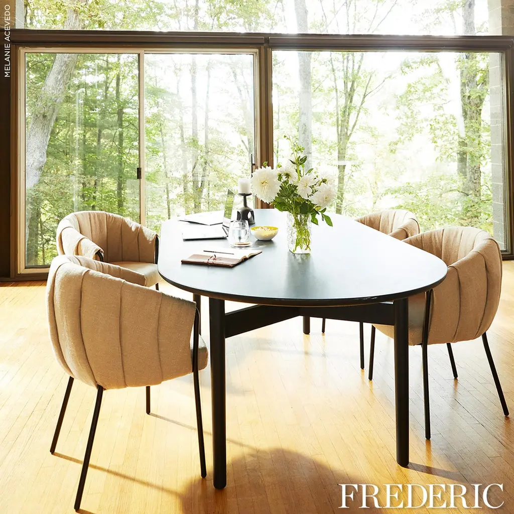 Elegantly beveled to give the solid oak construction a pure and light appearance, the Puffin Dining Table’s elliptical top is the perfect marriage of form and function. Designed in Denmark by Charlotte Høncke and meticulously handcrafted in Italy, this table features inset legs braced with surprising Y-shaped stretchers that allow every chair to be pulled in close for cozy gatherings. Part of our Schumacher Editions Dining Collection.