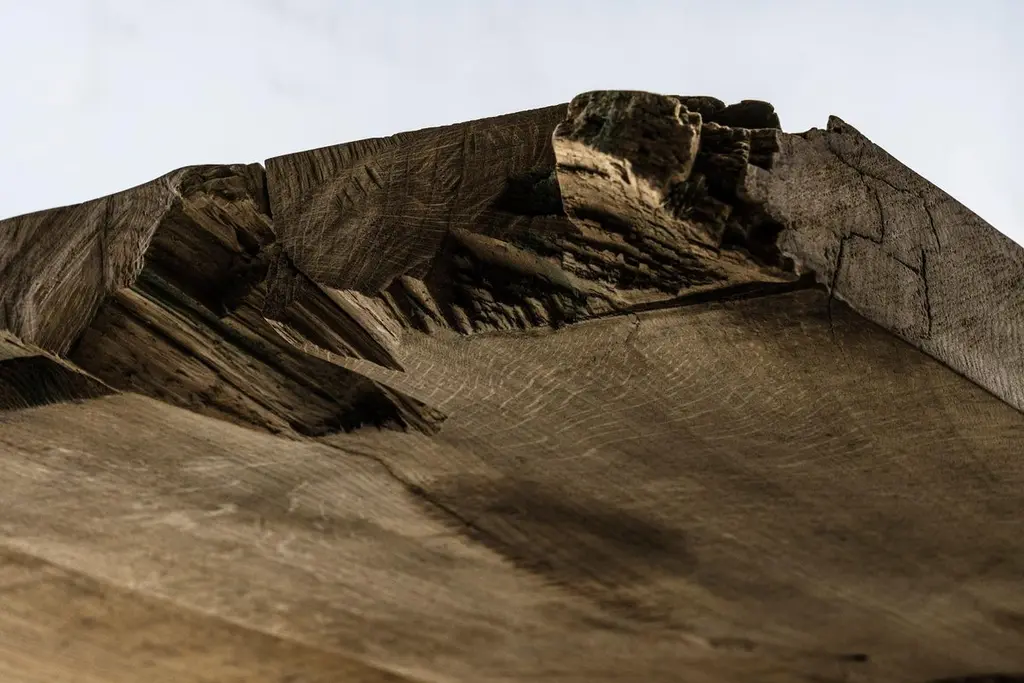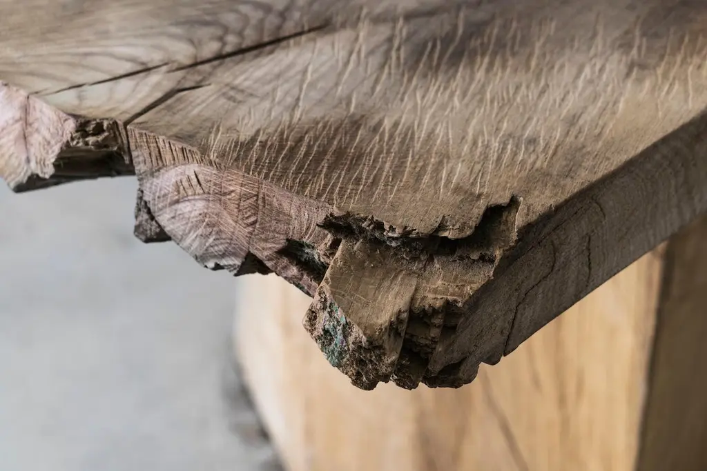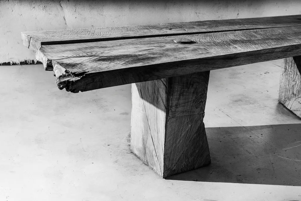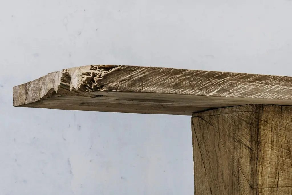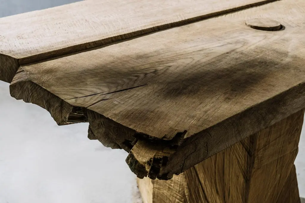 Massive dining table of solid oak (+ linseed oil)(Outdoor use OK)Warm furniture’s made by Russian designer Denis Milovanov from "Soha" studio. Simplicity of shapes. Authentic material.Wooden items are created from oak and are boiled in oil from several days to several weeks, to achieve a natural wood coloration from a dark brown to a complete black color. Patterns are applied solely by chain saw.Unique piece made to order.