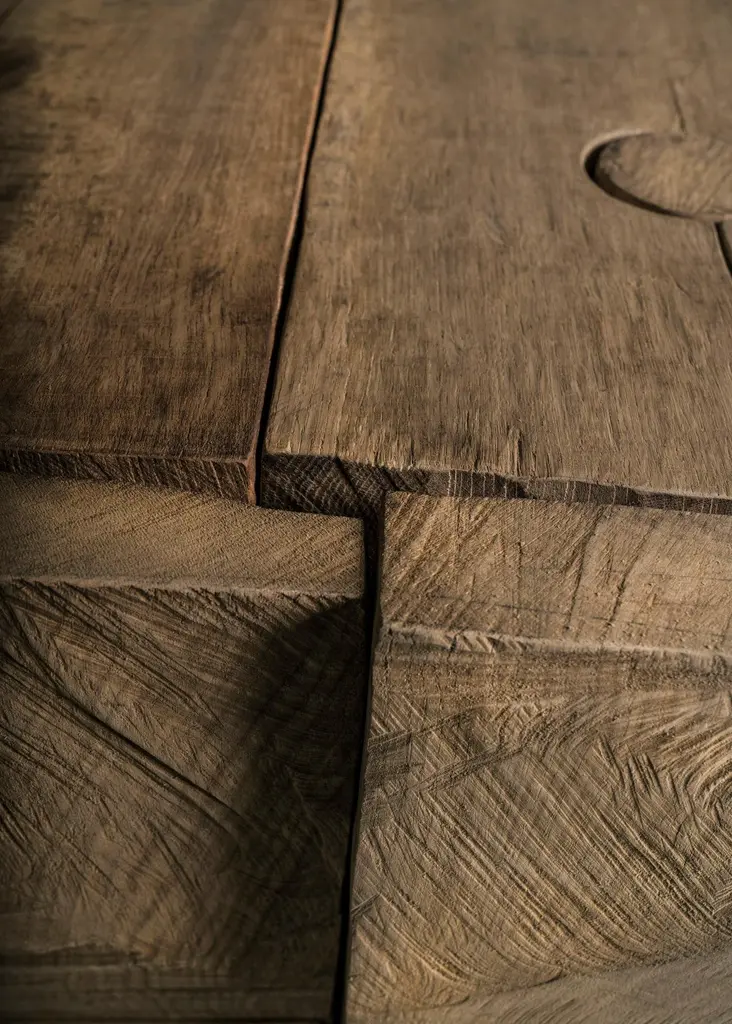 Massive dining table of solid oak (+ linseed oil)(Outdoor use OK)Warm furniture’s made by Russian designer Denis Milovanov from "Soha" studio. Simplicity of shapes. Authentic material.Wooden items are created from oak and are boiled in oil from several days to several weeks, to achieve a natural wood coloration from a dark brown to a complete black color. Patterns are applied solely by chain saw.Unique piece made to order.