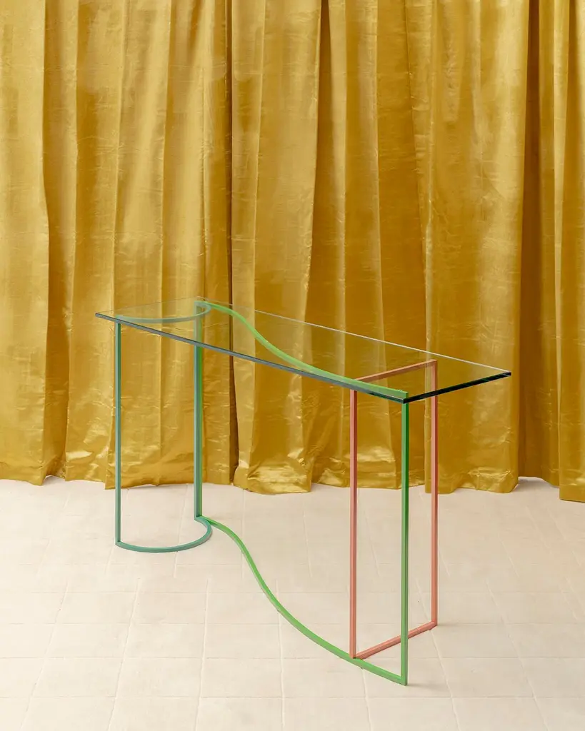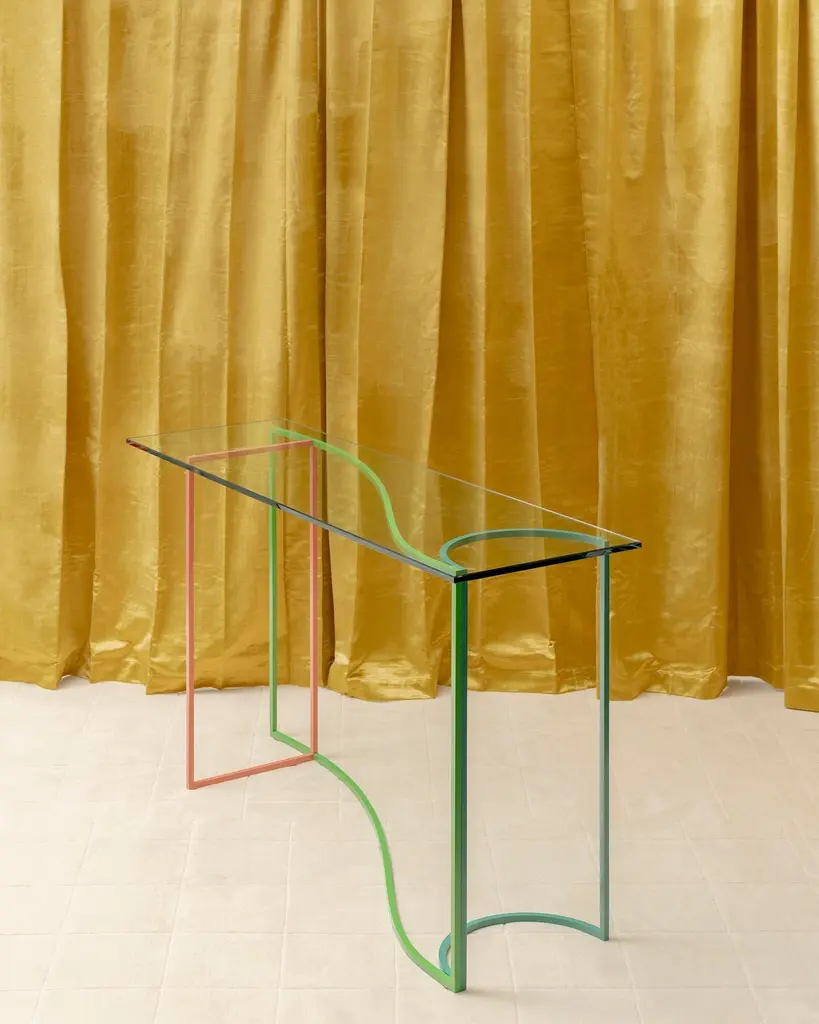 Made from powder-coated steel and glass, and available as coffee tables, desks, dining tables, or consoles, the Frame tables were designed by Swiss duo Thévoz-Choquet around a series of intersecting geometries. Inspired by Fred Sandback’s volume studies and the perception of negative space, colorful steel frames generate volumes in deliberately minimal compositions. The colors in each base can be customized on demand. The Frame console table is part of Sight Unseen first-ever furniture collection, creative directed by Sight Unseen founders Monica Khemsurov and Jill Singer and produced in collaboration with Bestcase, a Long Island furniture brand specializing in sheet metal. For the collection, Sight Unseen commissioned four international designers to create five works, all rendered in various types of metal. The full edition is meant for both the contract and residential market.The aim of the collection is to showcase the possibilities of industrially produced metal through designs that channel Sight Unseen’s preference for works that are simple yet visually striking. With their metal profiles softened by curvaceous geometries, contrasting materials, and playful colors, all five pieces could feel at home in any living room or hotel suite.