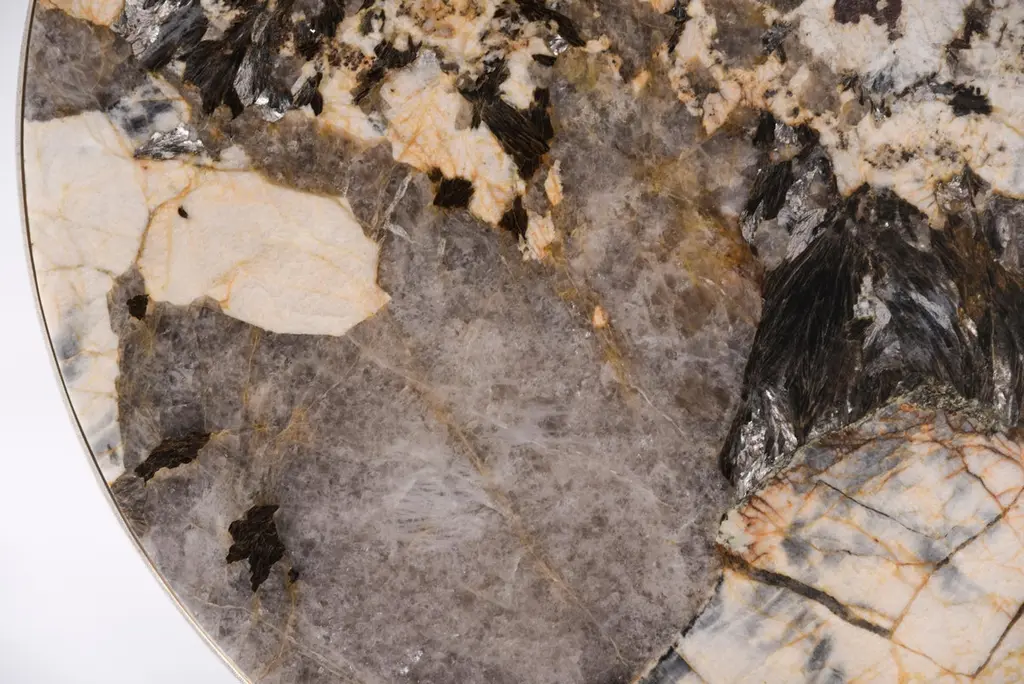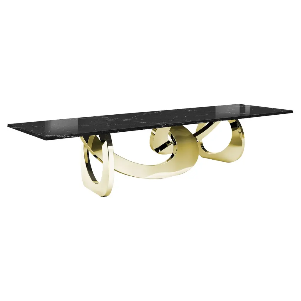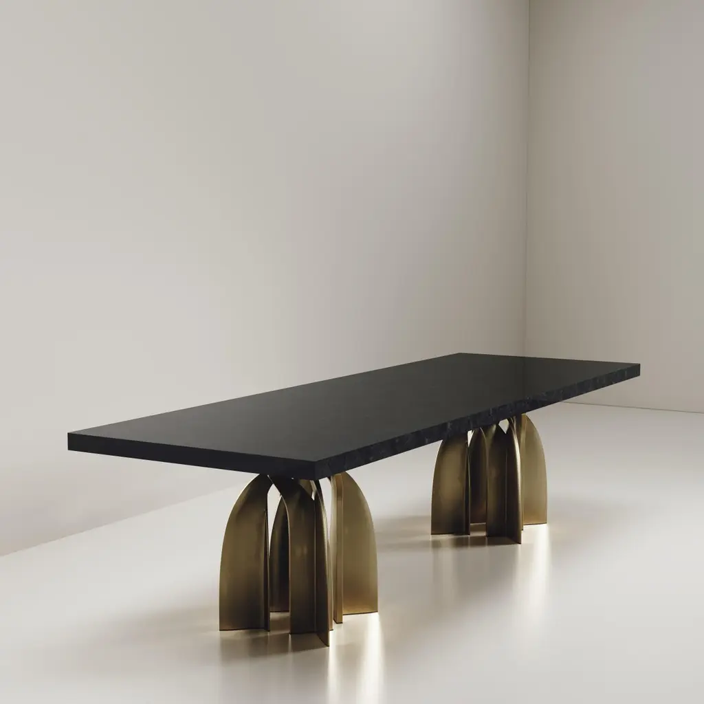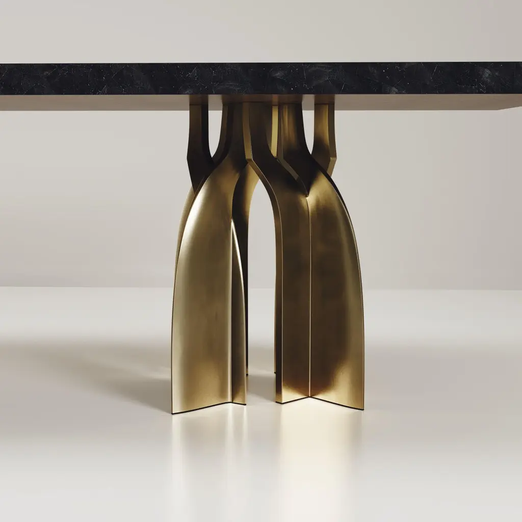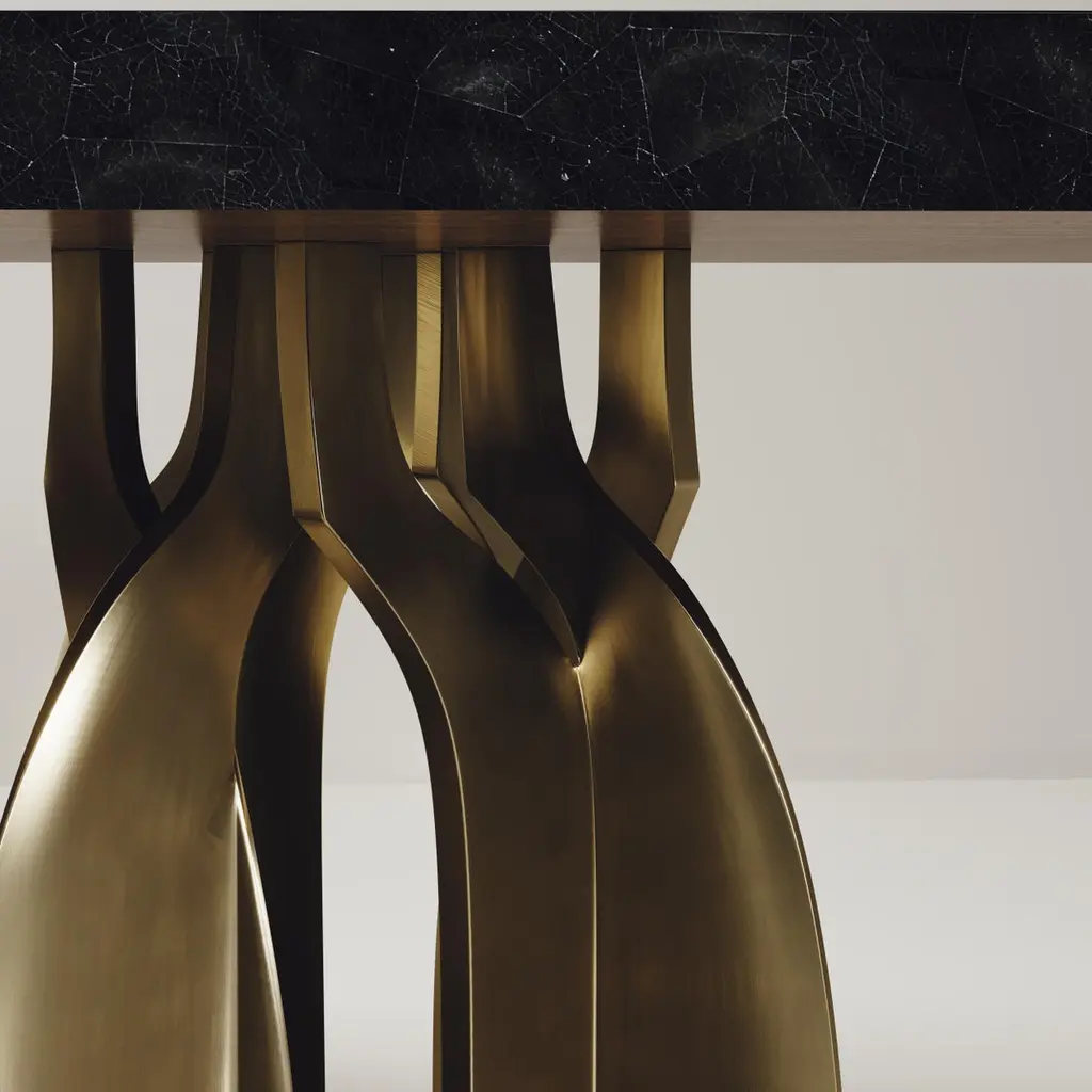 The Paris based label has distinguished themselves since their launch, with their iconic use of shagreen mixed with brass and other exotic materials. All furniture is handcrafted by skilled artisans, ultimately making each piece unique, designed in Paris and produced in the Philippines.The Chital Dining table is a stunning piece, a statement in any space. The black pen shell inlaid top is sleek and dramatic, and followed by bronze-patina brass sculptural legs clustered together as the base. This piece is designed by Kifu Augousti, the daughter of Ria & Yiouri Augousti. Available in other finishes and as a round breakfast table version.The dimensions of this piece are 304.8 x 106.9 x 75 cmAll Kifu Paris pieces are handmade by artisans, ultimately making each piece unique. Custom color or sizing available on request. Wipe clean with soft dry cloth.Although inspired by her parents, her collection of Home Accessories and Furniture is a distinct identity of its own. Kifu uses handmade techniques of elaborate inlay patterns of shagreen, shells, semi-precious stones, materials she experienced as a child growing up in her parent’s studio, but interpreted in a younger quirkier way reflecting her youth. From her "jewelry inspired knobs" on decorative boxes, gold bar boxes and an extravagant inlay pattern mix of shagreen and shell inspired by galactic constellations, as seen on her enormous round mirror, is refreshing to see. Kifu embodies whimsical elements throughout her collection and is not afraid to be daring and unexpected in her approach to design. All shagreen-covered items should be kept out of direct sunlight, color variants may occur on the stingray and other exotic finishes, but this showcases the Parisian label's commitment to creating authentic luxurious products using natural components.