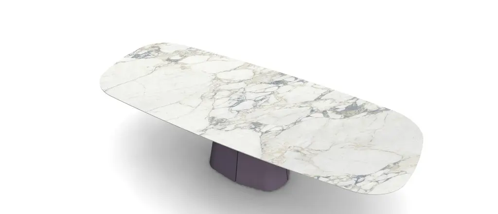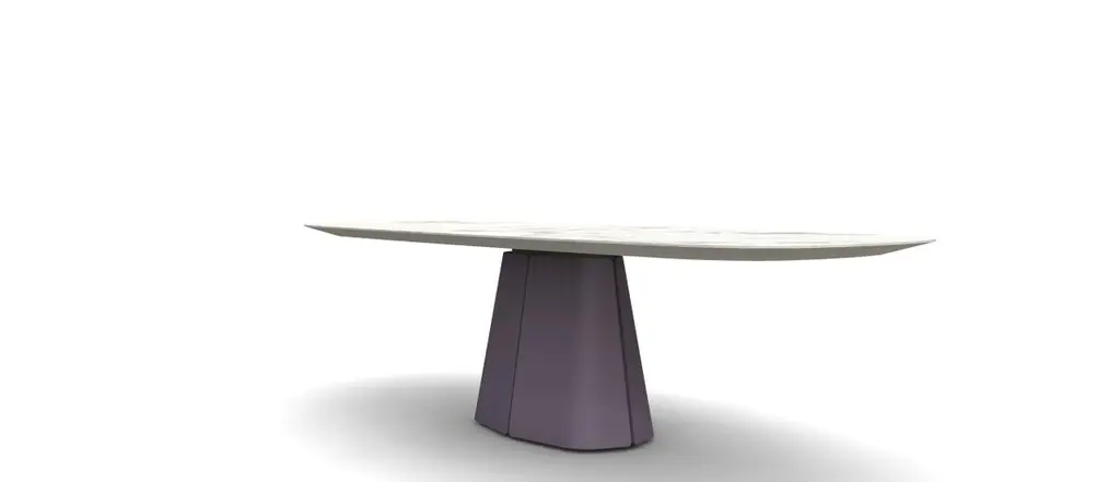 Sculptural Dining Table Shaped Oval Top, Arabescato Ceramic/purple Lacquer