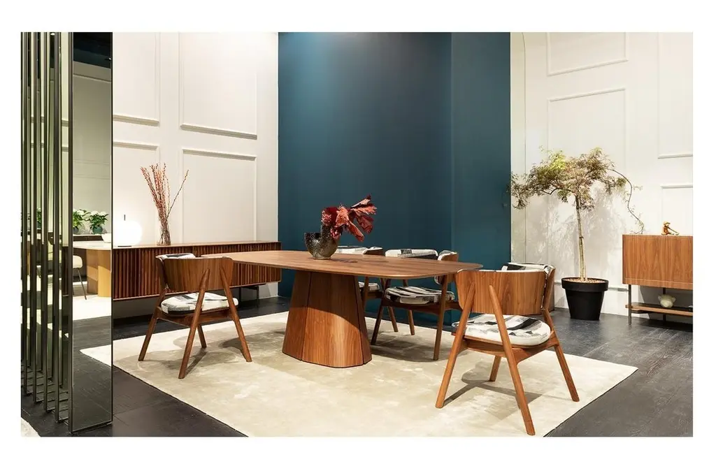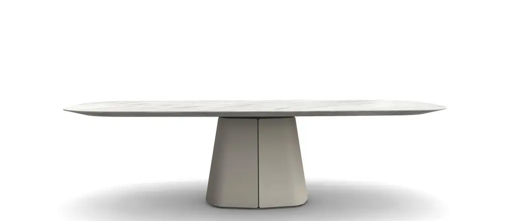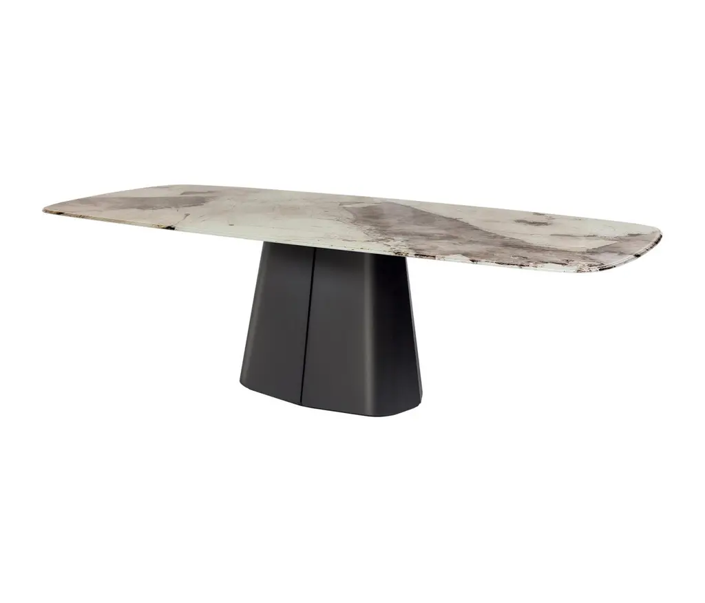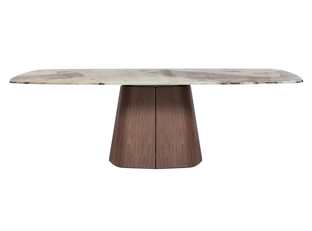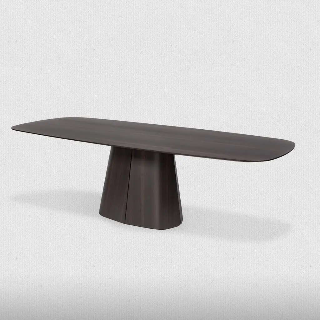 A refined statement piece, this sculptural dining table features a softly contoured rectangular top resting on a bold, tapered plinth base. Crafted in rich walnut, the table showcases a continuous grain flow and seamless transitions between surfaces, emphasizing craftsmanship and materiality. The pedestal-style base offers generous legroom and creates a clean, architectural silhouette from every angle. Ideal for contemporary interiors, this table blends organic elegance with modern simplicity, making it a striking centerpiece for dining rooms or design-forward spaces.Note: Pricing reflects the finish and material shown in the primary image. Alternate finishes and customizations are available upon request.Customization:The tabletop is offered in wood, marble, or combination.The customizable nature of the tabletop and base materials ensures that it can complement a wide range of interior styles and color schemes.Whether used in a formal dining room or a more casual setting, the table's design and quality construction make it a versatile addition to any home.Quality and Craftsmanship:Handcrafted with attention to detail and a commitment to high-quality materials and construction techniques.Please contact us if you have any questions about customization and pricing. We will be glad to check with the factory’s technical team if sizes, finishes, and colors can be customized. We do our best to expedite production and to ship and deliver product within the listed lead time, however current lead times might be longer due to global shipping backlog and delays. These delays are out of our control and cannot be a reason to cancel an order.