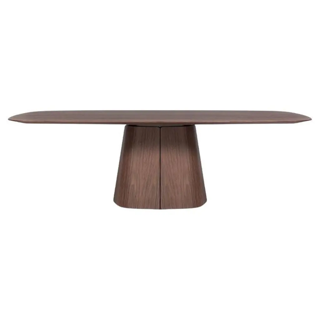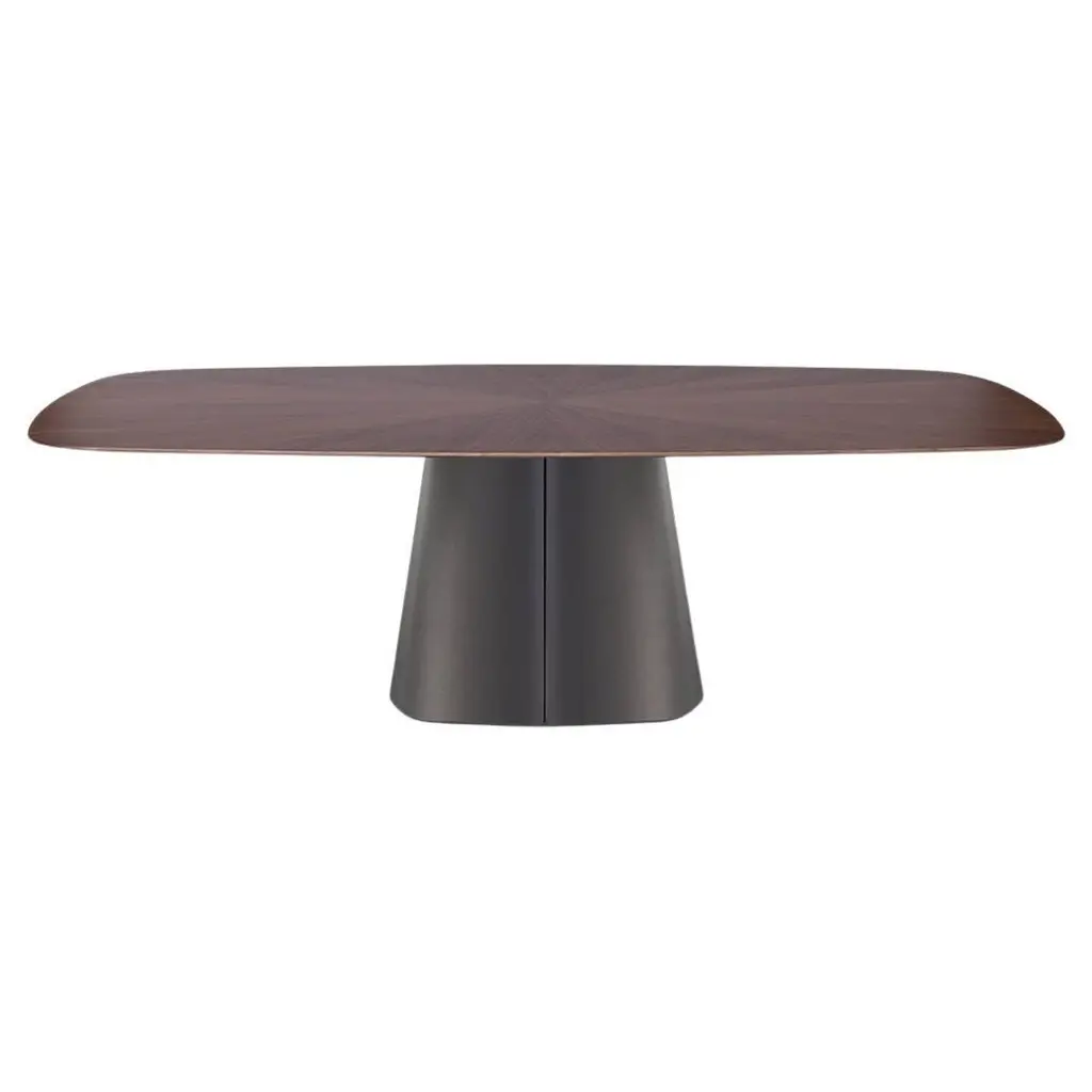 A refined statement piece, this sculptural dining table features a softly contoured rectangular top resting on a bold, tapered plinth base. Crafted in rich walnut, the table showcases a continuous grain flow and seamless transitions between surfaces, emphasizing craftsmanship and materiality. The pedestal-style base offers generous legroom and creates a clean, architectural silhouette from every angle. Ideal for contemporary interiors, this table blends organic elegance with modern simplicity, making it a striking centerpiece for dining rooms or design-forward spaces.Note: Pricing reflects the finish and material shown in the primary image. Alternate finishes and customizations are available upon request.Customization:The tabletop is offered in wood, marble, or combination.The customizable nature of the tabletop and base materials ensures that it can complement a wide range of interior styles and color schemes.Whether used in a formal dining room or a more casual setting, the table's design and quality construction make it a versatile addition to any home.Quality and Craftsmanship:Handcrafted with attention to detail and a commitment to high-quality materials and construction techniques.Please contact us if you have any questions about customization and pricing. We will be glad to check with the factory’s technical team if sizes, finishes, and colors can be customized. We do our best to expedite production and to ship and deliver product within the listed lead time, however current lead times might be longer due to global shipping backlog and delays. These delays are out of our control and cannot be a reason to cancel an order.