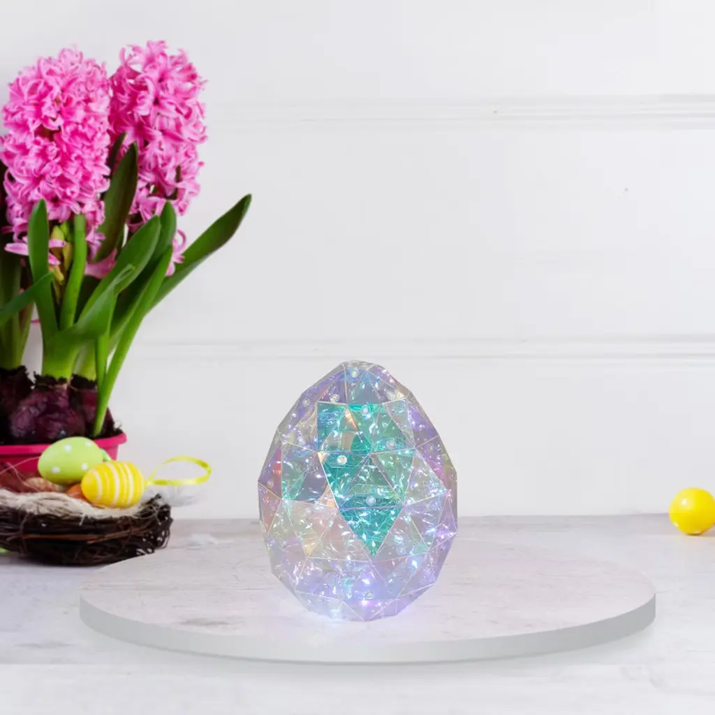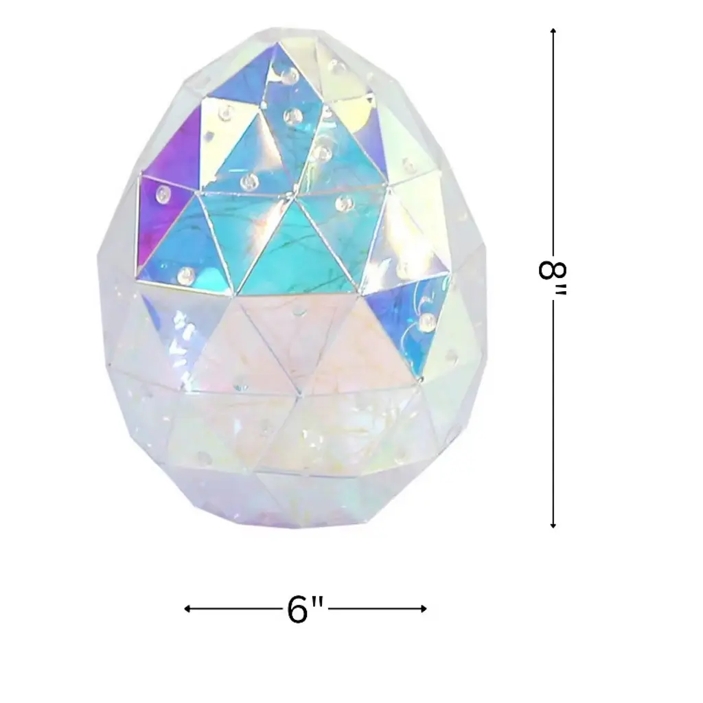 Add a touch of sparkle to your Easter decor with the Seasonal LLC Prismatic Iridescent Egg. At 8 inches tall, this luminous egg is beautifully illuminated by 100 cool white LED lights, creating a gentle, festive glow. Battery-operated for easy placement, it requires 3 AA batteries (not included) and is designed for indoor use only. Crafted by Seasonal LLC, this glowing egg is the perfect centerpiece for your mantel, dining table, or entryway. Whether you're celebrating Easter or simply embracing the beauty of spring, this iridescent egg brings a joyful, radiant touch to your home.