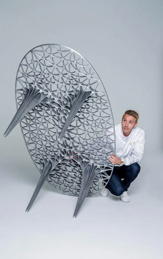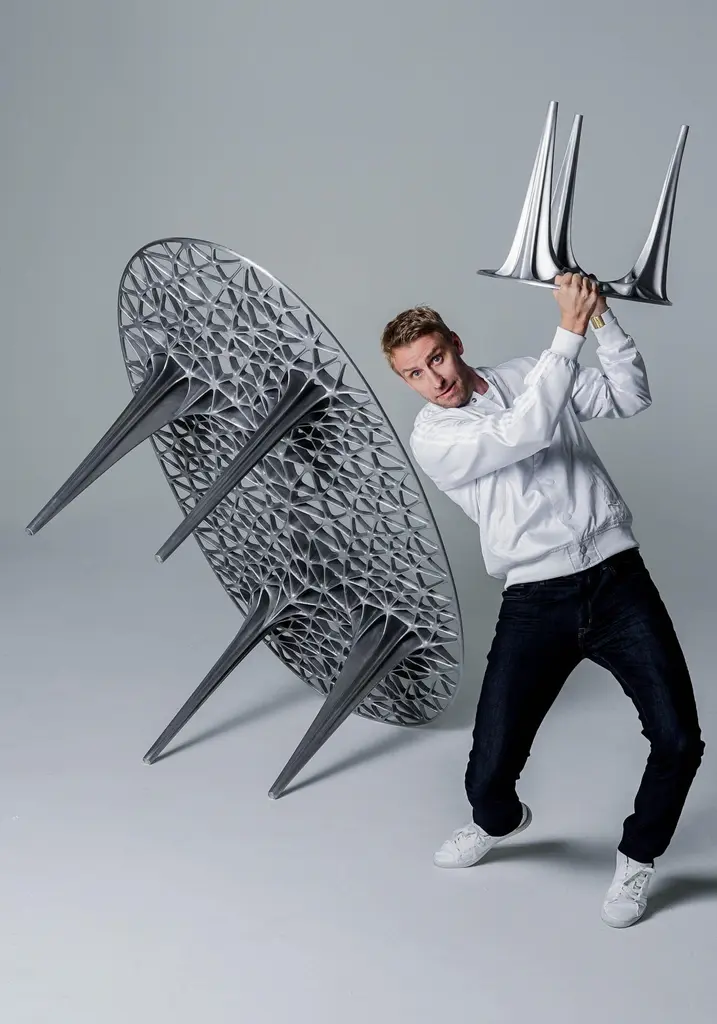 A polished aluminium dining table inspired by the infamous red rocks of Sedona; the form references the peaks and plateaus of Sedona’s unique sandstone formations. This design has a strong Silhouette and delicate, organic triangular detailing.