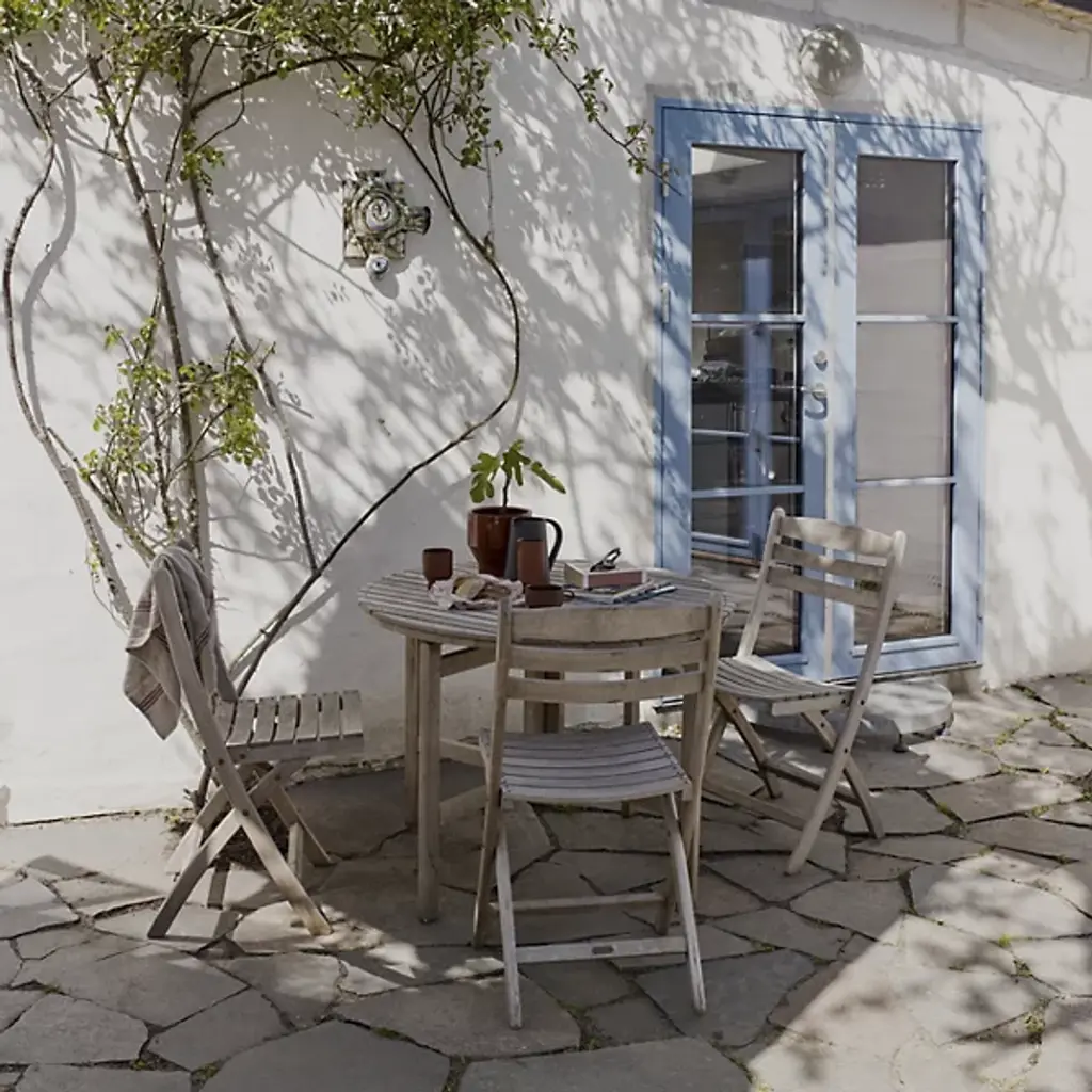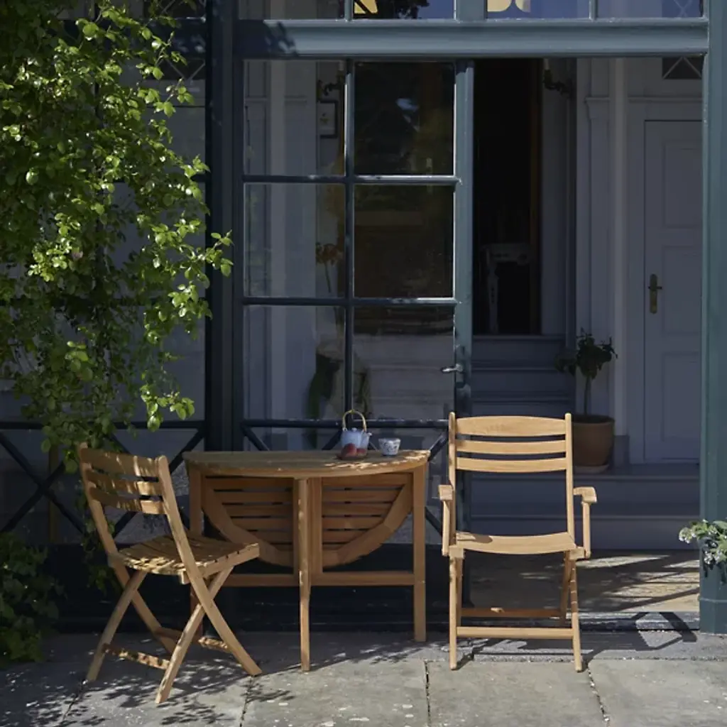 Unfold added storage indoors or out with the open appeal of the Selandia Round Dining Table from Fritz Hansen. A subtle construction of foldable FSC-certified teak wood designed by Anders & Lars Hegelund, it rises from four legs to a slatted top, able to tuck away completely or remain half-folded depending on the use case and space available. The tabletop features gaps to allow dew or rainwater through, while the wood itself can weather rain or shine, aging into a silvery patina with use.