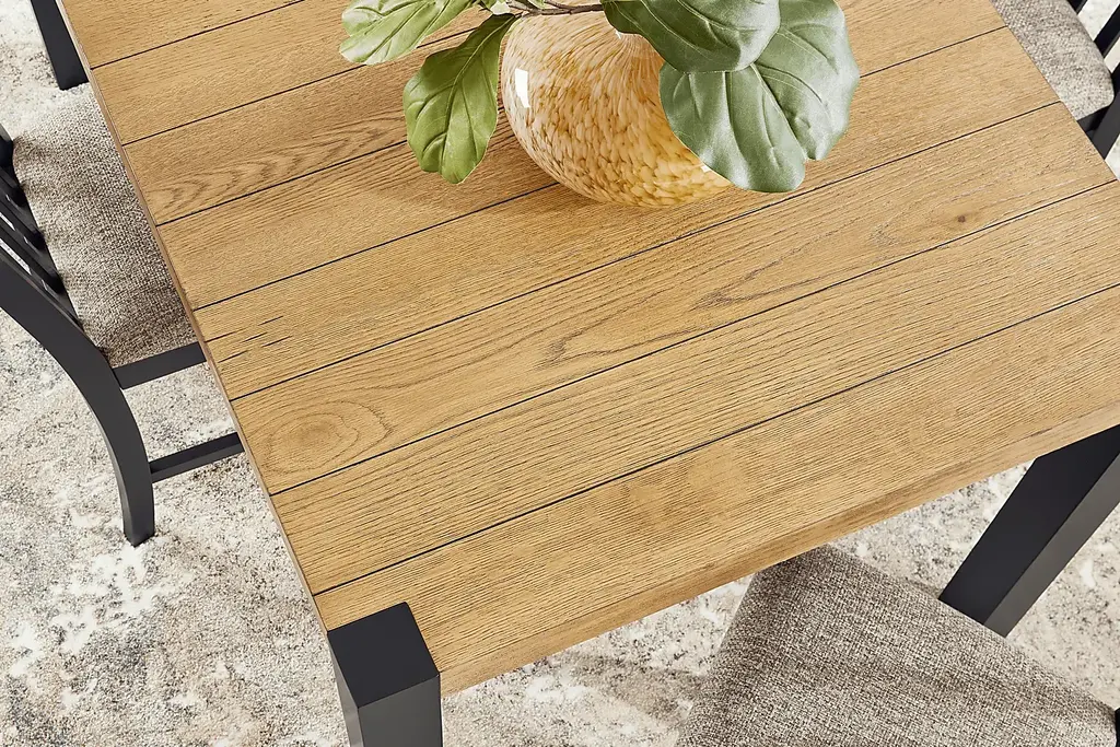 Reminiscent of the sun's soft light dancing on a calm lake, the Senatte collection brings nature's charm indoors with a cozy glow and delightful nod to craftsmanship. This dining table is rooted in classic style and adds warmth and natural charm to any room. The plank-inspired top crafted from oak veneers in a natural brown finish showcases intricate wood-like detailing that feels rich and organic. Sleek black legs peek through each corner, highlighting the table's clean-lined silhouette and bold contrast.