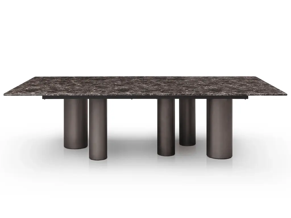 Imposing legs with precise profiles creates three-dimensional effects through their protrusions and recesses. The Serge Table features a matte black metal and burnished copper frame paired with a Cipollino Rosso marble top, blending essential elements into a monumental form that imparts a sense of solemnity to the table.