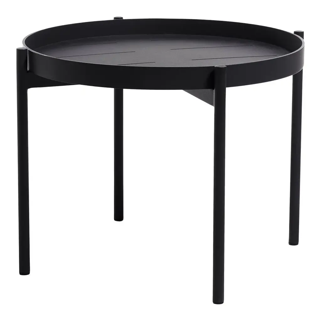 Round dining table with obvious frame. Legs placed outside the frame of the table designed by Verner Panton.Material:Frame: Black or white painted metal legsBlack: 9011Edge: Painted MDFTabletop: Fenix laminate Color:Tabletop: Black (0720) Fenix nanotech material or black linoleum from Forbo.