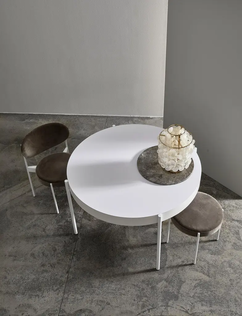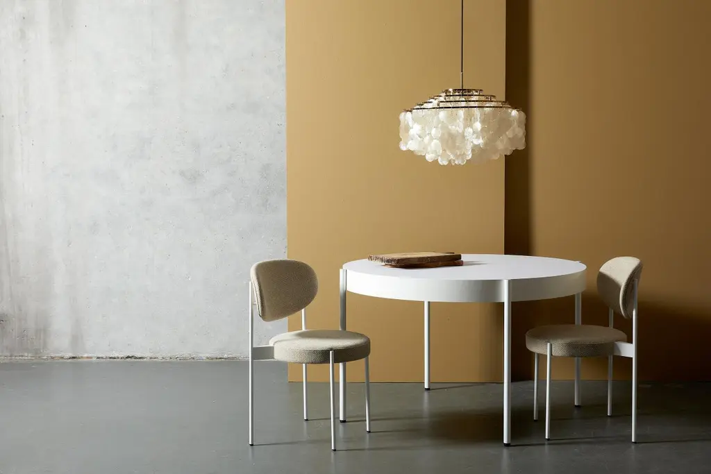 Round dining table with obvious frame. Legs placed outside the frame of the table designed by Verner Panton.Material:Frame: Black or white painted metal legsWhite: RAL 9016 Edge: Painted MDFTable top: Fenix laminate Color:Tabletop: White.