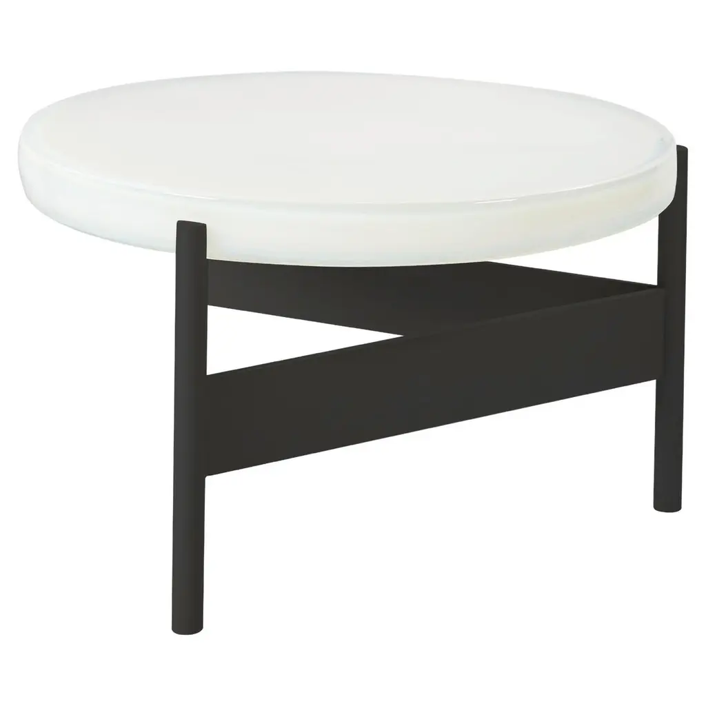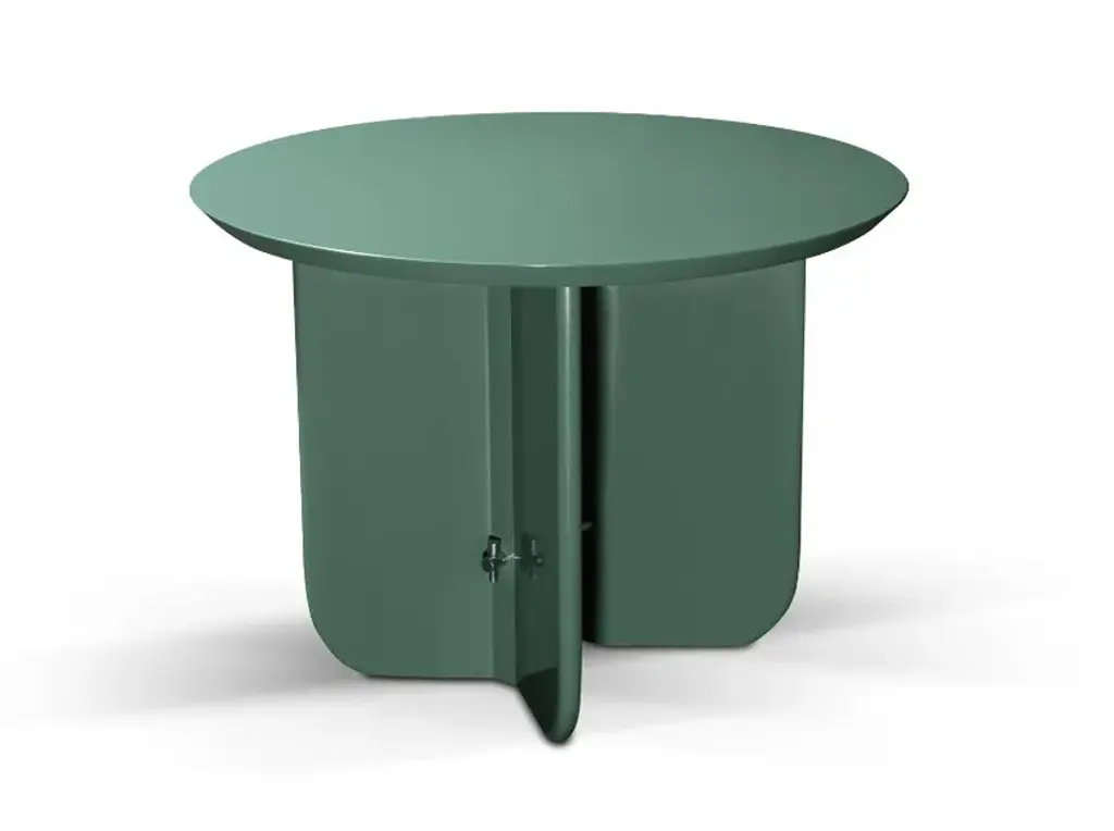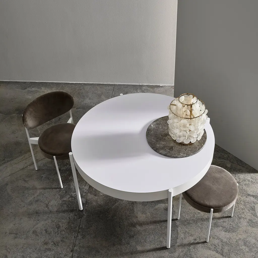 The circular lines of Series 430 seating designed by Verner Panton also provide the template for this companion dining table. Orienting the collection’s characteristic slim metal legs on the outside of the lacquered table edge gives the piece additional visual interest. Available in black or white in a choice of smaller and larger sizes, the tabletop is surfaced with a next-generation nanotech laminate.