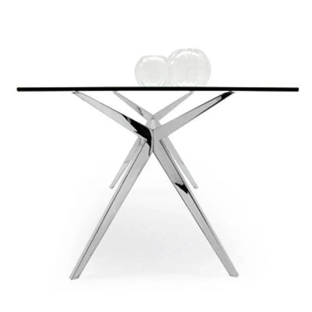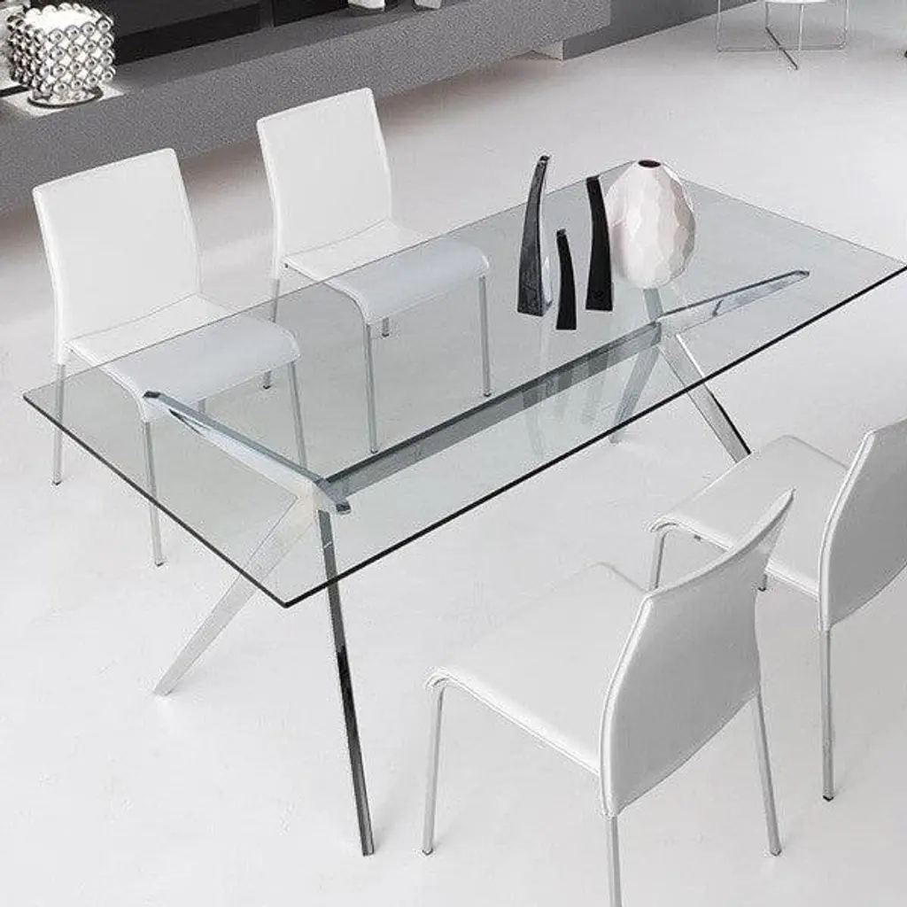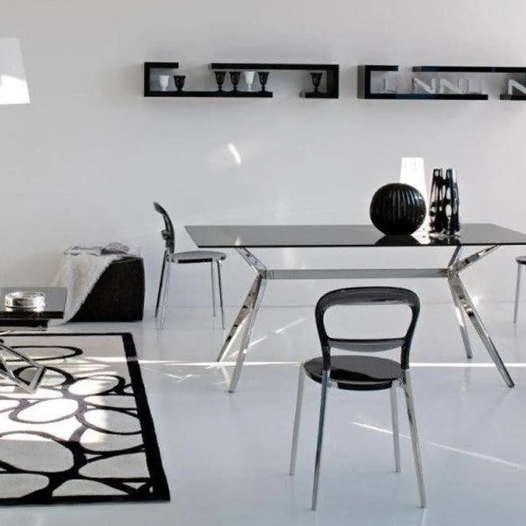 With its clean lines, minimalist look, and contemporary appeal, the Calligaris Seven Glass Top Dining Table at Euro living furniture is sure to be the highlight of your dining area. Its stylish chrome metal frame and legs meet their match in the tempered glass tabletop, which is available in a choice of Transparent or Smoked Grey finishes. Large enough to seat eight people or more, this table's crisp design and updated elegance never fail to charm its owners, or their guests! Features: