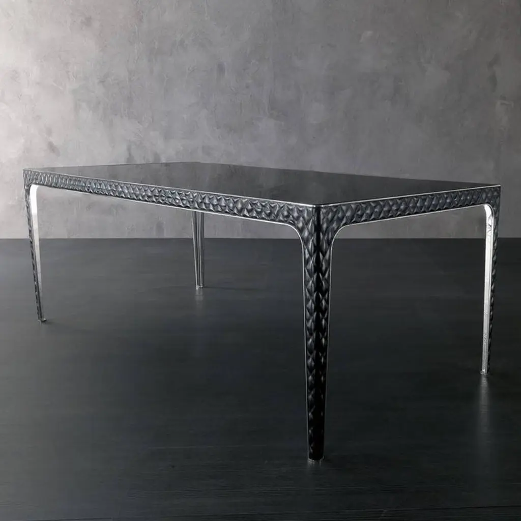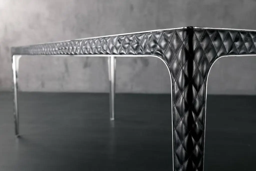 Dining table with structure in polished stainless steelwith black glass top. Legs covered with capitonated black genuine leather (Cat C).Available in:L201,2xD112,2xH76,3cm, price: 15900,00€.L242,2xD112,2xH76,3cm, price: 20500,00€.L320,2xD120,2xH76,3cm, price: 23500,00€.Also available with top covered with leather,bronze structure, on request.