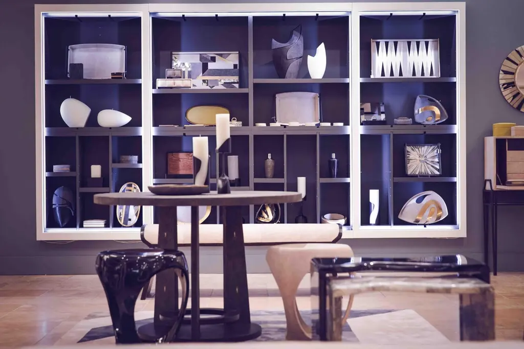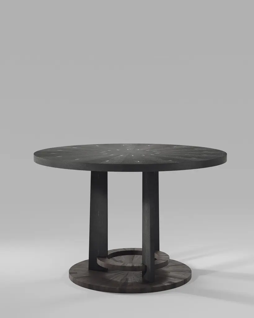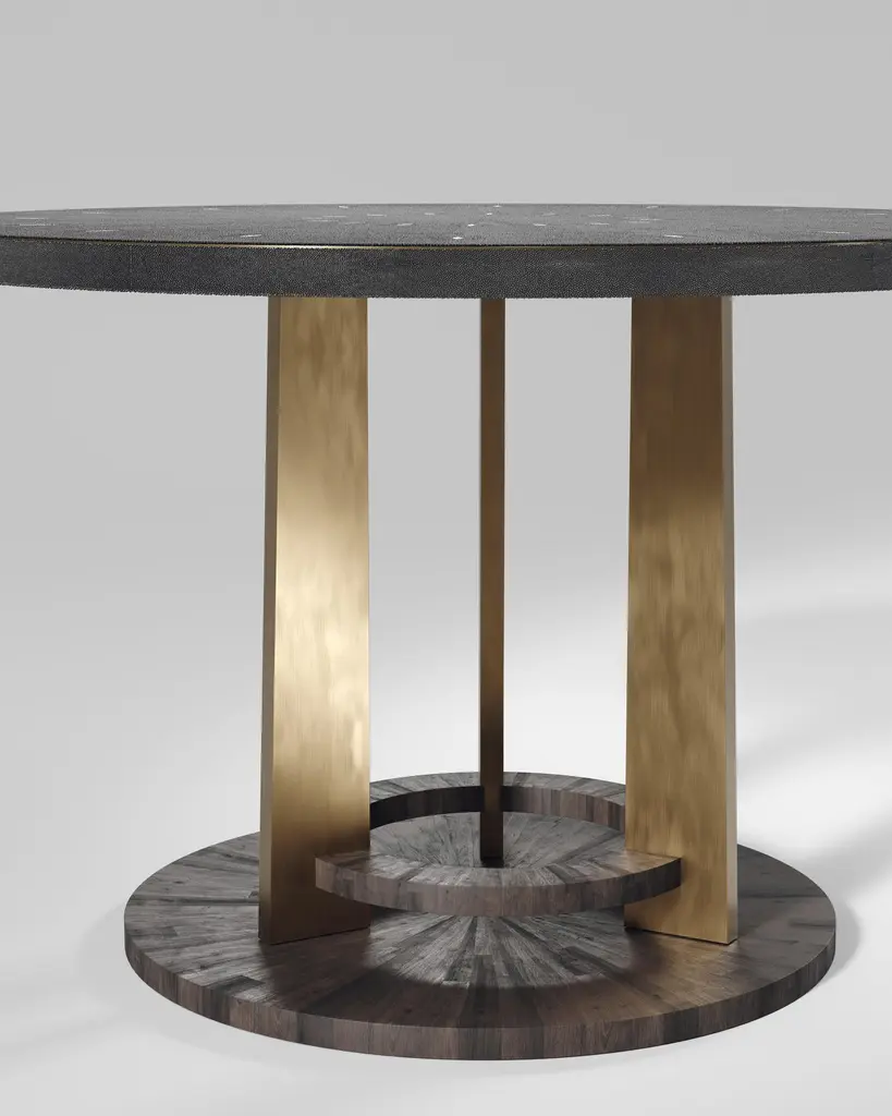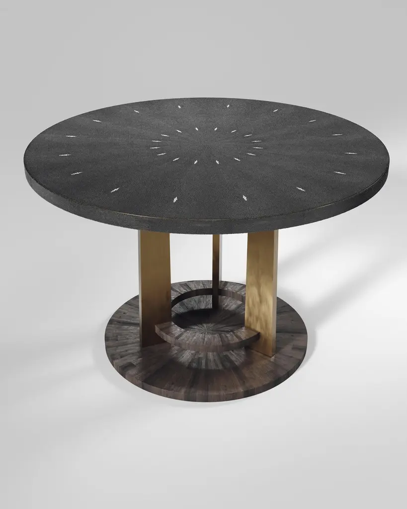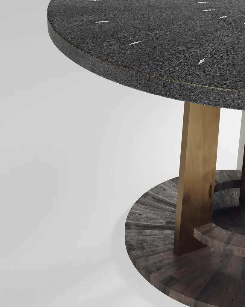The Paris based label has distinguished themselves since their launch, with their iconic use of shagreen mixed with brass and other exotic materials. All furniture is handcrafted by skilled artisans, ultimately making each piece unique, designed in Paris and produced in the Philippines.The Prague breakfast table by R&Y Augousti is an iconic design of their collection, debuting from the 1990s. This signature has been updated with metal accents on the border of the table and on the 3 legs. This classic center piece can be adapted for an entrance room or custom-sized for a dining room. The circular shaped coal black shagreen inlaid top sits on a cluster of geometric inlaid bronze-patina brass legs that clasp into a floating palm wood inlaid ring and separate base. Available in cream shagreen, see images at end of slide. Custom finishing/sizing available on request.The dimensions of this piece are 43.25" diameter x 29.5"All R & Y Augousti pieces are handmade by artisans, ultimately making each piece unique.Custom color or sizing available on request. Wipe clean with soft dry cloth.Acclaimed design duo Ria & Yiouri Augousti have established themselves since the 1990s as pioneers of modern-vintage style through their luxurious Art Deco inspired collections. The Paris based label has distinguished themselves since their launch, with their iconic use of shagreen mixed with brass and other exotic materials. All furniture is handcrafted by skilled artisans, ultimately making each piece unique.All shagreen-covered items should be kept out of direct sunlight, color variants may occur on the stingray and other exotic finishes, but this showcases the Parisian label's commitment to creating authentic luxurious products using natural components.