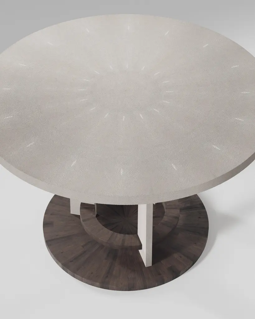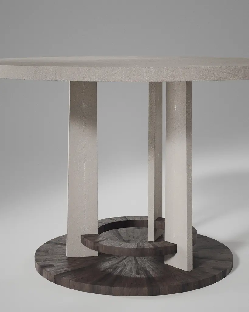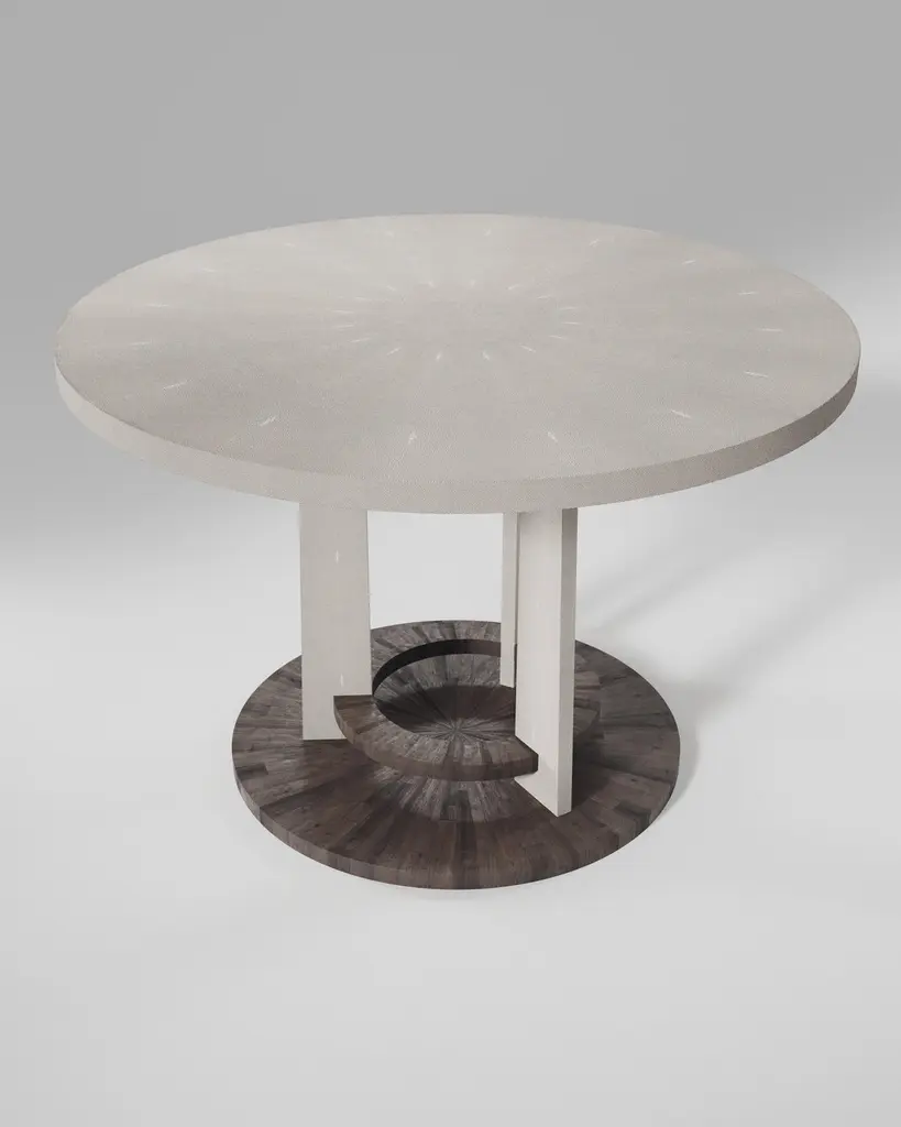 The Paris based label has distinguished themselves since their launch, with their iconic use of shagreen mixed with brass and other exotic materials. All furniture is handcrafted by skilled artisans, ultimately making each piece unique, designed in Paris and produced in the Philippines.The Prague Breakfast table by R&Y Augousti is an iconic design of their collection, debuting from the 1990s. This classic centre piece can be adapted for an entrance room or custom-sized for a dining room. The circular shaped cream shagreen inlaid top sits on a cluster of geometric inlaid shagreen legs that clasp into a floating palmwood inlaid ring and separate base. Available in black shagreen, see images at end of slide. Custom finishing/sizing available on request.The dimensions of this piece are 43.25" diameter x 29.5"All R & Y Augousti pieces are handmade by artisans, ultimately making each piece unique.Custom color or sizing available on request. Wipe clean with soft dry cloth.Acclaimed design duo Ria & Yiouri Augousti have established themselves since the 1990s as pioneers of modern-vintage style through their luxurious Art Deco inspired collections. The Paris based label has distinguished themselves since their launch, with their iconic use of shagreen mixed with brass and other exotic materials. All furniture is handcrafted by skilled artisans, ultimately making each piece unique.All shagreen-covered items should be kept out of direct sunlight, color variants may occur on the stingray and other exotic finishes, but this showcases the Parisian label's commitment to creating authentic luxurious products using natural components.