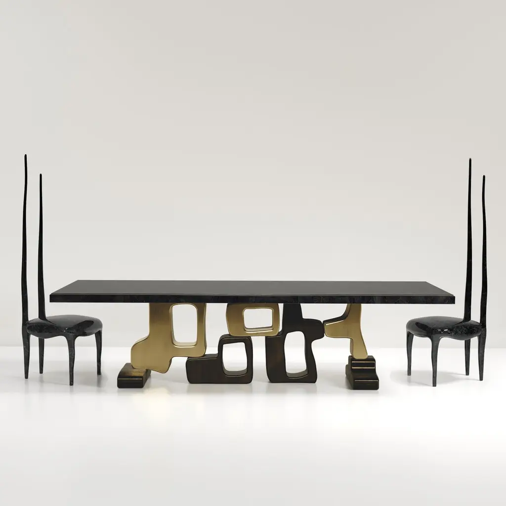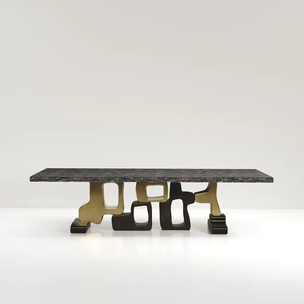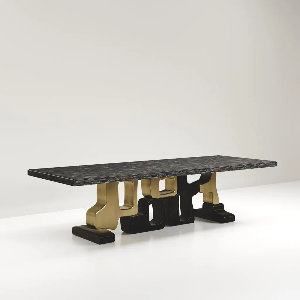 The Paris based label has distinguished themselves since their launch, with their iconic use of shagreen mixed with brass and other exotic materials. All furniture is handcrafted by skilled artisans, ultimately making each piece unique, designed in Paris and produced in the Philippines.The Apoli II dining table by Kifu Paris is both dramatic and organic its unique design. The black shagreen inlaid top sits on a long clustered geometric and sculptural bronze-patina brass base. This piece is designed by Kifu Augousti the daughter of Ria and Yiouri Augousti. Part of the Apoli Capsule Series, see images of collection at end of slide.The dimensions of this piece are 118.11 x 43.31 x 29.53 inchesAll Kifu Paris pieces are handmade by artisans, ultimately making each piece unique.Custom color/sizing available on request.Wipe clean with soft dry cloth.Although inspired by her parents, her collection of Home Accessories and Furniture is a distinct identity of its own. Kifu uses handmade techniques of elaborate inlay patterns of shagreen, shells, semi-precious stones, materials she experienced as a child growing up in her parent’s studio, but interpreted in a younger quirkier way reflecting her youth. From her "jewelry inspired knobs" on decorative boxes, gold bar boxes and an extravagant inlay pattern mix of shagreen and shell inspired by galactic constellations, as seen on her enormous round mirror, is refreshing to see. Kifu embodies whimsical elements throughout her collection and is not afraid to be daring and unexpected in her approach to design.All shagreen-covered items should be kept out of direct sunlight, color variants may occur on the stingray and other exotic finishes, but this showcases the Parisian label's commitment to creating authentic luxurious products using natural components.