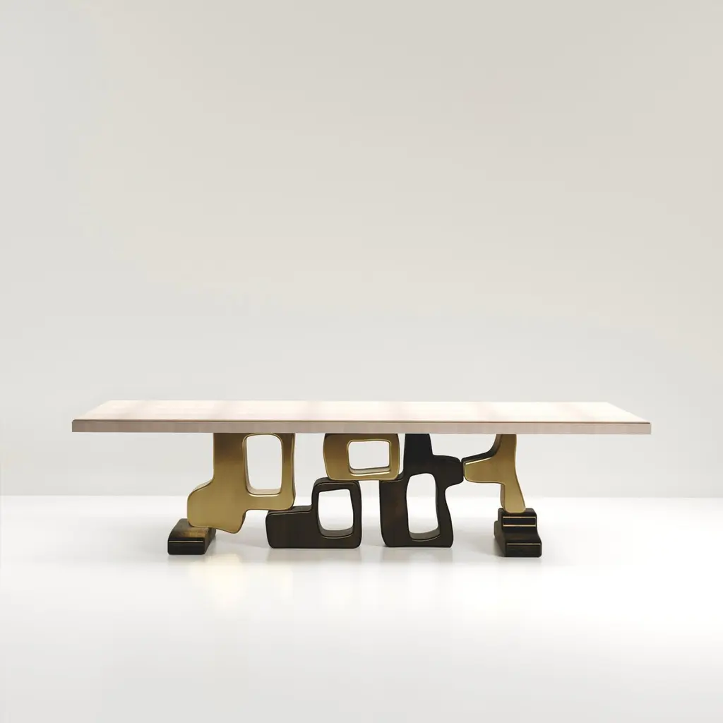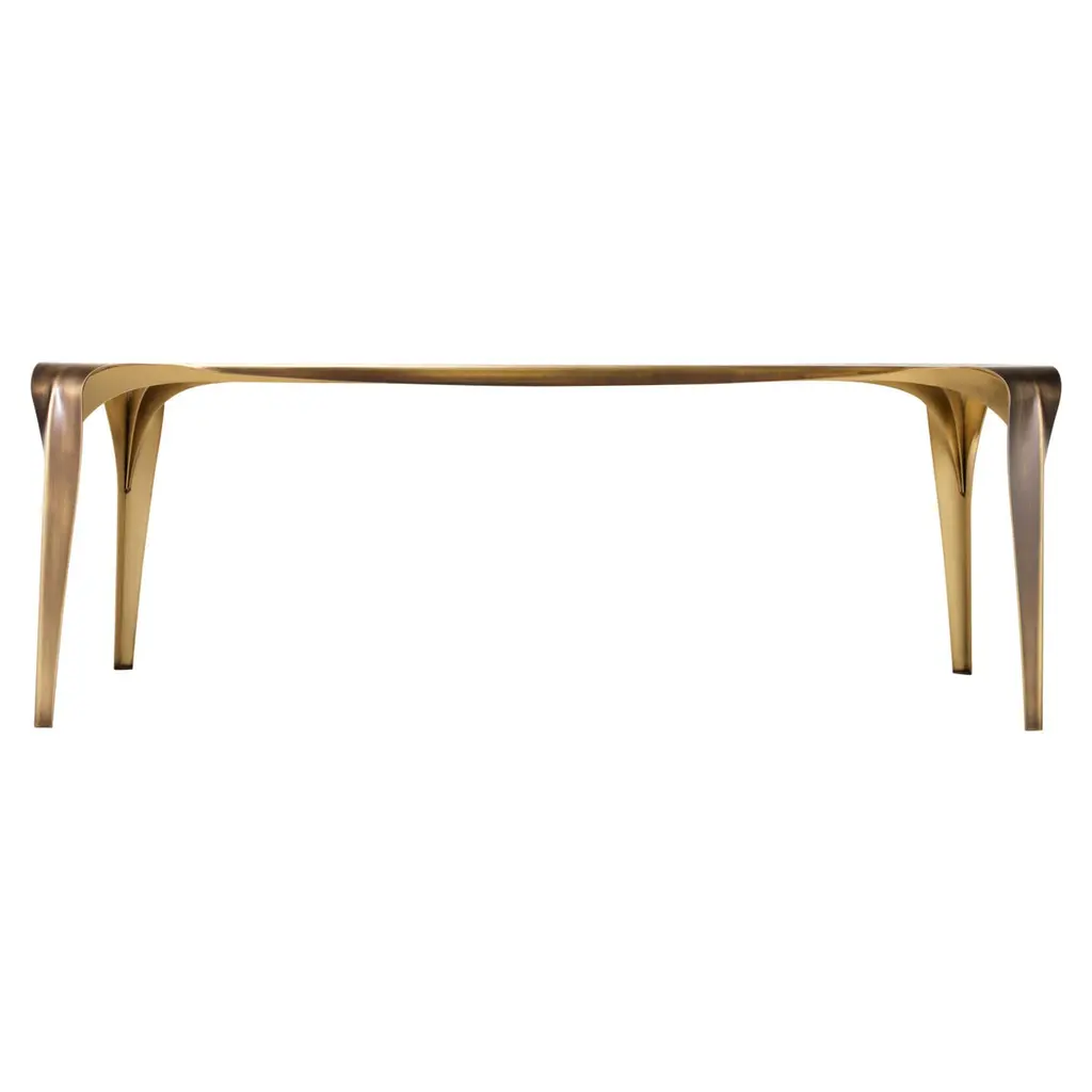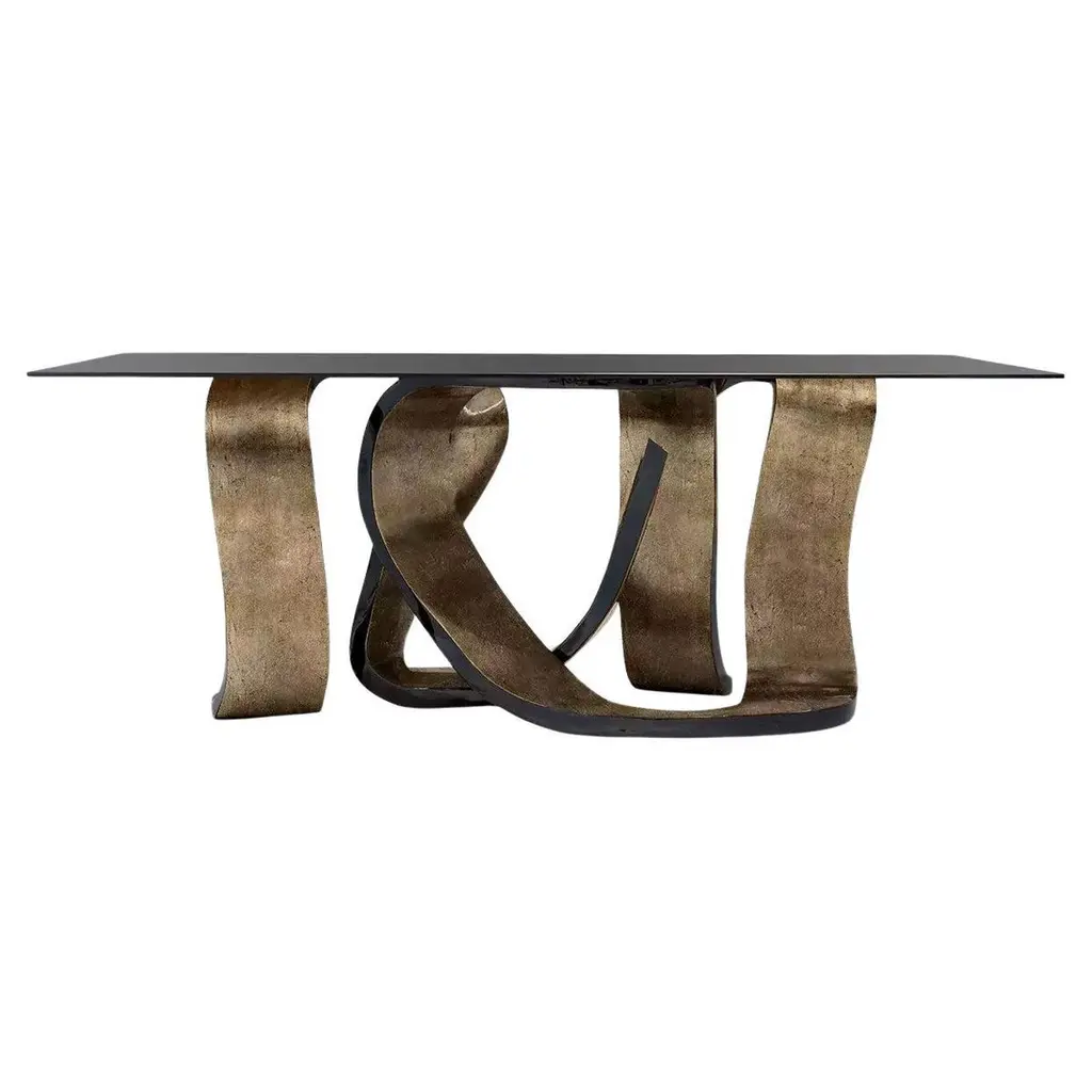 The Paris based label has distinguished themselves since their launch, with their iconic use of shagreen mixed with brass and other exotic materials. All furniture is handcrafted by skilled artisans, ultimately making each piece unique, designed in Paris and produced in the Philippines.The Apoli II dining table by Kifu Paris is both dramatic and organic its unique design. The black shagreen inlaid top sits on a long clustered geometric and sculptural bronze-patina brass base. This piece is designed by Kifu Augousti the daughter of Ria and Yiouri Augousti. Part of the Apoli Capsule Series, see images of collection at end of slide.The dimensions of this piece are 118.11 x 43.31 x 29.53 inchesAll Kifu Paris pieces are handmade by artisans, ultimately making each piece unique.Custom color/sizing available on request.Wipe clean with soft dry cloth.Although inspired by her parents, her collection of Home Accessories and Furniture is a distinct identity of its own. Kifu uses handmade techniques of elaborate inlay patterns of shagreen, shells, semi-precious stones, materials she experienced as a child growing up in her parent’s studio, but interpreted in a younger quirkier way reflecting her youth. From her "jewelry inspired knobs" on decorative boxes, gold bar boxes and an extravagant inlay pattern mix of shagreen and shell inspired by galactic constellations, as seen on her enormous round mirror, is refreshing to see. Kifu embodies whimsical elements throughout her collection and is not afraid to be daring and unexpected in her approach to design.All shagreen-covered items should be kept out of direct sunlight, color variants may occur on the stingray and other exotic finishes, but this showcases the Parisian label's commitment to creating authentic luxurious products using natural components.