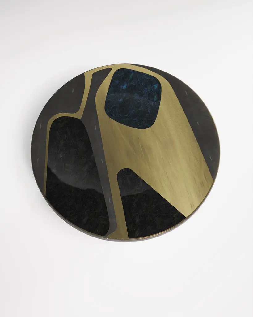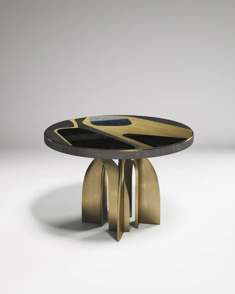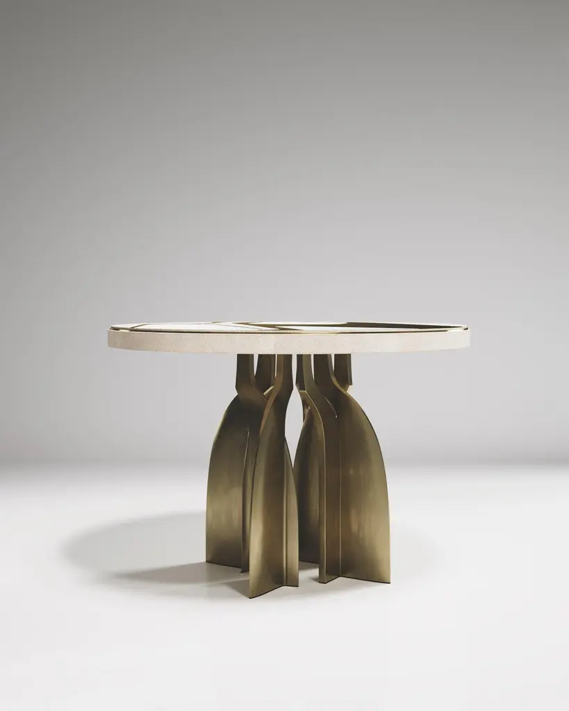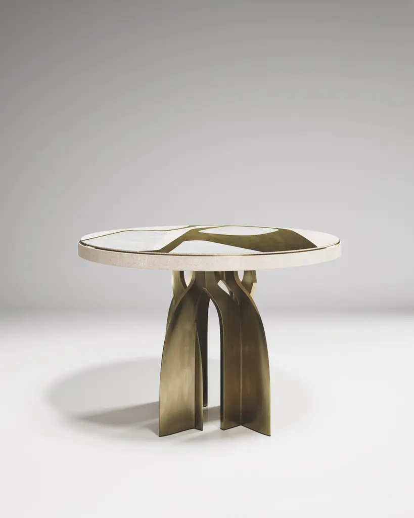 The Paris based label has distinguished themselves since their launch, with their iconic use of shagreen mixed with brass and other exotic materials. All furniture is handcrafted by skilled artisans, ultimately making each piece unique, designed in Paris and produced in the Philippines.The Chital Breakfast table is a stunning piece, a statement in any space. The mix inlay top in cream shagreen, mother of pearl and bronze-patina brass brings another beautiful dimension to showcase the graphic Cosmos pattern designed by R&Y Augousti. The top is followed by bronze-patina brass sculptural legs clustered together as the base. This piece is designed by Kifu Augousti, the daughter of Ria & Yiouri Augousti. Available in other finishes and iterations, see images at end of slide.The dimensions of this piece are 110 x 110 x 75 cmAll Kifu Paris pieces are handmade by artisans, ultimately making each piece unique. Custom color or sizing available on request. Wipe clean with soft dry cloth.Although inspired by her parents, her collection of Home Accessories and Furniture is a distinct identity of its own. Kifu uses handmade techniques of elaborate inlay patterns of shagreen, shells, semi-precious stones, materials she experienced as a child growing up in her parent’s studio, but interpreted in a younger quirkier way reflecting her youth. From her "jewelry inspired knobs" on decorative boxes, gold bar boxes and an extravagant inlay pattern mix of shagreen and shell inspired by galactic constellations, as seen on her enormous round mirror, is refreshing to see. Kifu embodies whimsical elements throughout her collection and is not afraid to be daring and unexpected in her approach to design. All shagreen-covered items should be kept out of direct sunlight, color variants may occur on the stingray and other exotic finishes, but this showcases the Parisian label's commitment to creating authentic luxurious products using natural components.