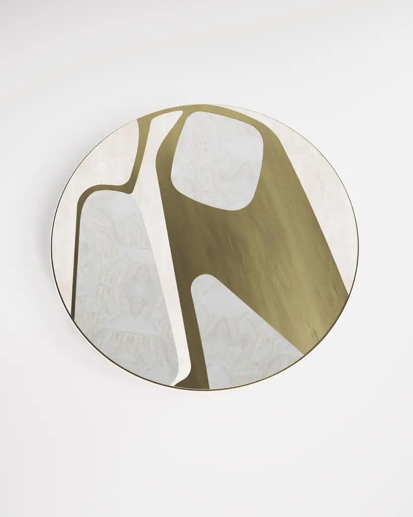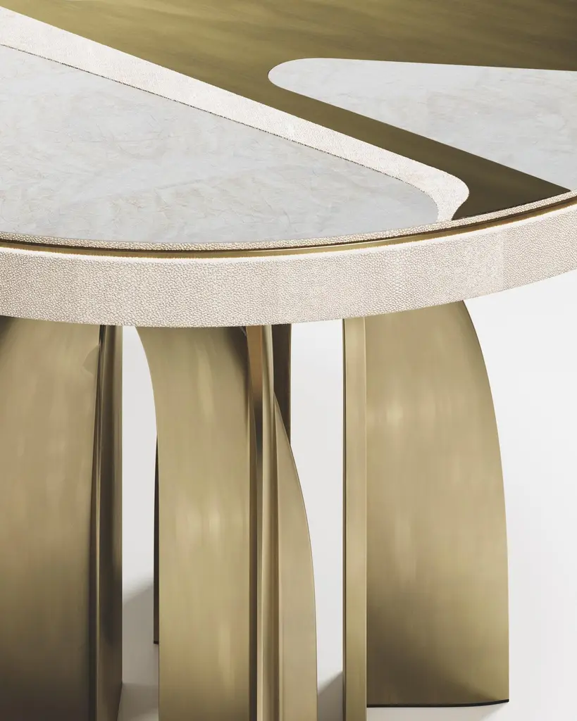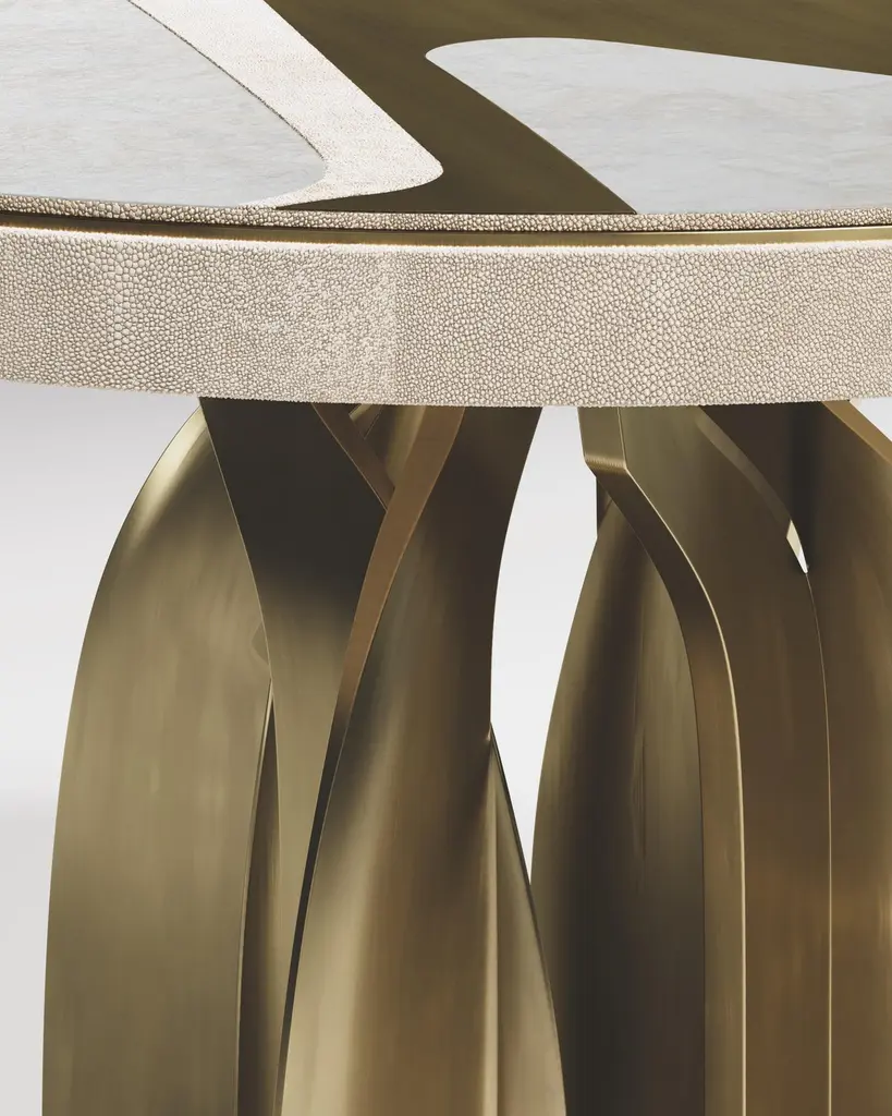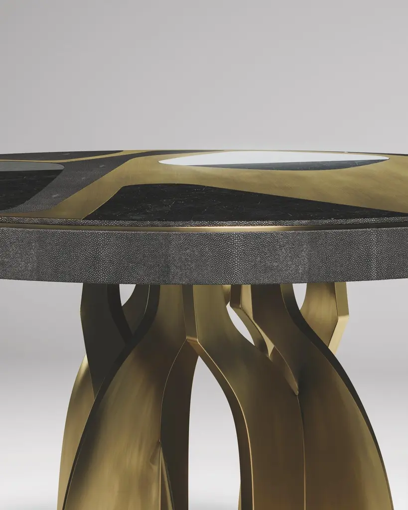 The Paris based label has distinguished themselves since their launch, with their iconic use of shagreen mixed with brass and other exotic materials. All furniture is handcrafted by skilled artisans, ultimately making each piece unique, designed in Paris and produced in the Philippines.The Chital Breakfast table is a stunning piece, a statement in any space. The mix inlay top in black shagreen, blue and black pen shell and bronze-patina brass brings another beautiful dimension to showcase the graphic Cosmos pattern designed by R&Y Augousti. The top is followed by bronze-patina brass sculptural legs clustered together as the base. This piece is designed by Kifu Augousti, the daughter of Ria & Yiouri Augousti. Available in other finishes and iterations, see images at end of slide.The dimensions of this piece are 110 x 110 x 75 cmAll Kifu Paris pieces are handmade by artisans, ultimately making each piece unique. Custom color or sizing available on request. Wipe clean with soft dry cloth.Although inspired by her parents, her collection of Home Accessories and Furniture is a distinct identity of its own. Kifu uses handmade techniques of elaborate inlay patterns of shagreen, shells, semi-precious stones, materials she experienced as a child growing up in her parent’s studio, but interpreted in a younger quirkier way reflecting her youth. From her "jewelry inspired knobs" on decorative boxes, gold bar boxes and an extravagant inlay pattern mix of shagreen and shell inspired by galactic constellations, as seen on her enormous round mirror, is refreshing to see. Kifu embodies whimsical elements throughout her collection and is not afraid to be daring and unexpected in her approach to design. All shagreen-covered items should be kept out of direct sunlight, color variants may occur on the stingray and other exotic finishes, but this showcases the Parisian label's commitment to creating authentic luxurious products using natural components.