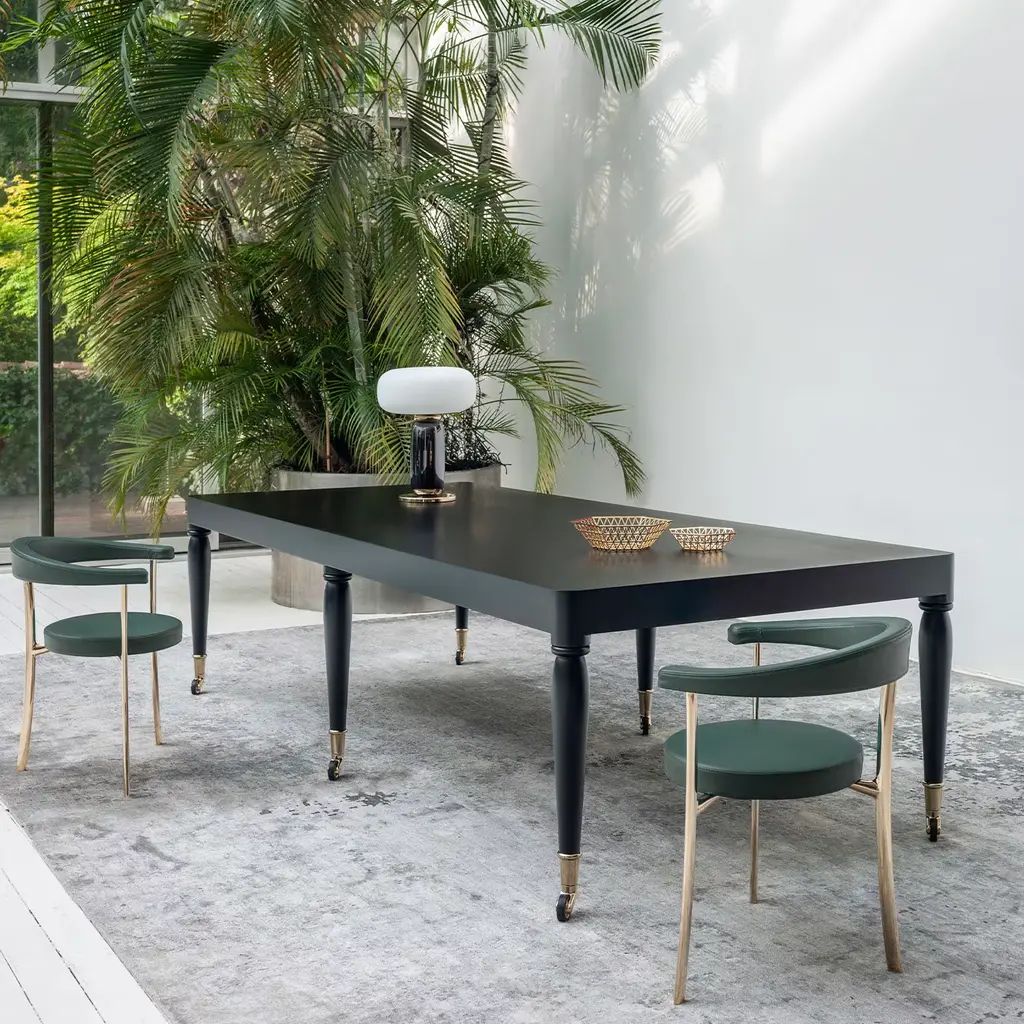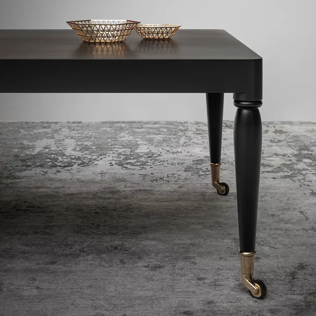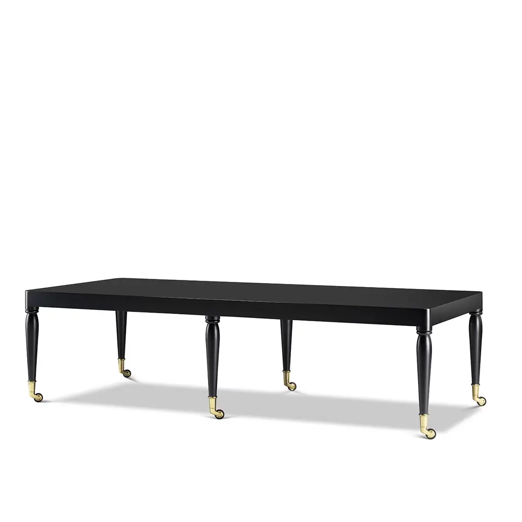 An exclusive addition to a modern, contemporary, or eclectic dining room that can be easily repositioned whenever desired, this table was designed by Stefano Giovannoni to serve as the epitome of class and practicality. Deftly turned legs accented with wheeled glistening brass feet sustain the wide top, with shares the same matte black-lacquered finish with the rest of the wooden frame.