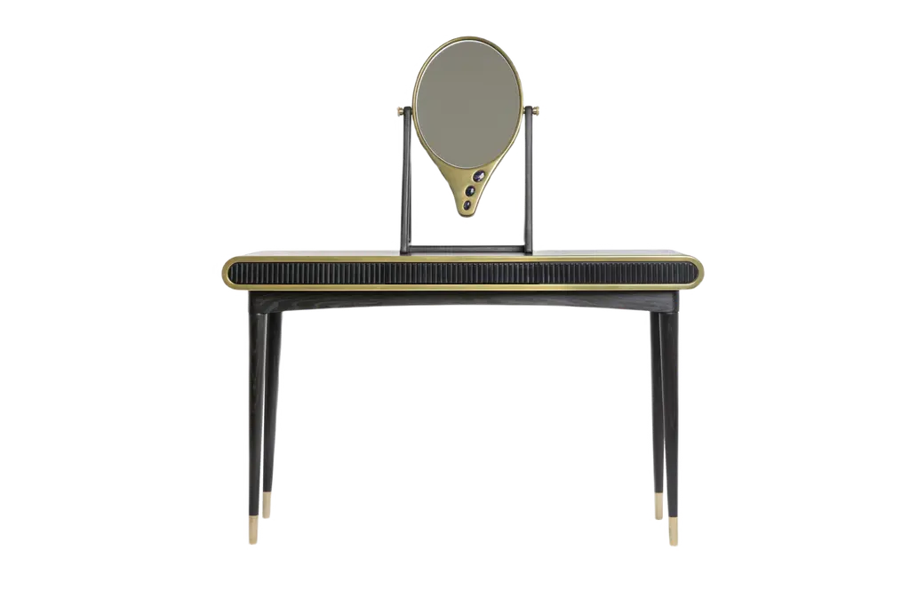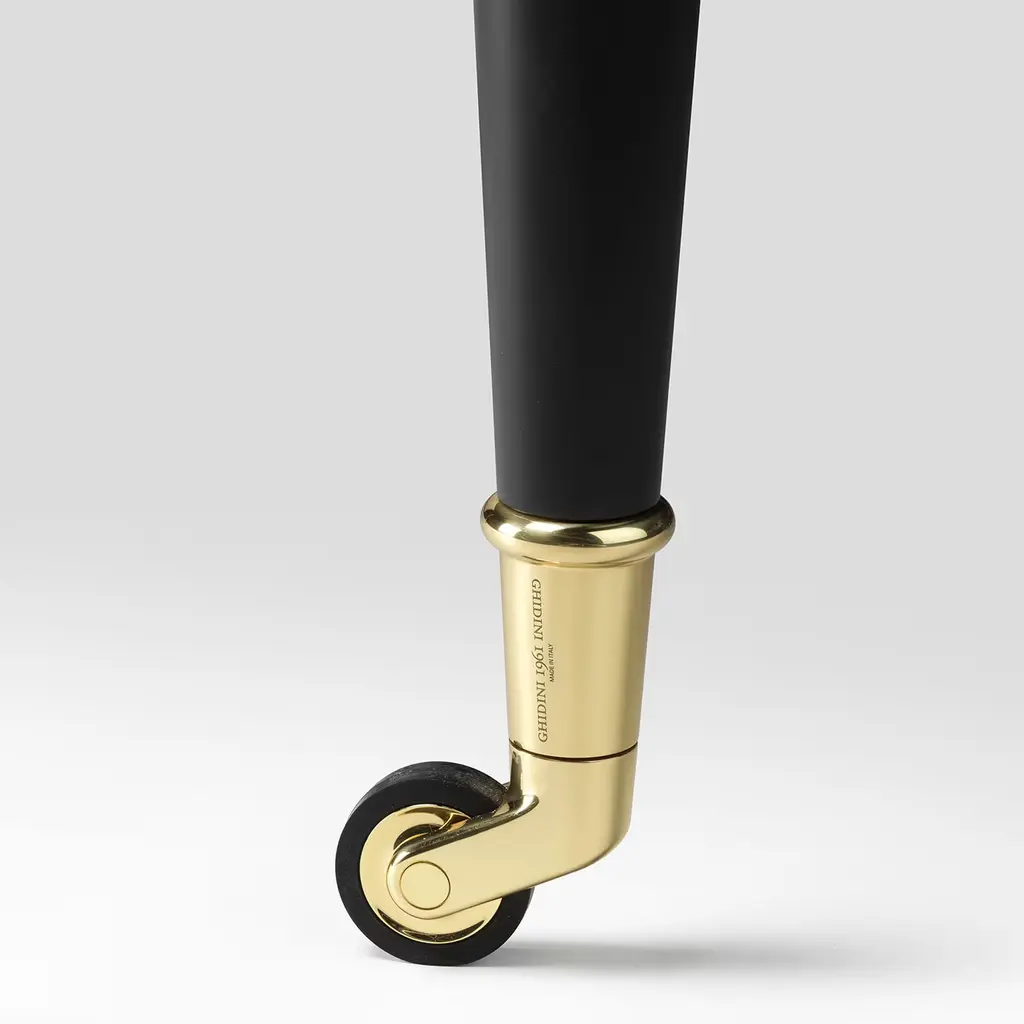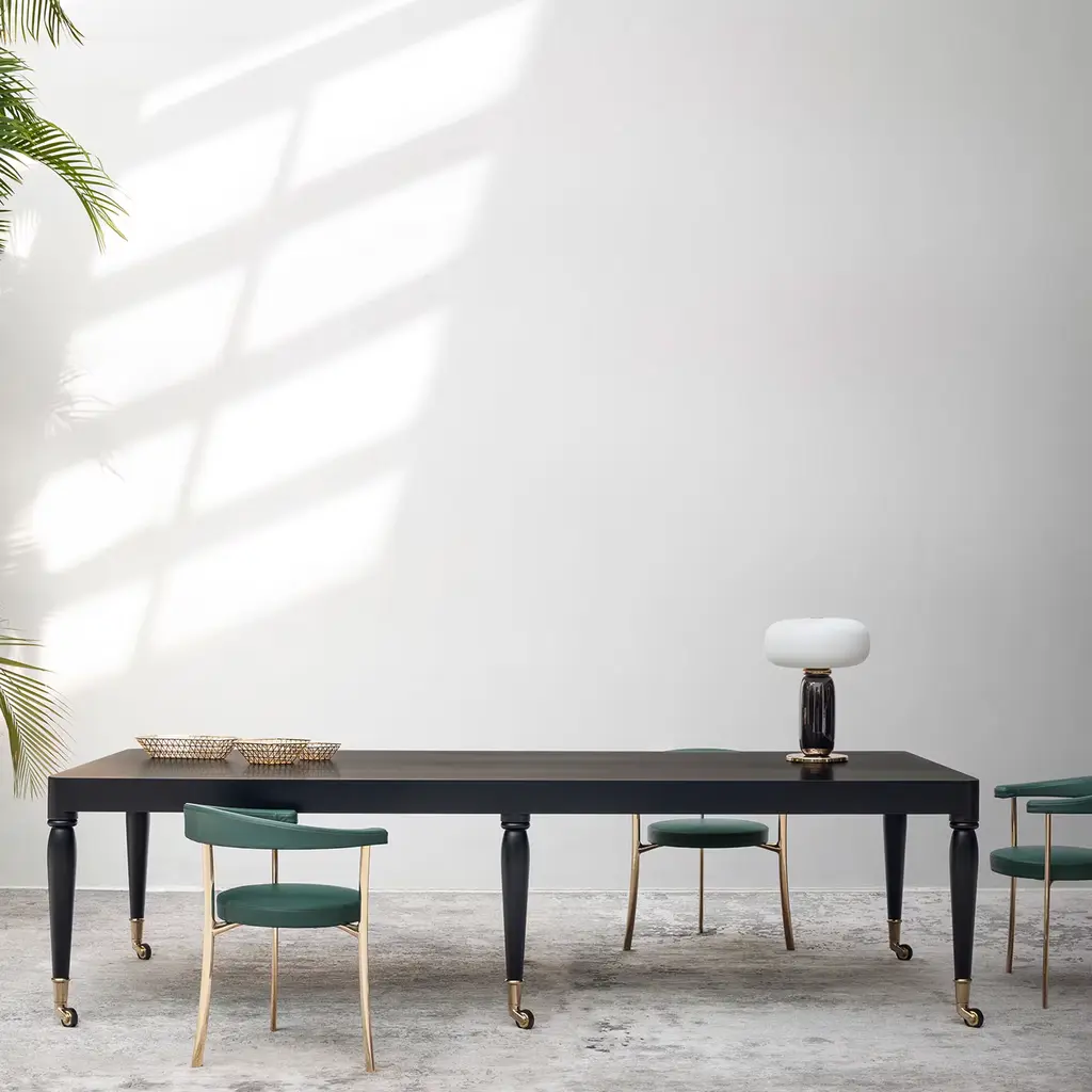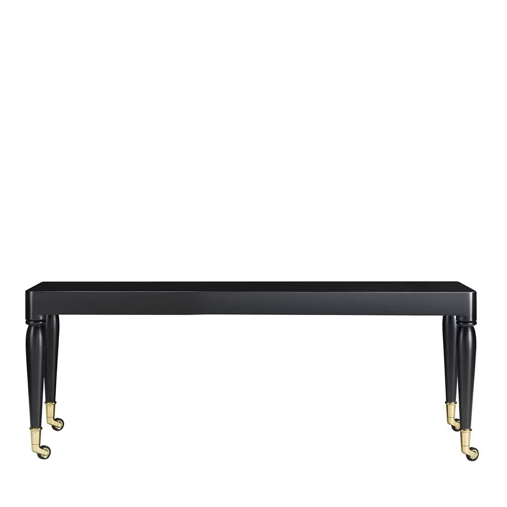 An exclusive addition to a modern, contemporary, or eclectic dining room that can be easily repositioned whenever desired, this table was designed by Stefano Giovannoni to serve as the epitome of class and practicality. Deftly turned legs accented with wheeled glistening brass feet sustain the wide top, with shares the same matte black-lacquered finish with the rest of the wooden frame.