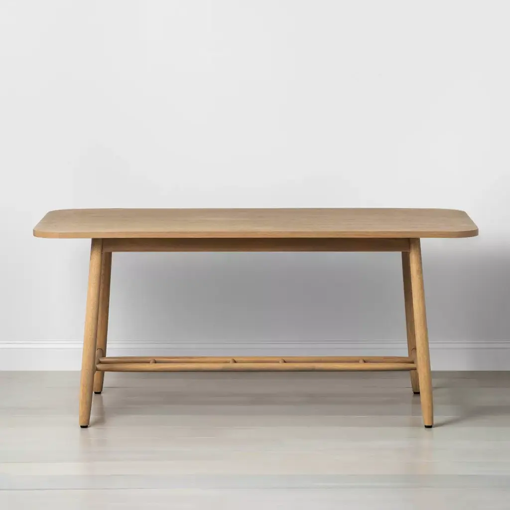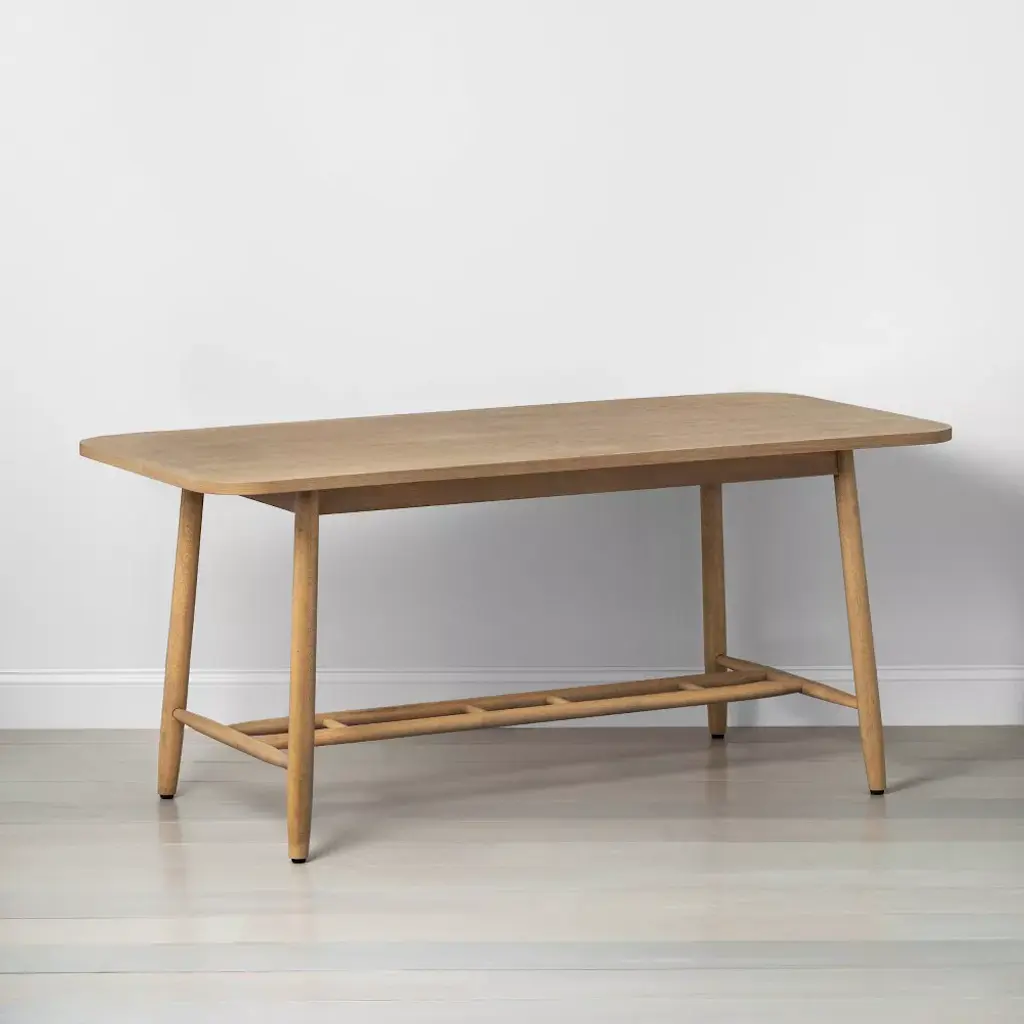 Anchor your dining room or eat-in kitchen for casual meals and dinner parties alike with this Shaker Dining Table from Hearth & Hand™ with Magnolia. Crafted with solid rubberwood, this wooden dining table features ladderlike bar accents between the legs for added interest, while the adjustable leveling helps you find stability on any flooring. Pair this rounded rectangular dining table with matching chairs to give your home a warm, inviting vibe.Celebrate the everyday with Hearth & Hand — created exclusively for Target in collaboration with Magnolia, a home and lifestyle brand by Chip & Joanna Gaines. Built upon our shared commitment to giving back to our communities, these pieces reveal the beauty of everyday moments shared with family and friends.Overall Length: 68 inchesDistance Length between Legs: 50.98 inchesOverall Width: 32 inchesDistance Width between Legs: 24.72 inchesOverall Height: 30.25 inchesHeight from Floor to Stretcher: 6.61 inches