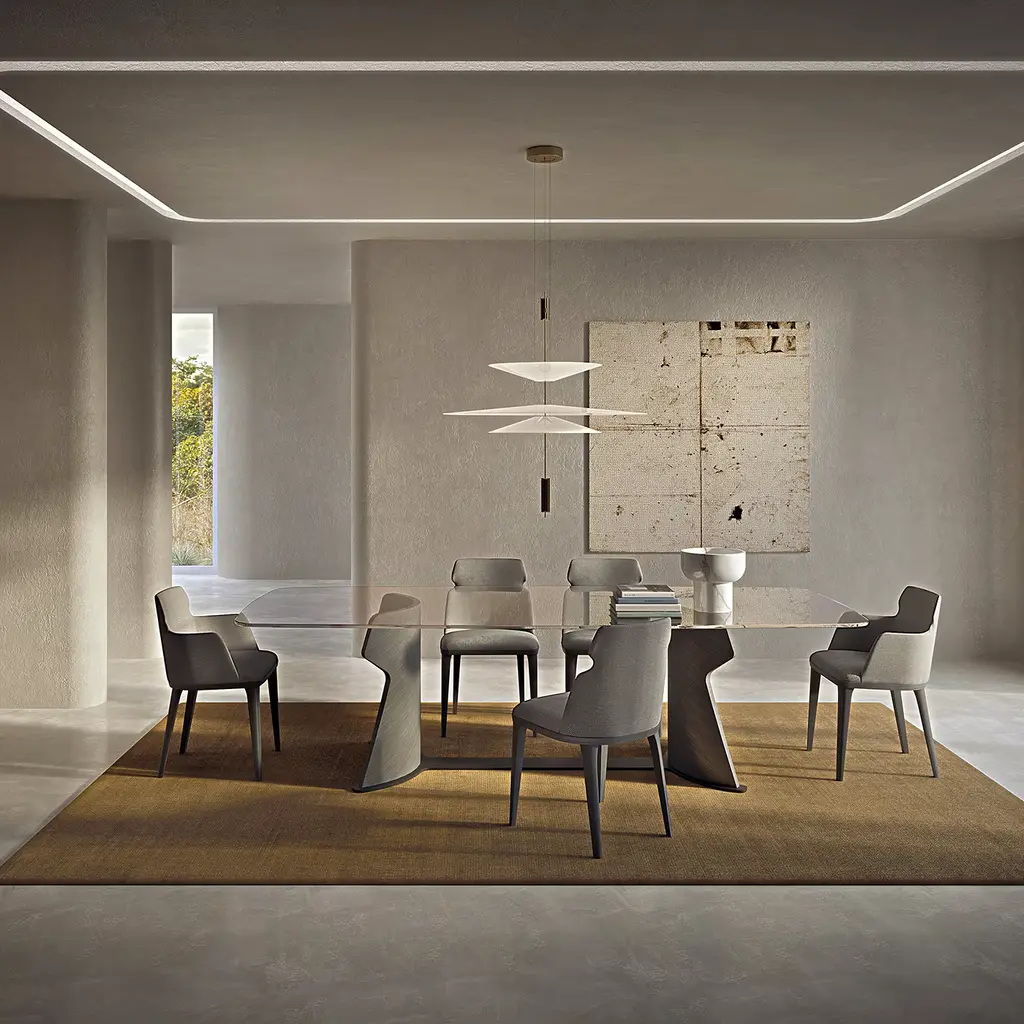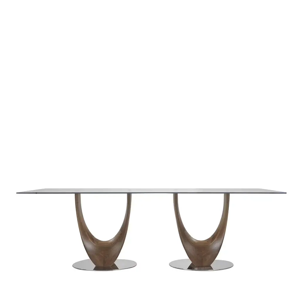 The superb zig-zag legs characterizing this striking dining table are revealed through a sleek, extra-clear glass top, making this one-off piece a wonderful complement to contemporary or minimalist interiors alike. Resting on a lead-finished metal flat base, the two legs are fashioned of prized woods finished in a dark Tay nuance. Their shape draws inspiration from the primitive architecture on Easter Island. This piece is customizable, please ask the Concierge for details.