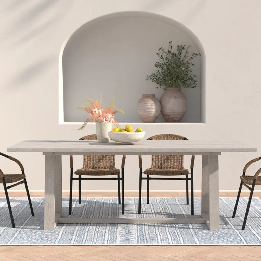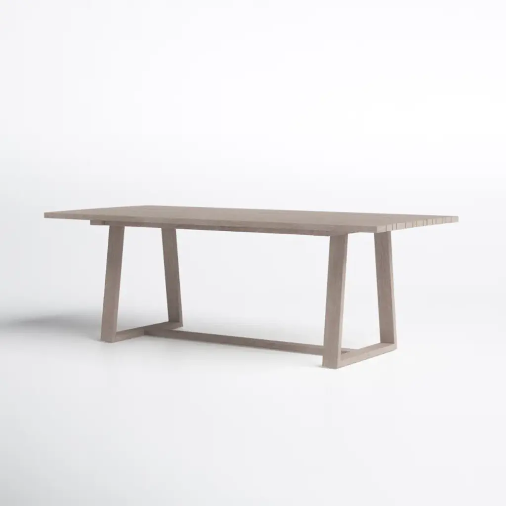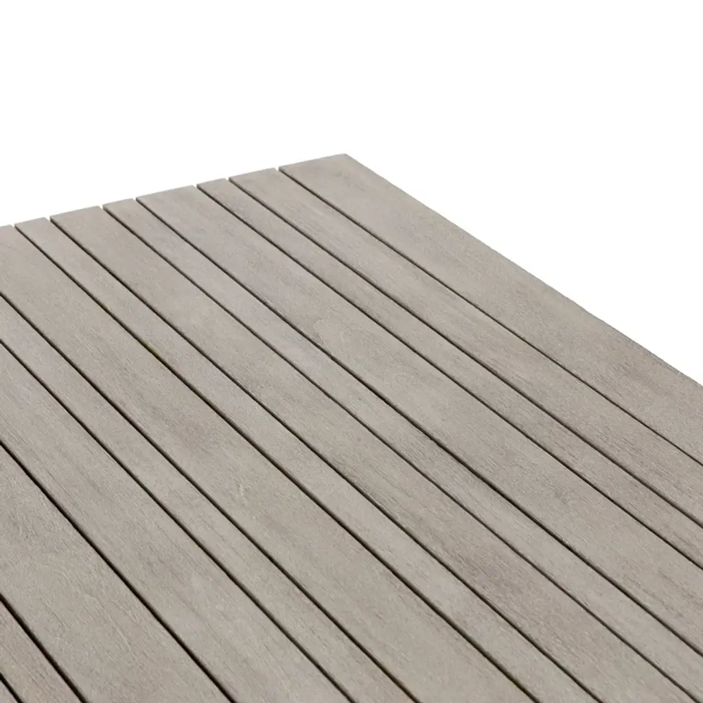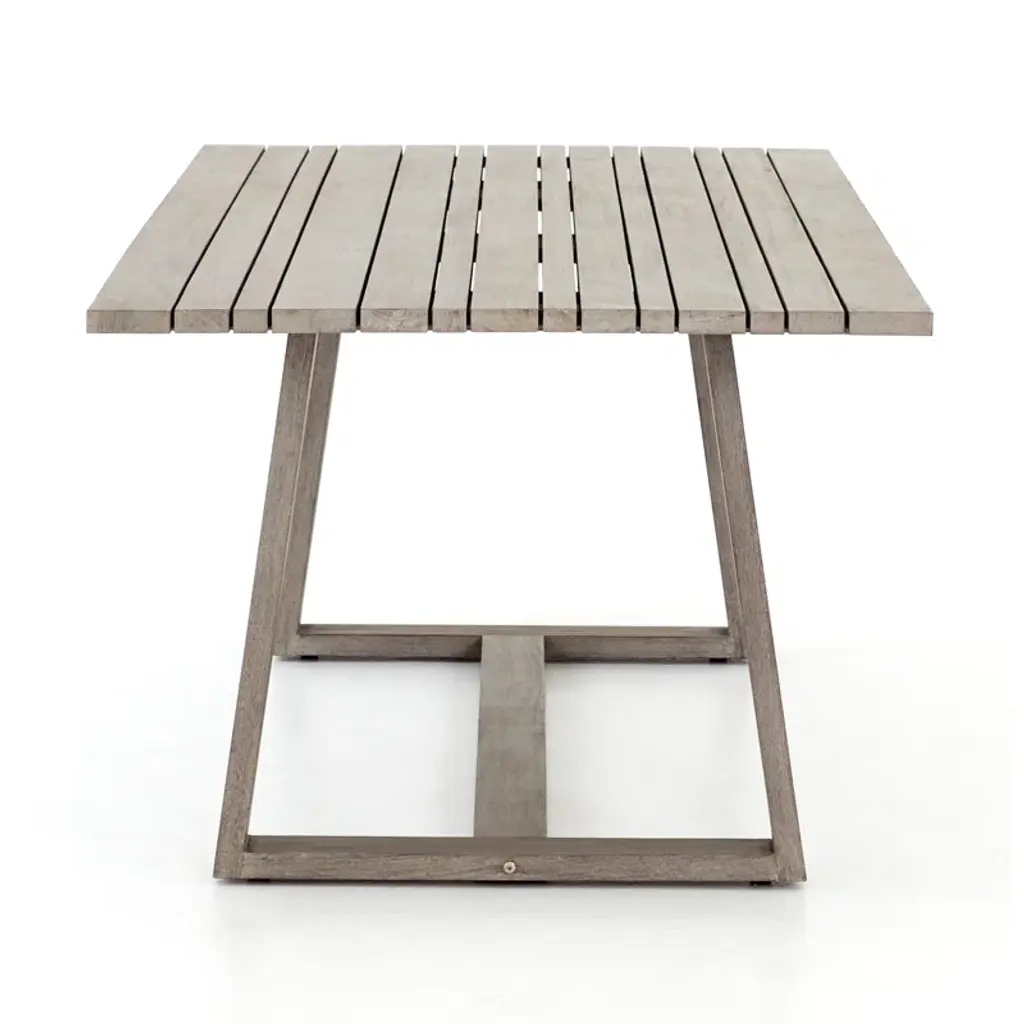 An angular base brings architectural appeal to the dining table. Planks of weathered gray teak provide plenty of tablespace, perfect for outdoor entertaining. Cover or store indoors during inclement weather and when not in use.