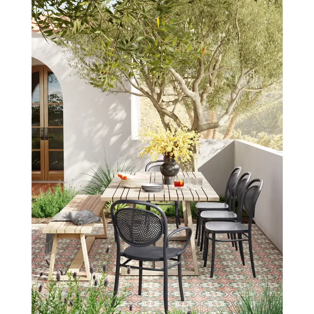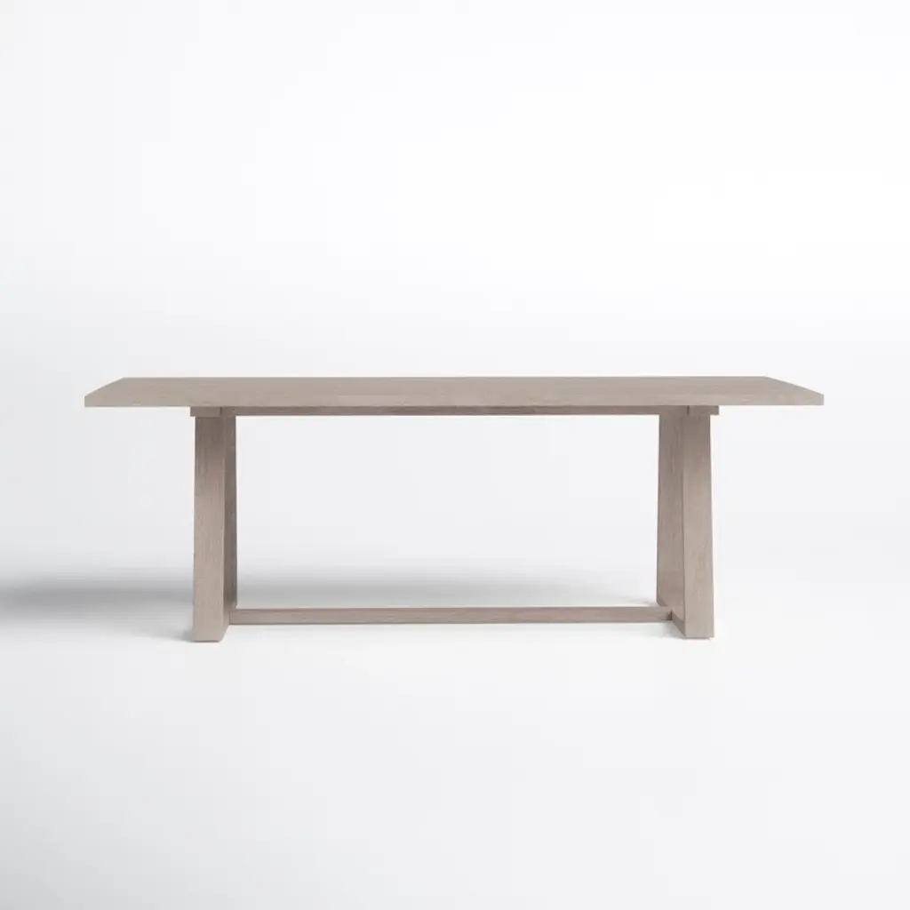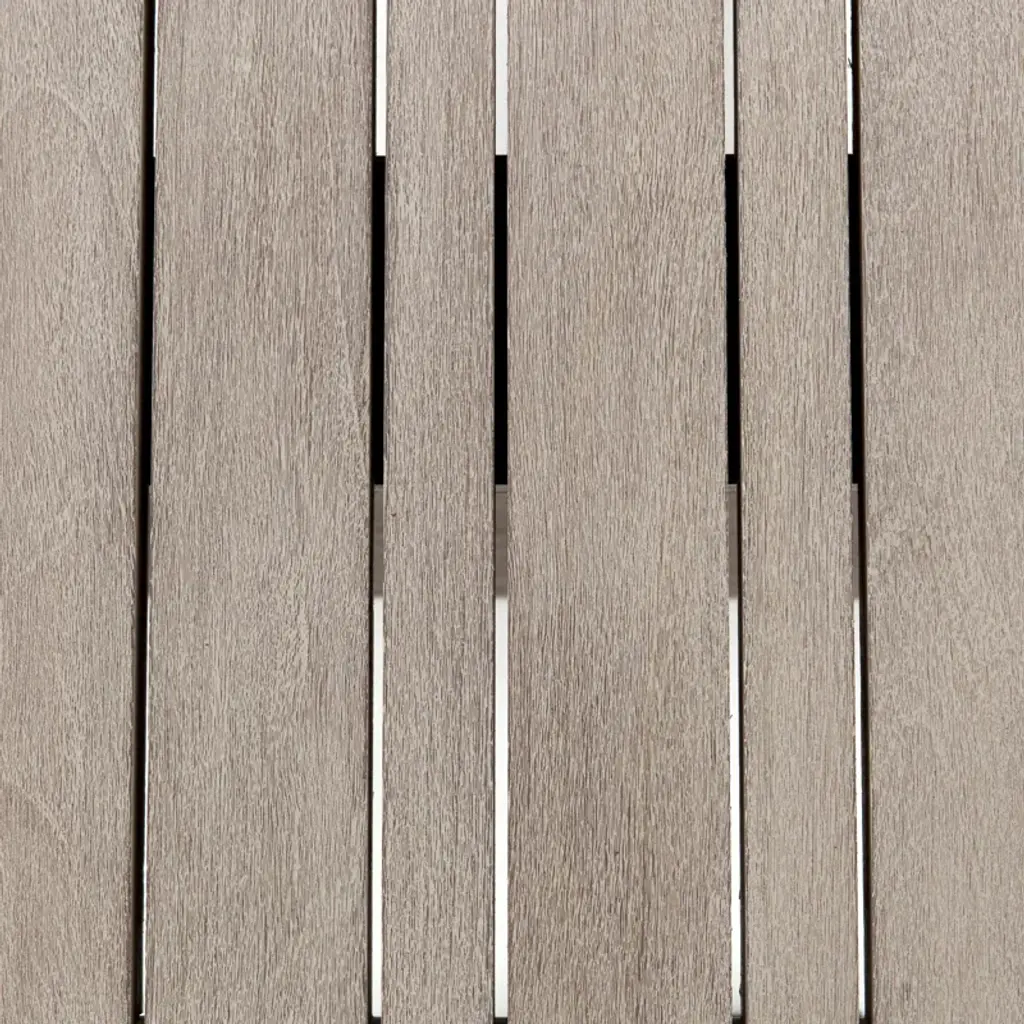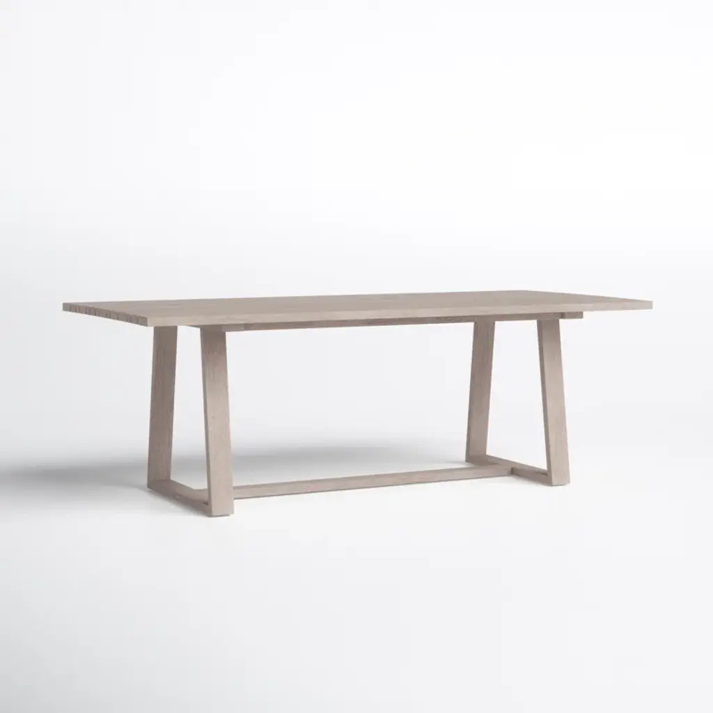 An angular base brings architectural appeal to the dining table. Planks of weathered gray teak provide plenty of tablespace, perfect for outdoor entertaining. Cover or store indoors during inclement weather and when not in use.