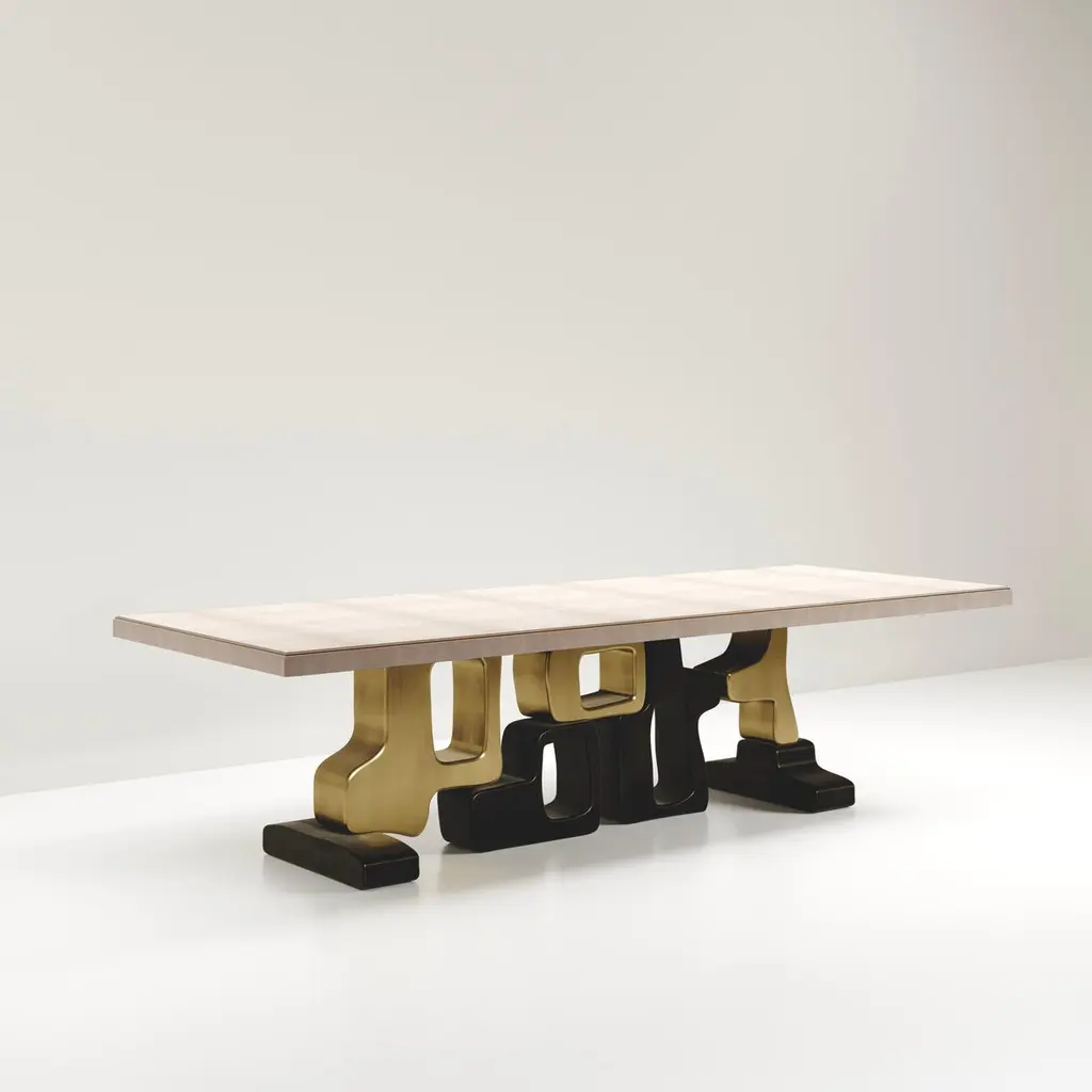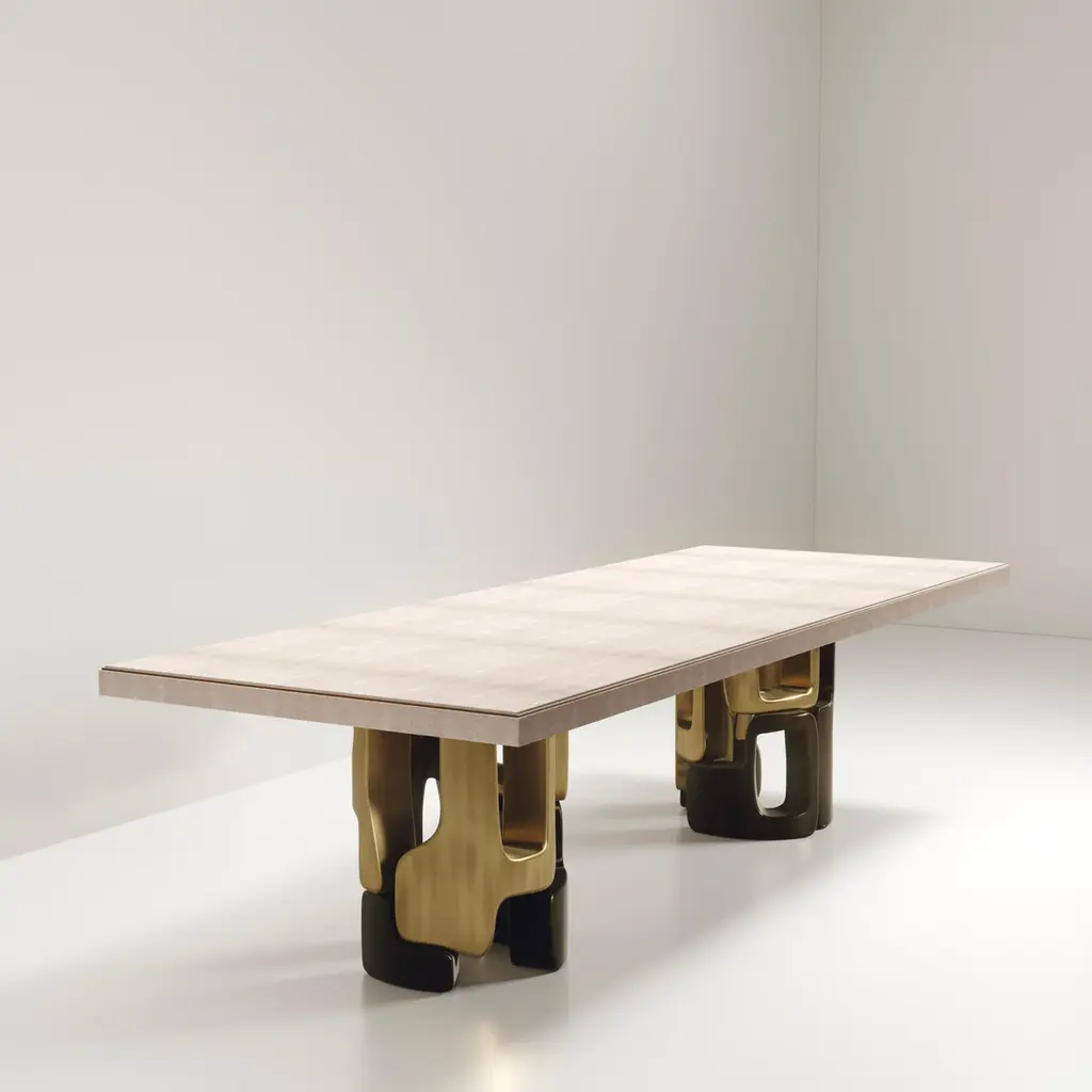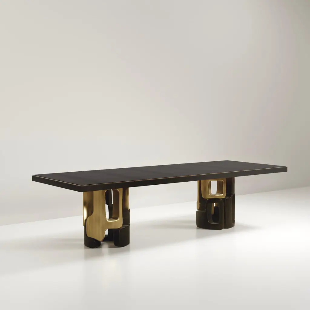 The Paris based label has distinguished themselves since their launch, with their iconic use of shagreen mixed with brass and other exotic materials. All furniture is handcrafted by skilled artisans, ultimately making each piece unique, designed in Paris and produced in the Philippines.The Apoli I dining table by Kifu Paris is both dramatic and organic its unique design. The black pen shell inlaid top sits on a pair of geometric and sculptural bronze-patina brass bases. This piece is designed by Kifu Augousti the daughter of Ria and Yiouri Augousti. Part of the Apoli Capsule Series, see images of collection at end of slide.The dimensions of this piece are 118.11 x 43.31 x 29.53 inchesAll Kifu Paris pieces are handmade by artisans, ultimately making each piece unique.Custom color/sizing available on request.Wipe clean with soft dry cloth.Although inspired by her parents, her collection of Home Accessories and Furniture is a distinct identity of its own. Kifu uses handmade techniques of elaborate inlay patterns of shagreen, shells, semi-precious stones, materials she experienced as a child growing up in her parent’s studio, but interpreted in a younger quirkier way reflecting her youth. From her "jewelry inspired knobs" on decorative boxes, gold bar boxes and an extravagant inlay pattern mix of shagreen and shell inspired by galactic constellations, as seen on her enormous round mirror, is refreshing to see. Kifu embodies whimsical elements throughout her collection and is not afraid to be daring and unexpected in her approach to design.All shagreen-covered items should be kept out of direct sunlight, color variants may occur on the stingray and other exotic finishes, but this showcases the Parisian label's commitment to creating authentic luxurious products using natural components.