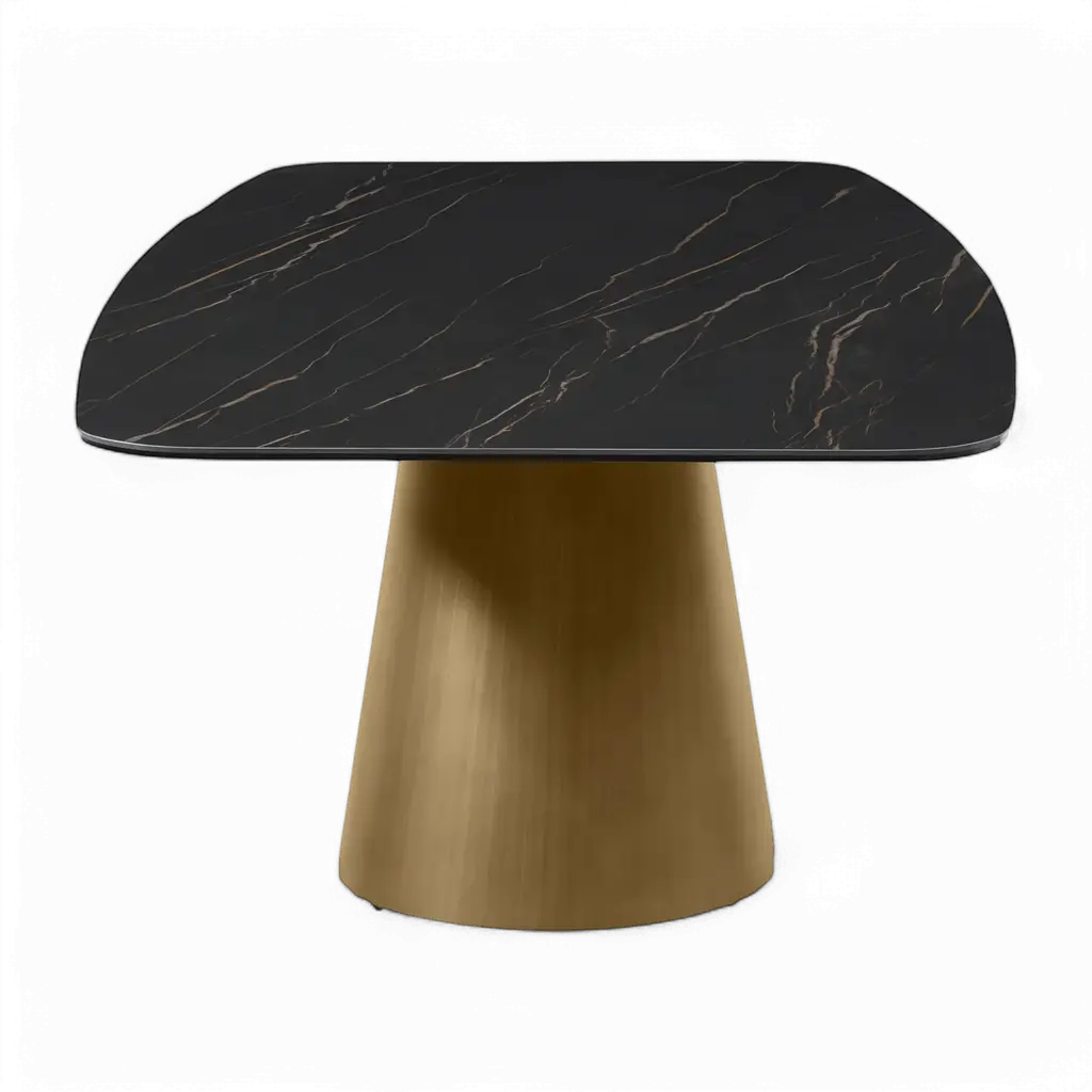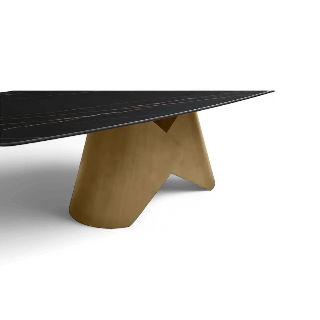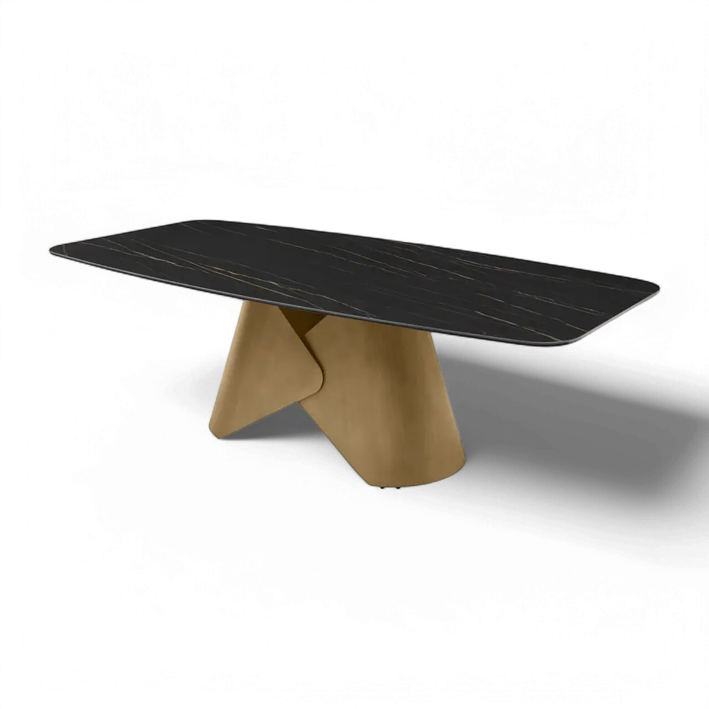 The Siena Dining Table Black is a striking blend of modern elegance and sophisticated design. The sleek, black matte ceramic top features a rounded rectangular shape, creating a smooth, inviting surface with a contemporary feel. The table's base showcases an eye-catching geometric structure in a brass finish, adding a touch of warmth and luxury to its minimalist silhouette. The combination of the dark ceramic top and the brass-colored base creates a refined contrast, making the Siena Dining Table a bold yet versatile piece that enhances any dining space with style and functionality. Also available in White.Top: Black Matte Ceramic, Tempered Glass | Legs: Brushed Brass Finish | Inner Frame: Metal | Leg/Base Material: Metal | Seating Capacity: 6-8