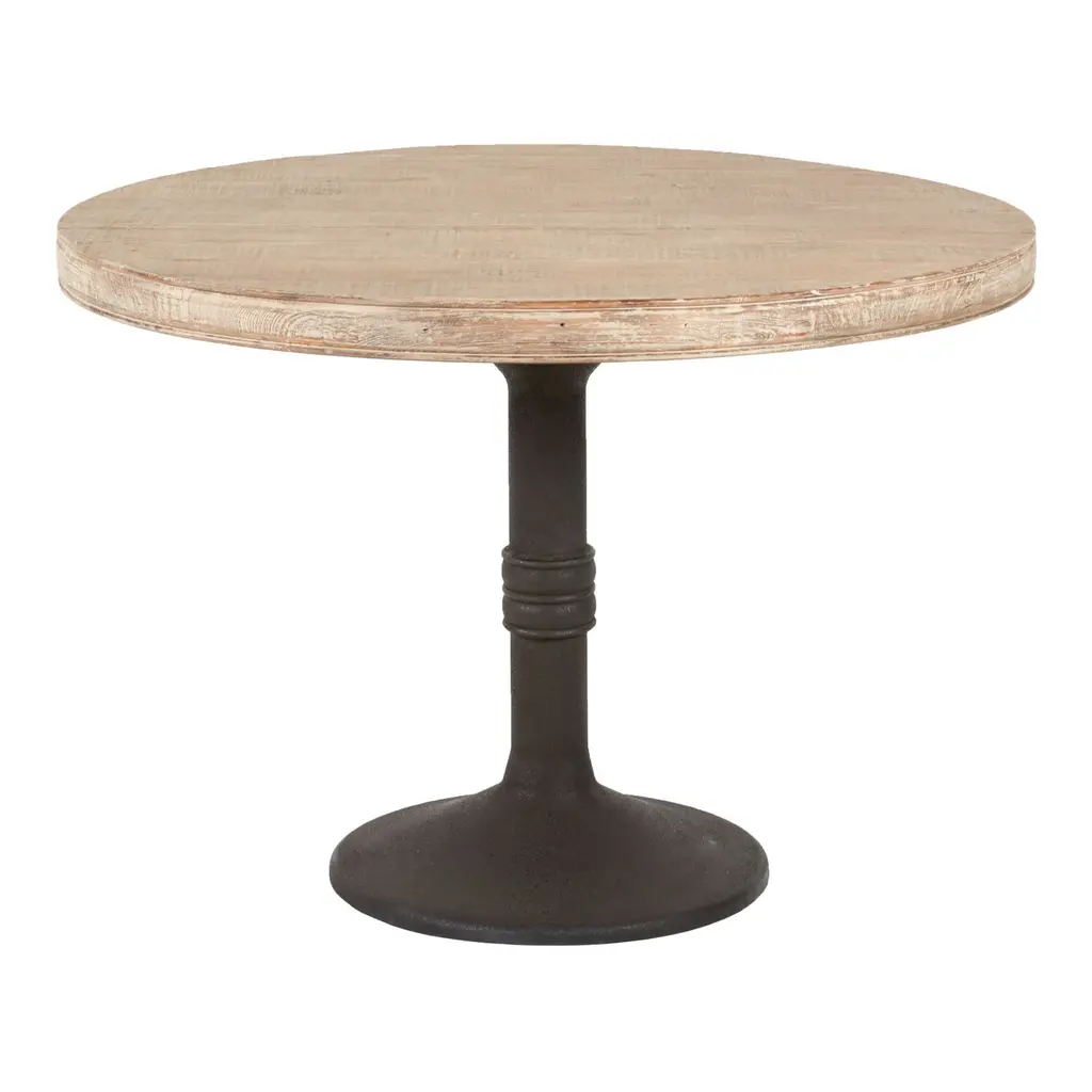 With a rustic surface crafted from reclaimed pine wood, our round dining table is an industrial-modern centerpiece perfectly sized for small spaces. A hand-forged metal pedestal base with detailing adds extra intrigue to this unique piece.