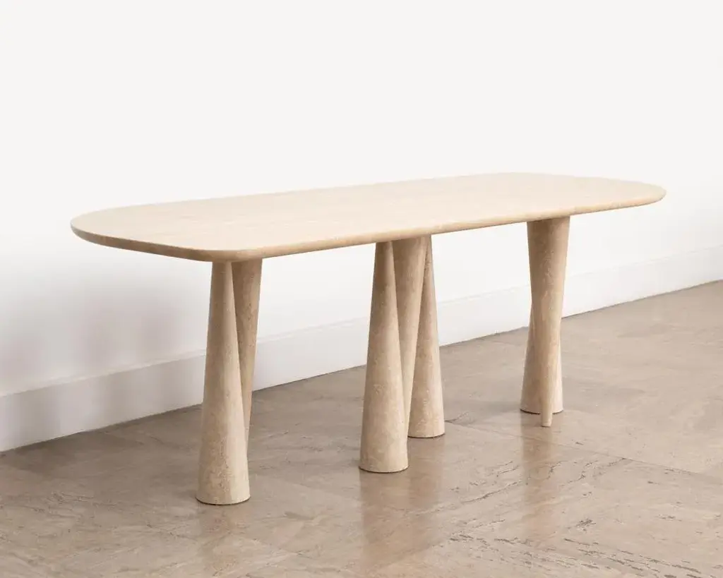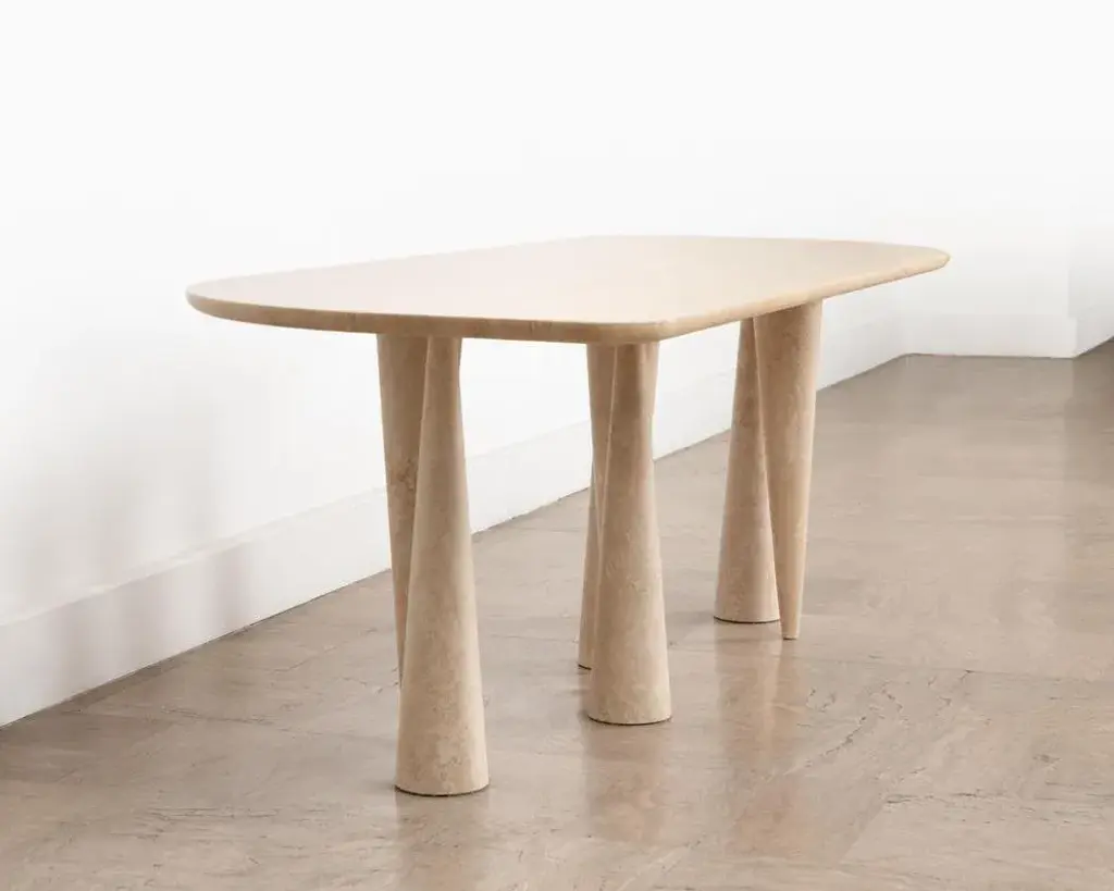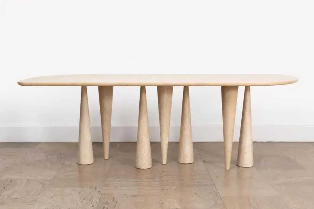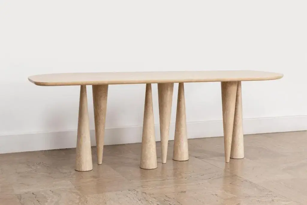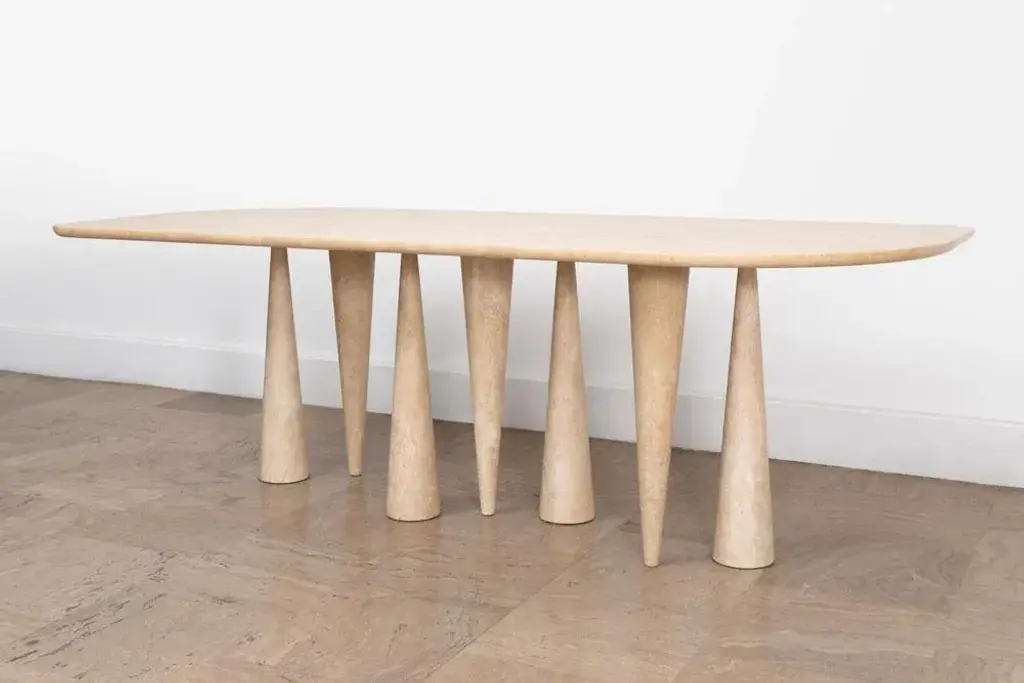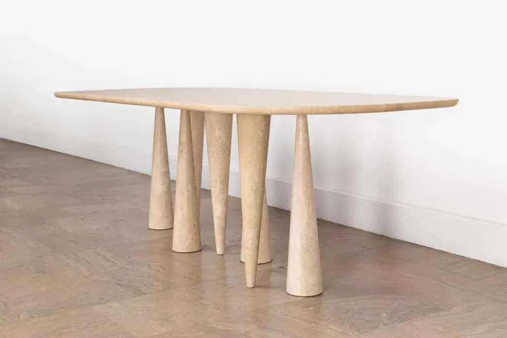 Silvia medium dining table by Moure Studio Dimensions: D 80 x W 40 x H 80 cm. Materials: Travertine. Also available in different dimensions. Dining table made of travertine. Silvia translates its mineral inspiration into abstract shapes which leaves a great space to imagination : some will see a snowy forest, others will see an animal wandering or even maybe stalactites. Moure / Studio is a Parisian interdisciplinary design studio founded in 2015 and specialised in interior design and furniture design. At Moure / Studio, we believe that emotion and confort arise from color and material, with sober design. This style is inspired by painting and artistics movements such as as the Bauhaus, De Stijl & the Memphis movement. We like to create sensitive atmospheres through exclusive sleek design which respects the architectural volumes and spotlights the vibration of color. Our ethics lead us to collaborate with craftsmen and women who share with us their know-how. We are convinced that enrichment requires the pooling of several talents. Our passion for sharing and being open to the world pushes us towards working on worldwide projects.