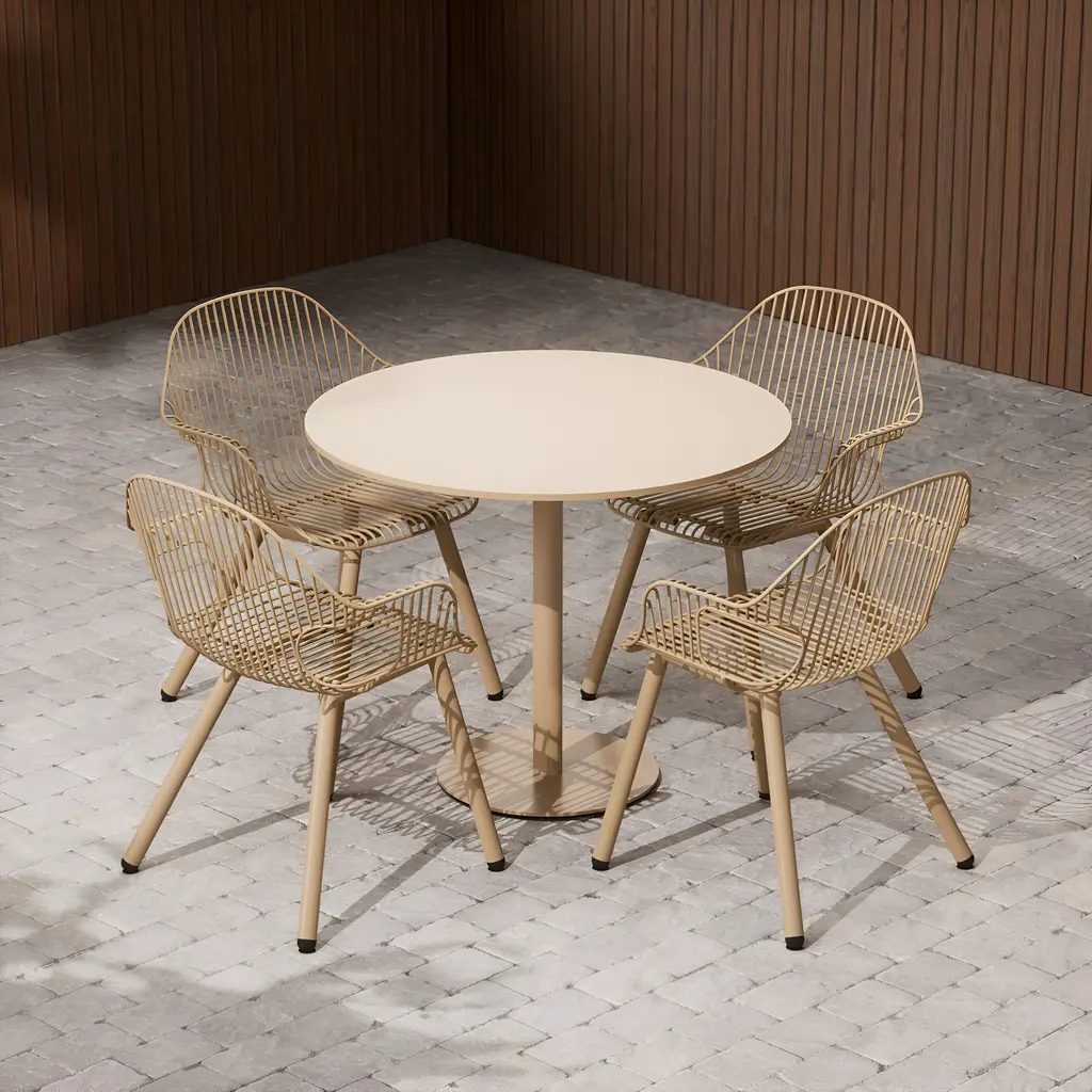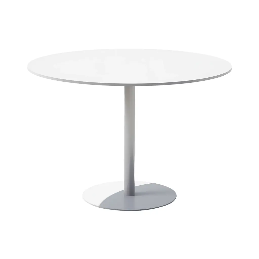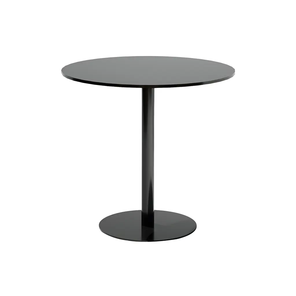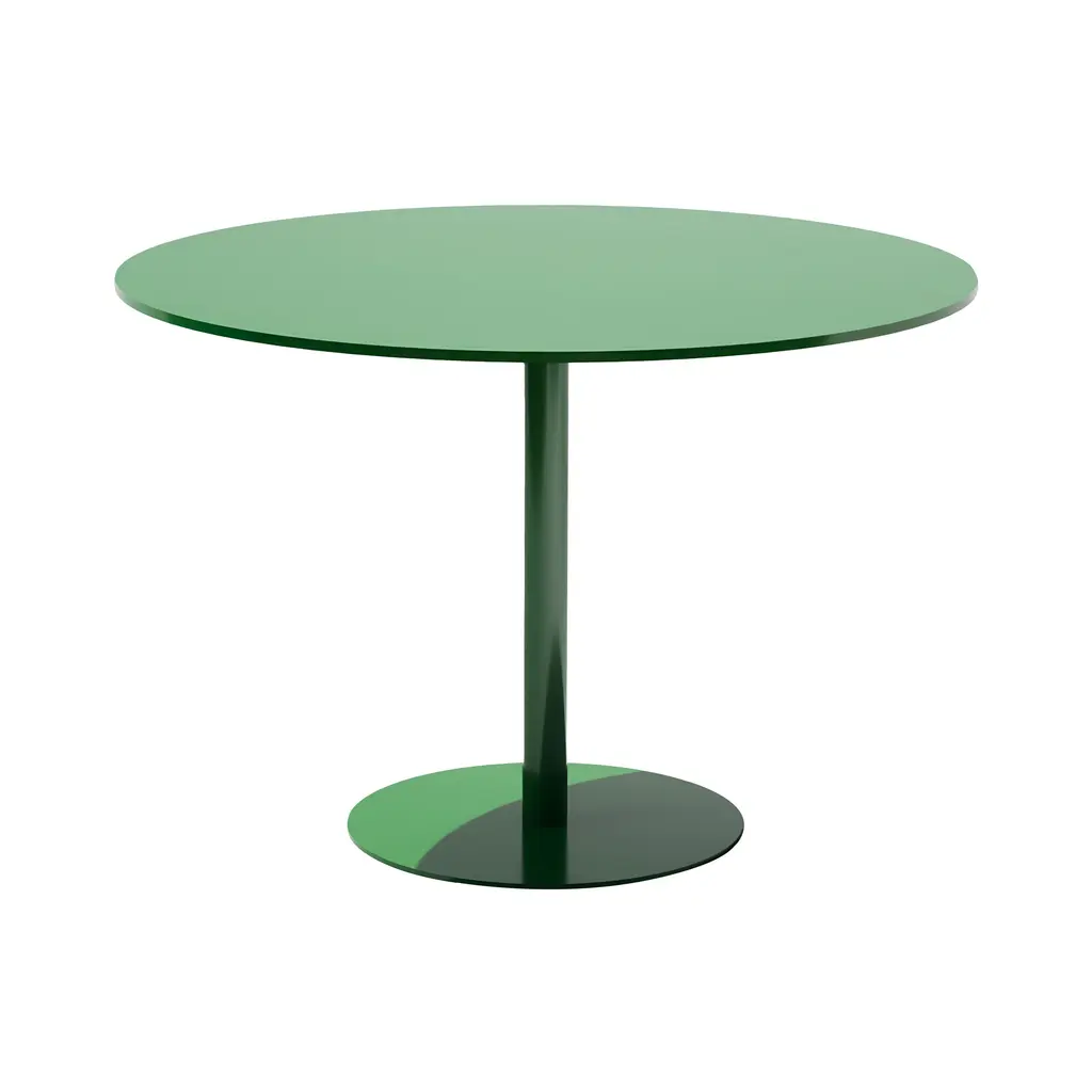This dining table features a round aluminum top and a sturdy powder-coated steel base, designed for both indoor and covered outdoor use. Its compact build makes it well-suited for restaurants and residential spaces. The table meets industry standards for safety and performance with ADA compliance and BIFMA certification. Plastic glides on the feet help protect floors from scratches. Available in 4 colors and 2 sizes.