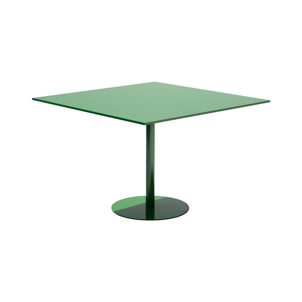 This dining table is suitable for indoor and covered outdoor use, featuring a sturdy aluminum top that withstands weather and daily wear. A powder-coated steel base provides stability, while plastic glides help protect floors. It meets ADA and BIFMA standards for safety and performance.