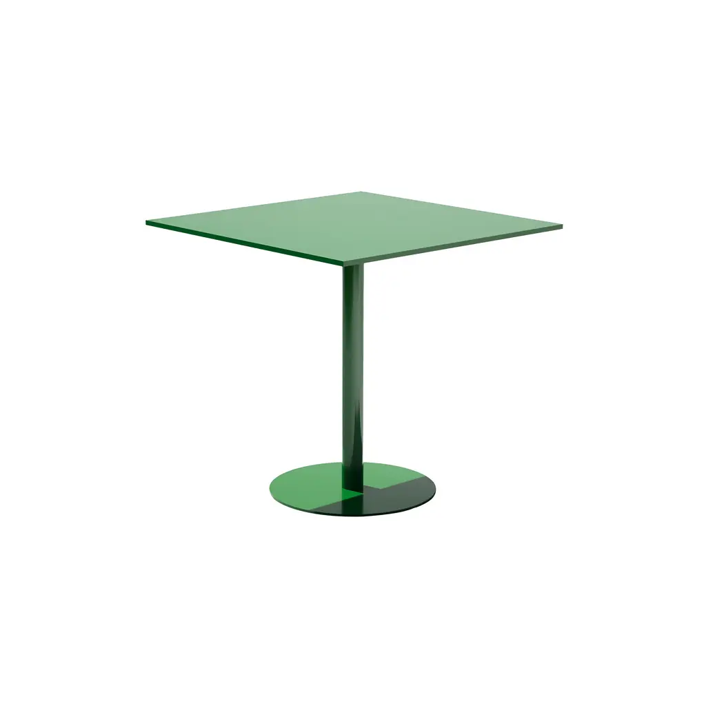 This dining table is suitable for indoor and covered outdoor use, featuring a sturdy aluminum top that withstands weather and daily wear. A powder-coated steel base provides stability, while plastic glides help protect floors. It meets ADA and BIFMA standards for safety and performance.