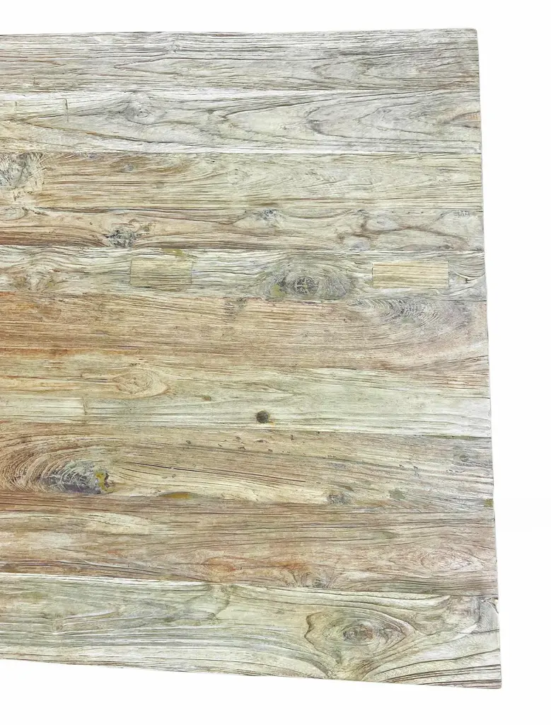Salvaged teak wood dining table perfect for outdoor or indoor use. Natural raw finish. Each table will have variations in natural tones, grain, and characteristic imperfections. Teak will naturally weather to silver/gray patina over time if left untreated and exposed to outdoor elements.