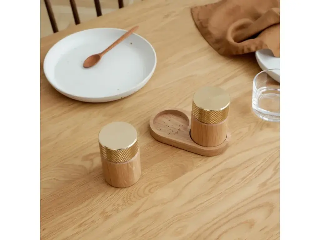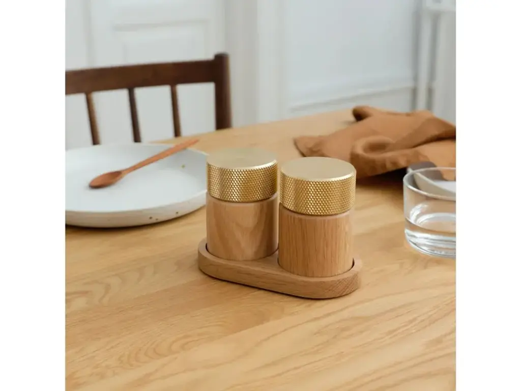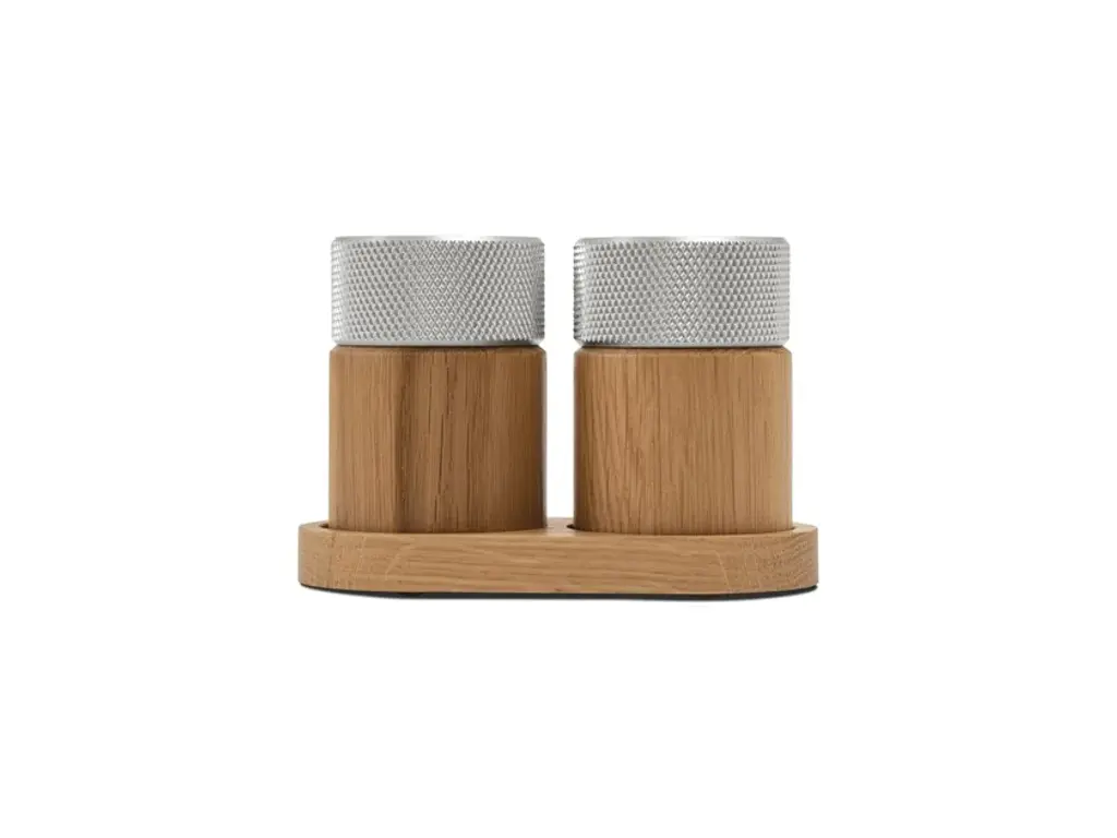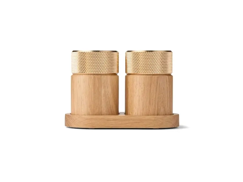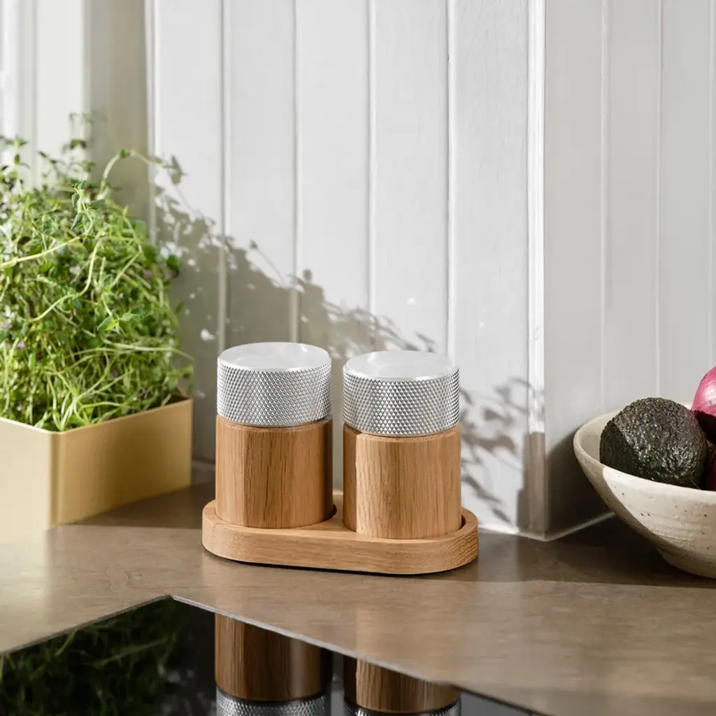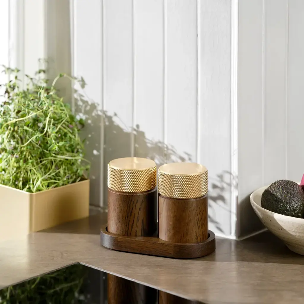 Sina is a salt and pepper grinder set created for those who appreciate both function and aesthetics. With its cylindrical base in solid wood and a turned metal top, the design balances the natural with the industrial in perfect harmony. The ridged metal surface ensures a comfortable and secure grip, while the ceramic grinding mechanism from CrushGrind® guarantees a smooth and precise grind – whether you prefer finely or coarsely ground spices. SINA is not just a tool for cooking but also a beautiful element for the dining table. The two grinders come with an elegant tray that not only presents the set in the best possible way but also helps keep the table free from spice residue. Discreet markings on each grinder indicate which one is for salt, and which is for pepper. SINA is available in two stylish material combinations: dark ash with a brass top and oak with an aluminum top. The set is the first product in the new SINA kitchen series, designed by C.F. Møller Architects for Gejst, marking the beginning of a new kitchen collection where fine craftsmanship and functional design go hand in hand.