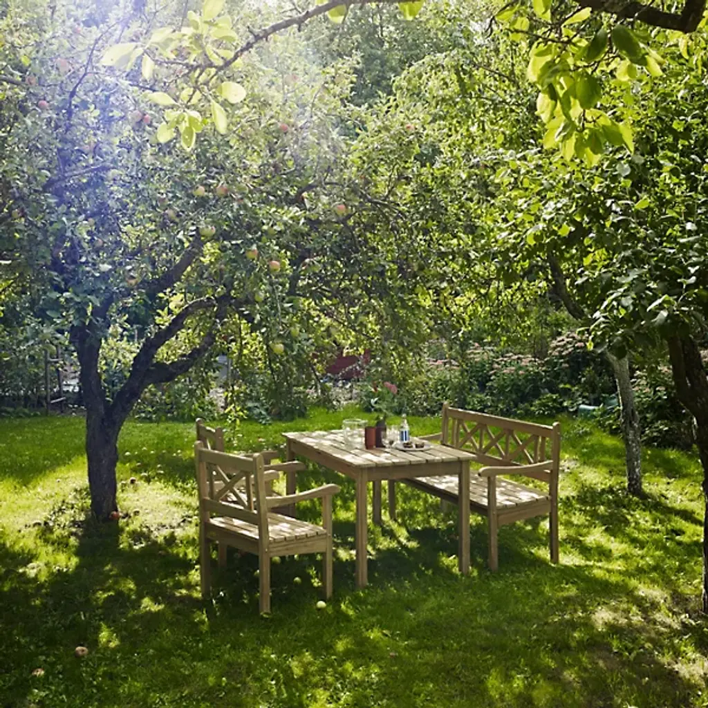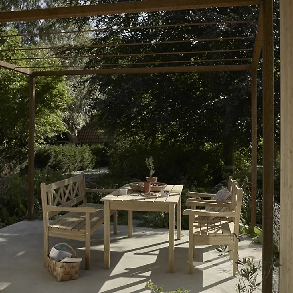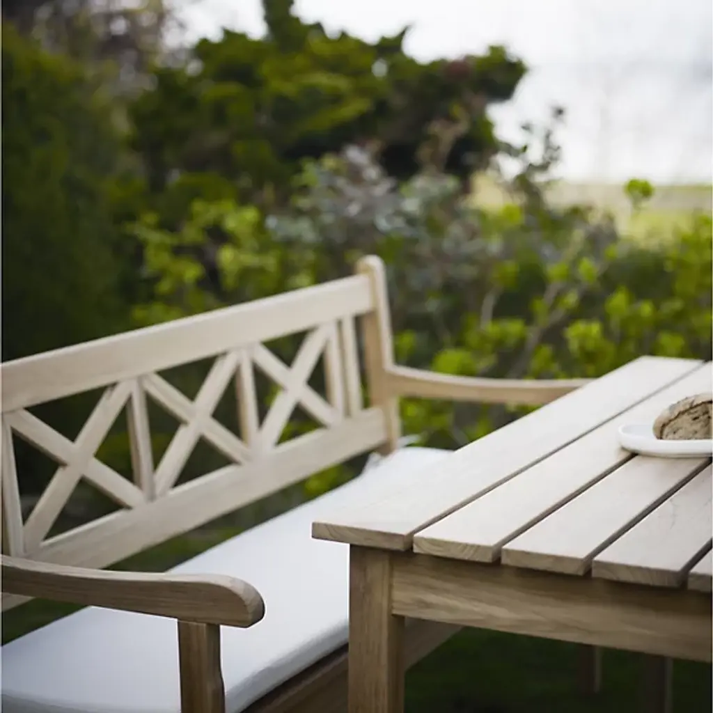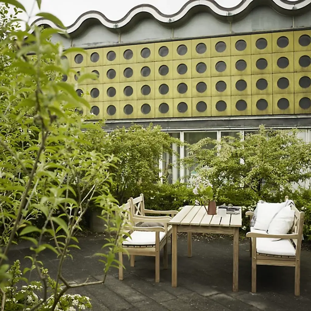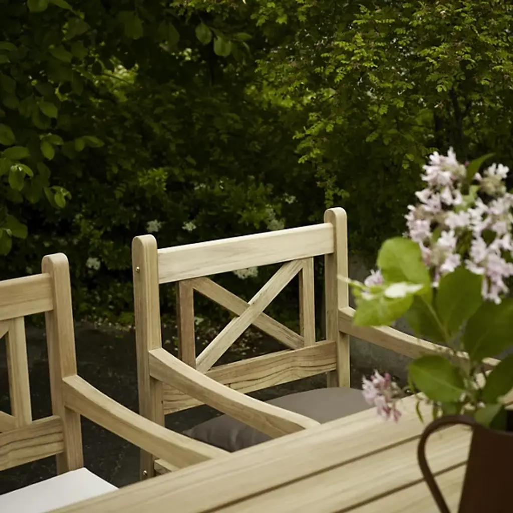 Provide a bold, rustic appeal to outdoor gathering spaces with the Skagen Dining Table from Fritz Hansen. A subtle Mogens Holmriis design with a memorable mix of clean, contemporary lines and Scandinavian simplicity. This vibrant construction of teak wood is sourced from Vietnam; it rises along four blocky legs, securing long slats across the upper surface to provide a steady, sturdy tabletop. The gaps between each slat allow rainwater to run through, while the unique nature of the teak material ensures it will last through rain and sun, producing a unique silvery patina through use.